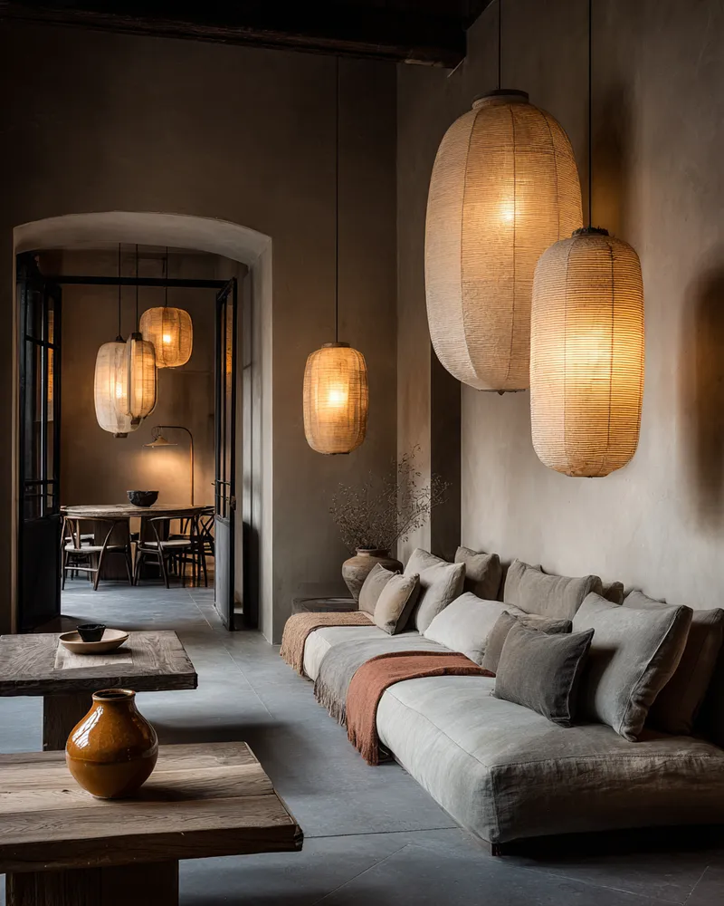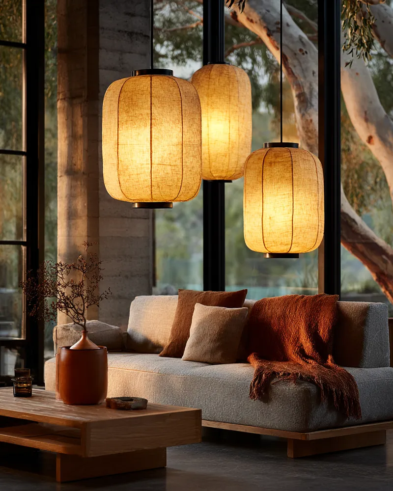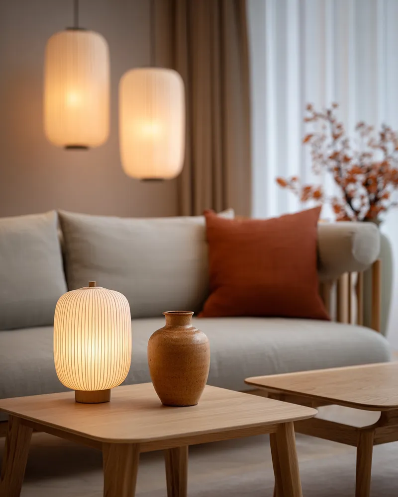 * **Natural Materials:** Wood (especially light oak and walnut), bamboo, rattan, paper, and natural stone are key.