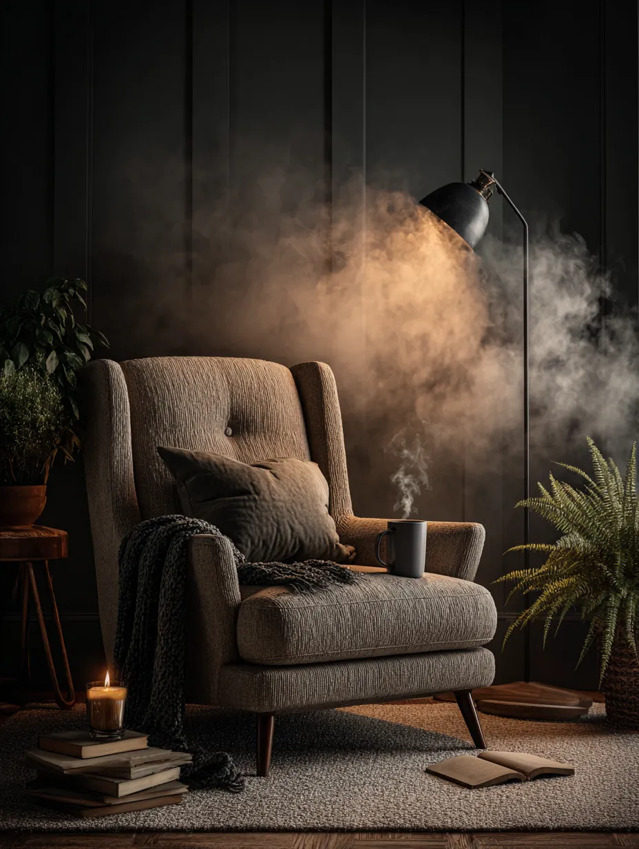 * **Comfy Chair:** A deep, upholstered armchair in a neutral tone, or a minimalist floor cushion.