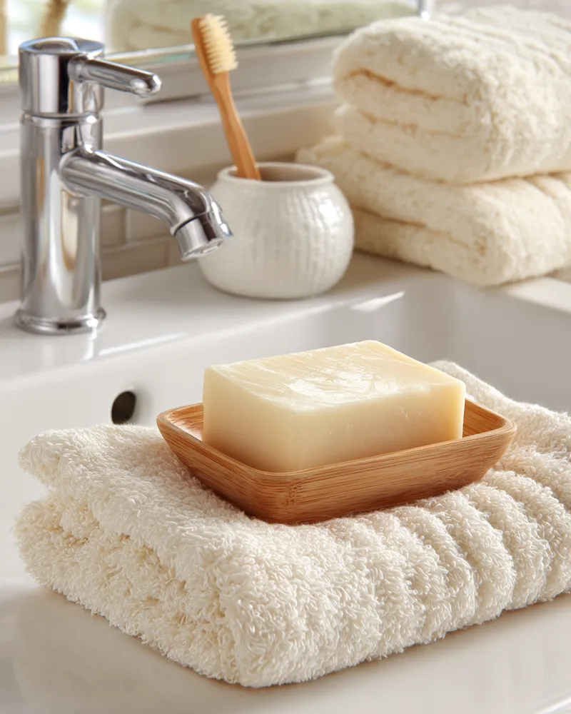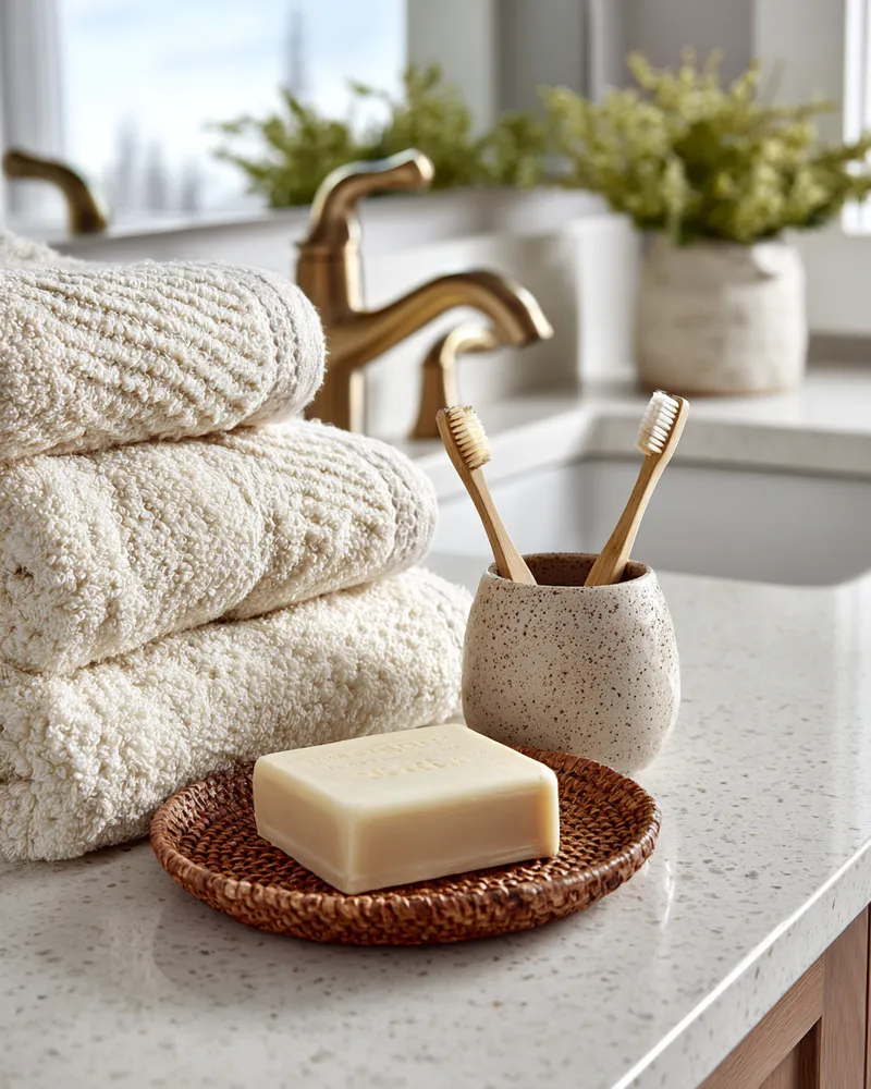 2. **Natural Materials:** Use bamboo shelving, wooden accents, or stone-look tiles.