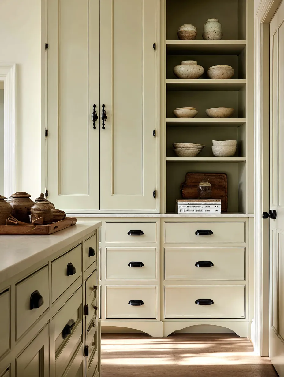Achieving that elegant farmhouse kitchen feel often means embracing a 'less is more' approach to cabinet styling. It’s about curated beauty and functionality. 🤍 My philosophy: * **Focus on Quality Hardware:** Matte black or brushed brass pulls make a statement. * **Minimal Knick-Knacks:** Let the cabinetry shine. * **Strategic Open Shelving:** Display a few cherished ceramic pieces or cookbooks. Clean lines and thoughtful touches are key. Save for your cabinet inspiration! 🌿