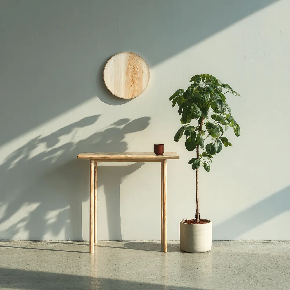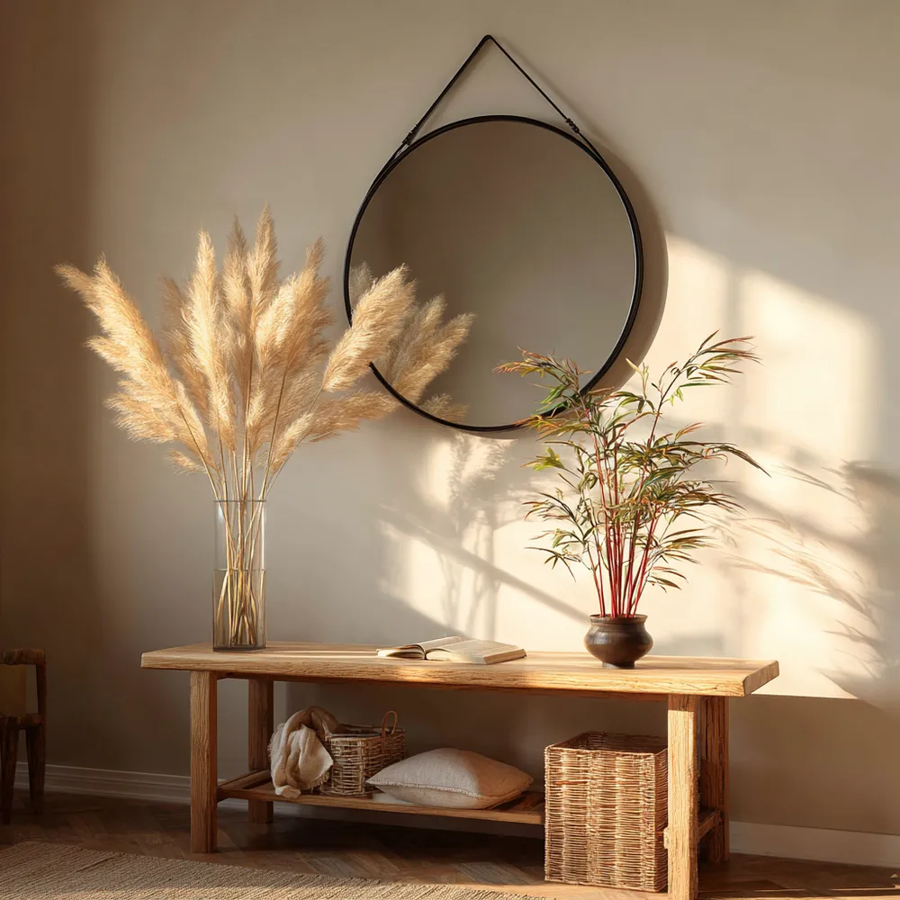 * **Natural Wood Console:** Slim and functional with organic textures.