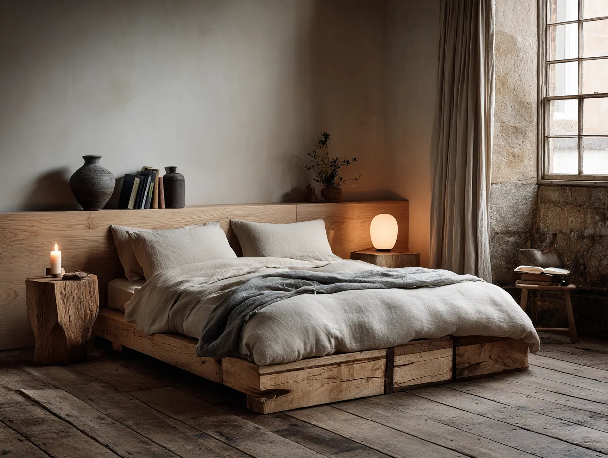* **Low-Profile Bed Frame:** Natural wood, creating a grounded feel.