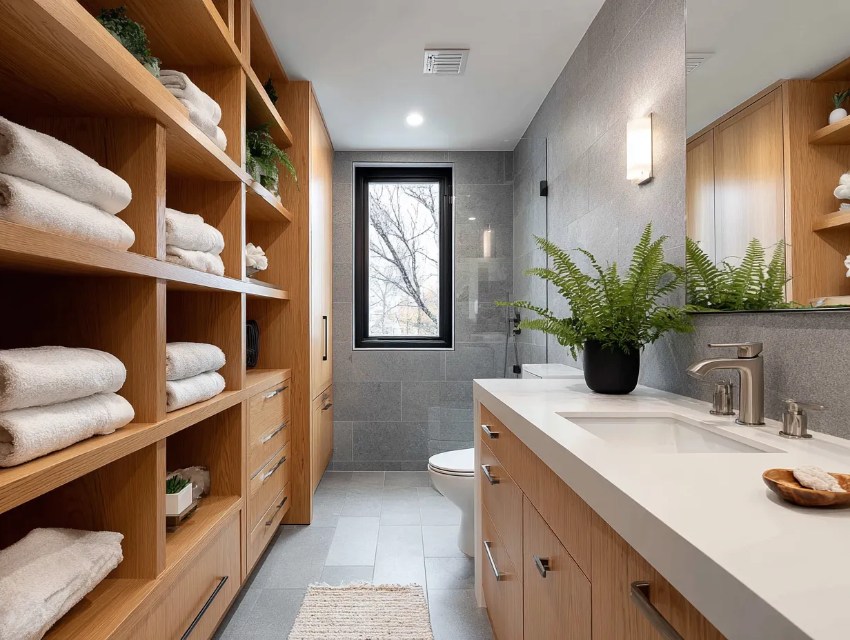 * **Natural Wood Vanity:** Clean lines, warm wood tones.