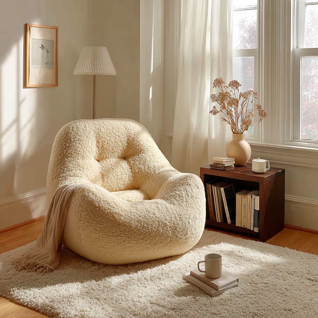 Start with a super comfy armchair or a floor cushion piled high with soft textiles. Add a warm-toned rug underfoot and strategically placed ambient lighting โ think a soft floor lamp or string lights.