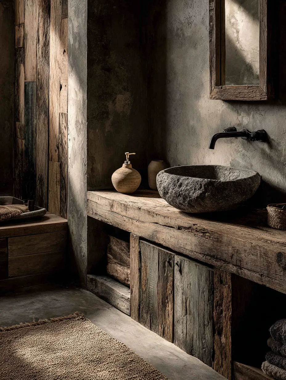 Create a bathroom retreat that embodies the Wabi-Sabi spirit of finding beauty in imperfection. Focus on natural materials that can withstand moisture and age gracefully: consider a vanity made from untreated wood, stone tiles with organic textures, or brushed metal accents. The color palette should be serene and grounding, with earthy tones, muted grays, and soft whites.