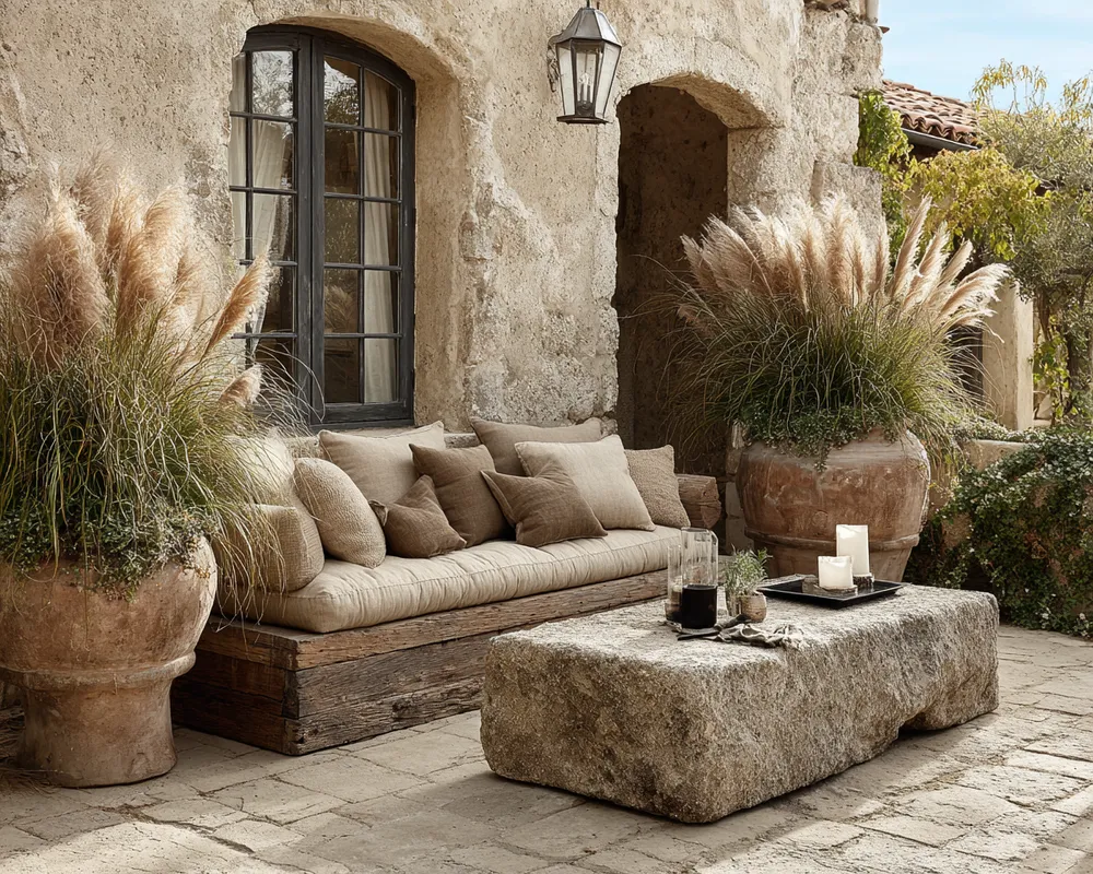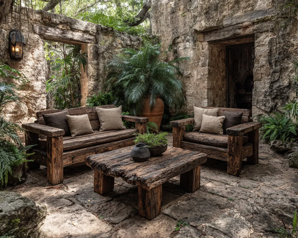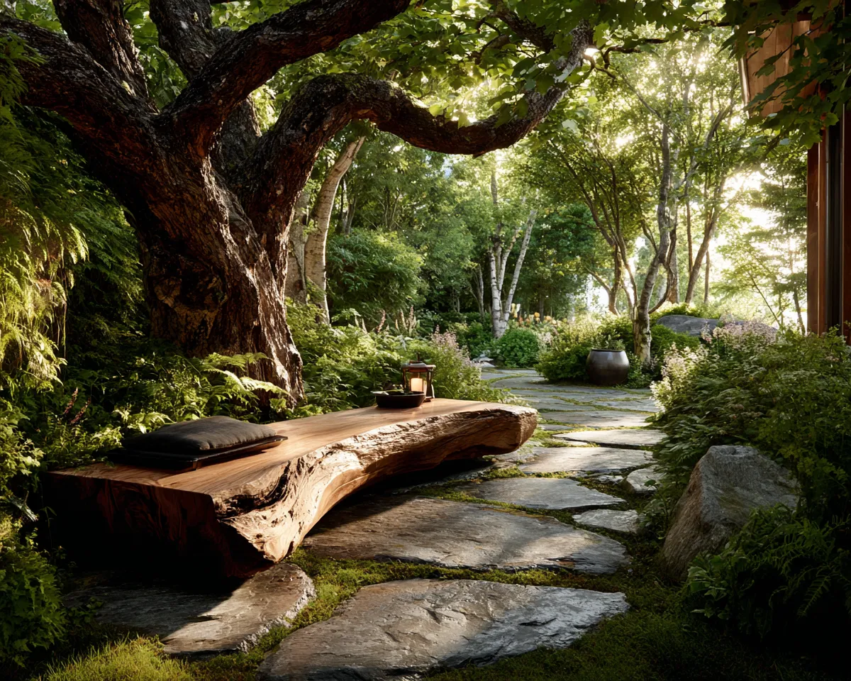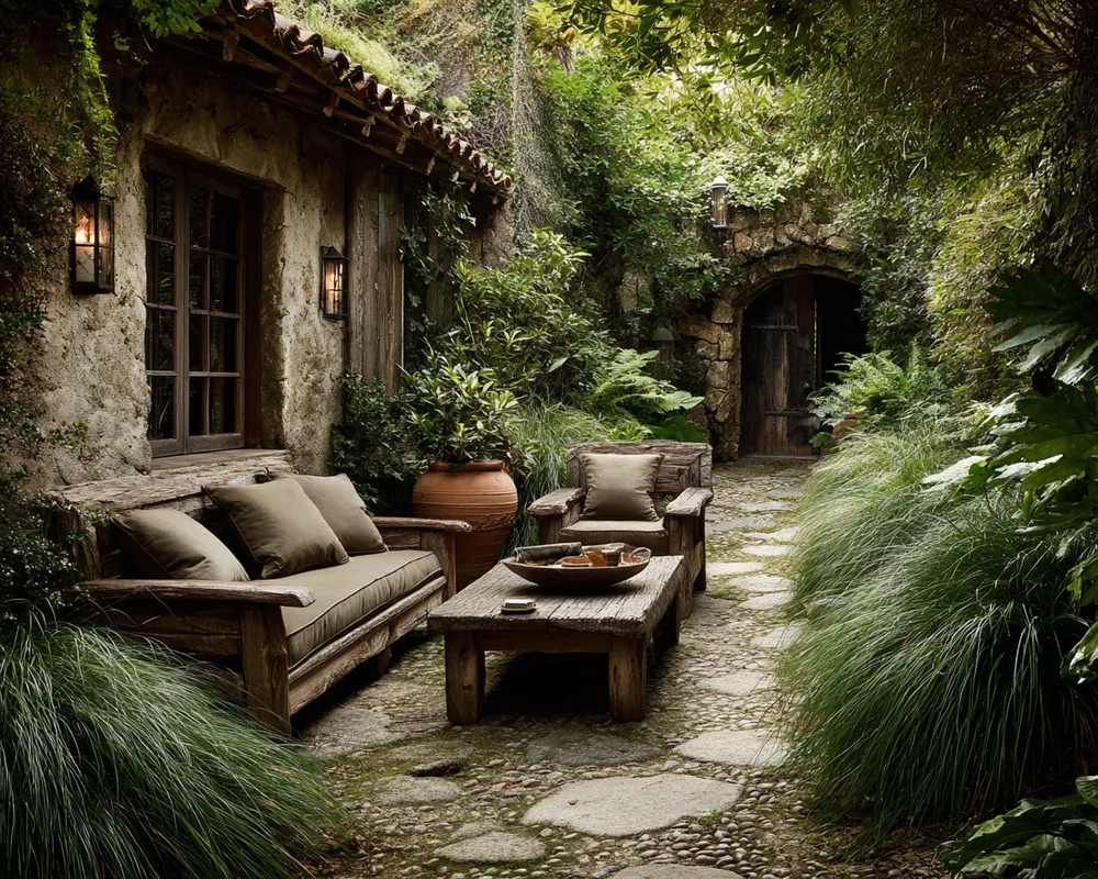 Extend the beauty of Wabi-Sabi to your outdoor areas, celebrating nature's raw elegance and the gentle passage of time. Think about weathered wood benches or tables that show the signs of sun and rain. Incorporate natural elements like irregular stone paths, moss-covered accents, or plants that grow in a more natural, untamed way.