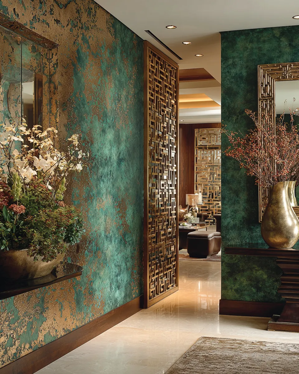 * **Metallic Accents:** A painted stripe, a feature wall with metallic flecks, or ornate gold paneling.