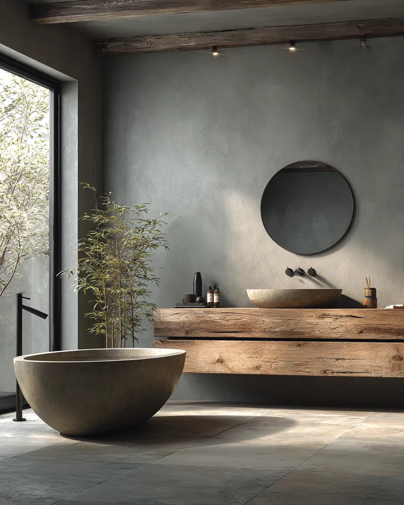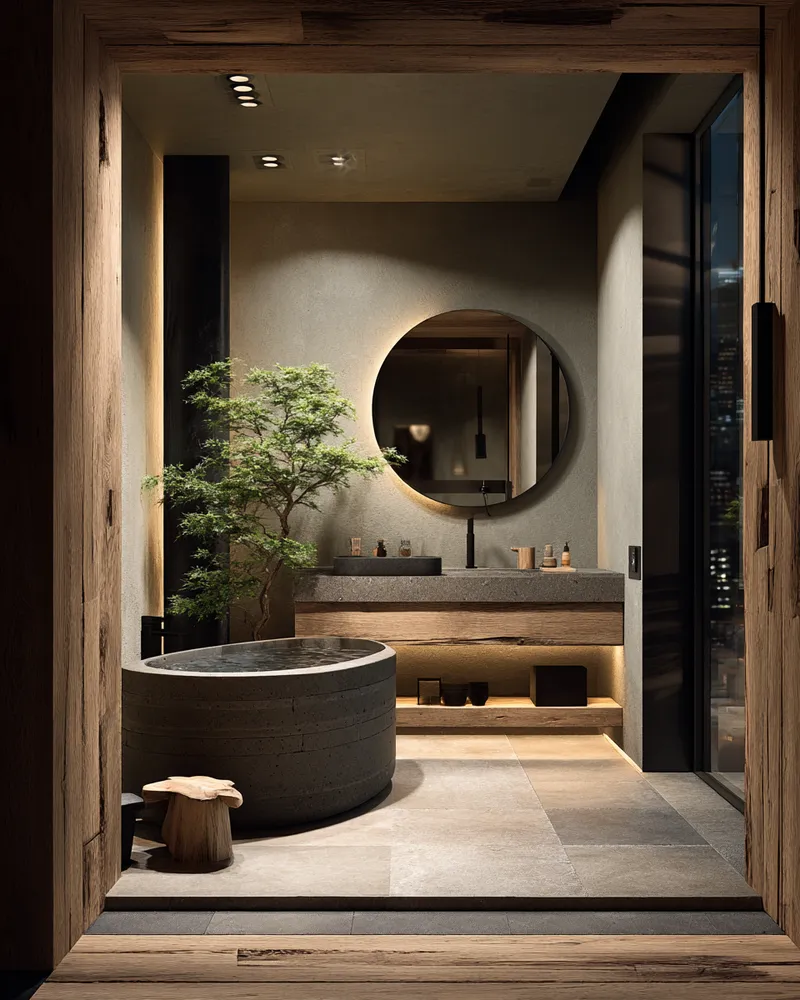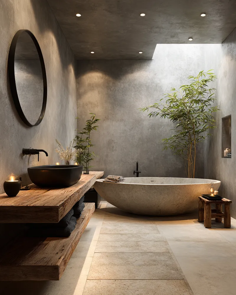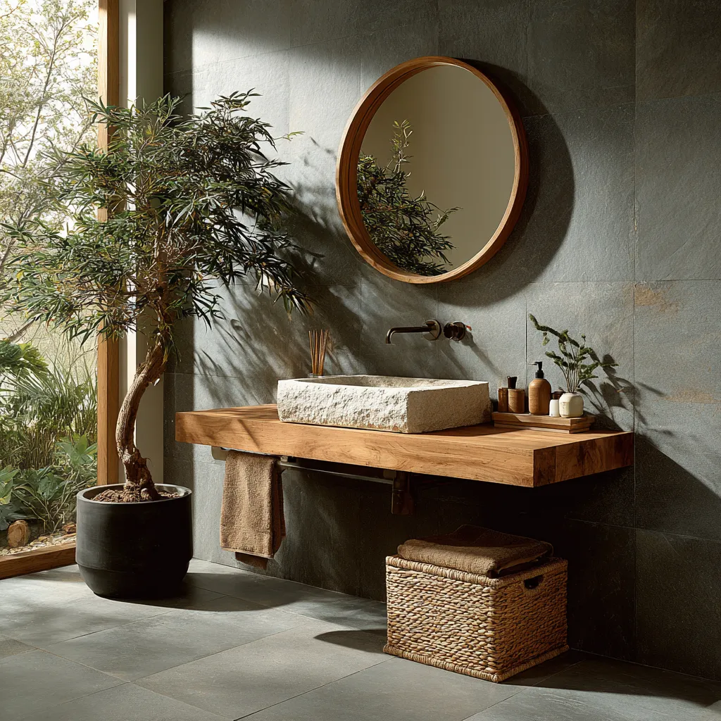 Focus on natural materials: light wood vanities, bamboo accents, and stone-like tiles. The color palette should be calming โ think muted earth tones, soft whites, and natural greys.