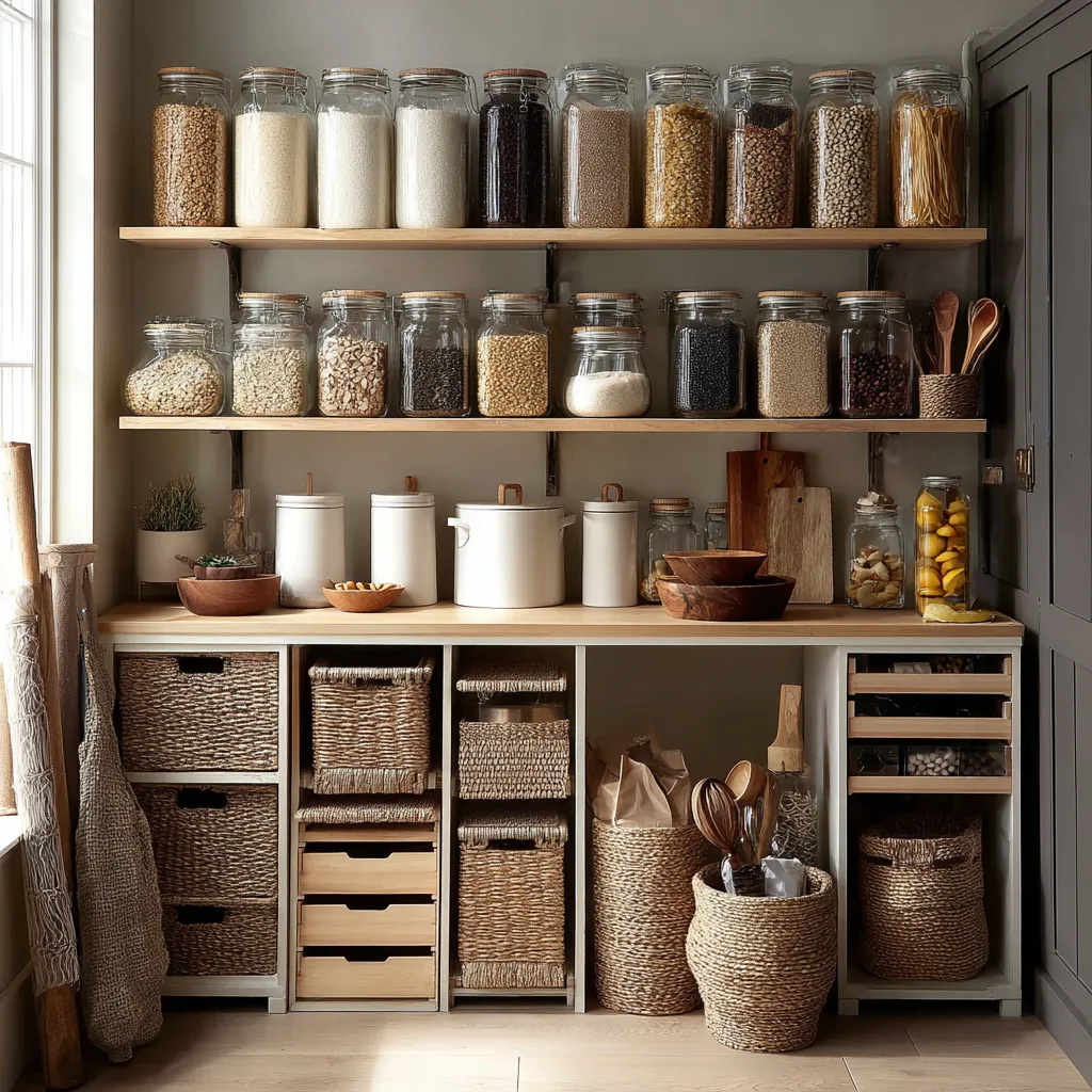 Opt for clear glass jars with airtight lids for dry goods – they look beautiful and keep food fresh.