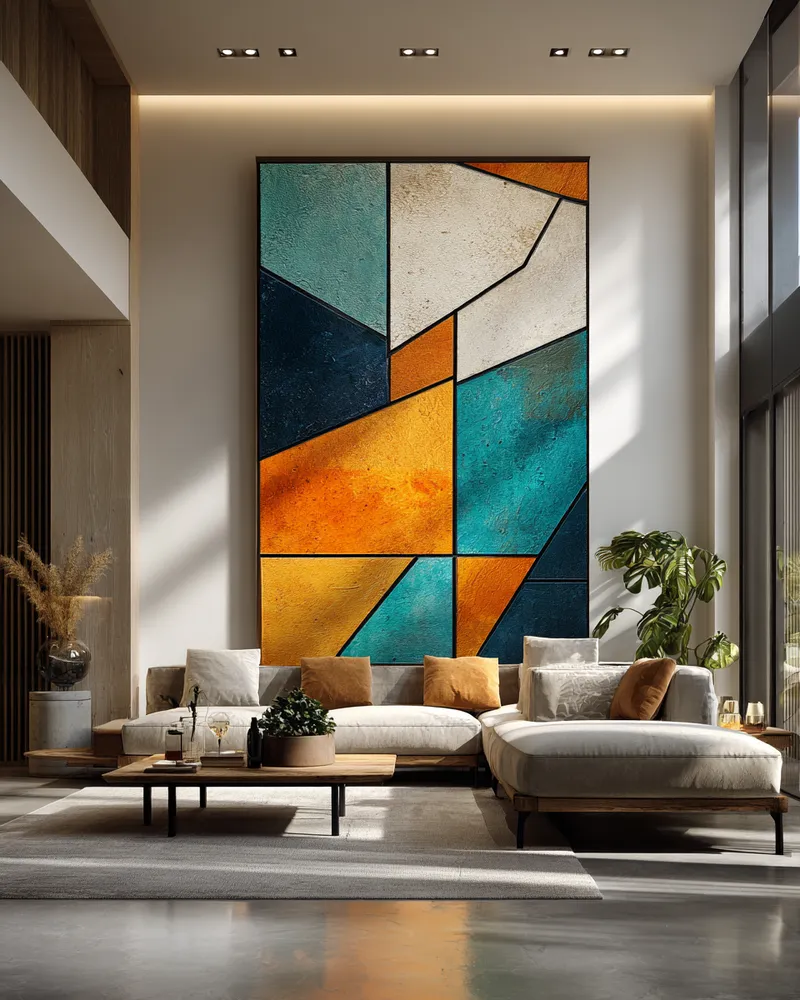 * **Integrated Seating:** Design built-in, angular seating that perfectly fits a corner, creating a cozy, integrated nook with a strong geometric presence.