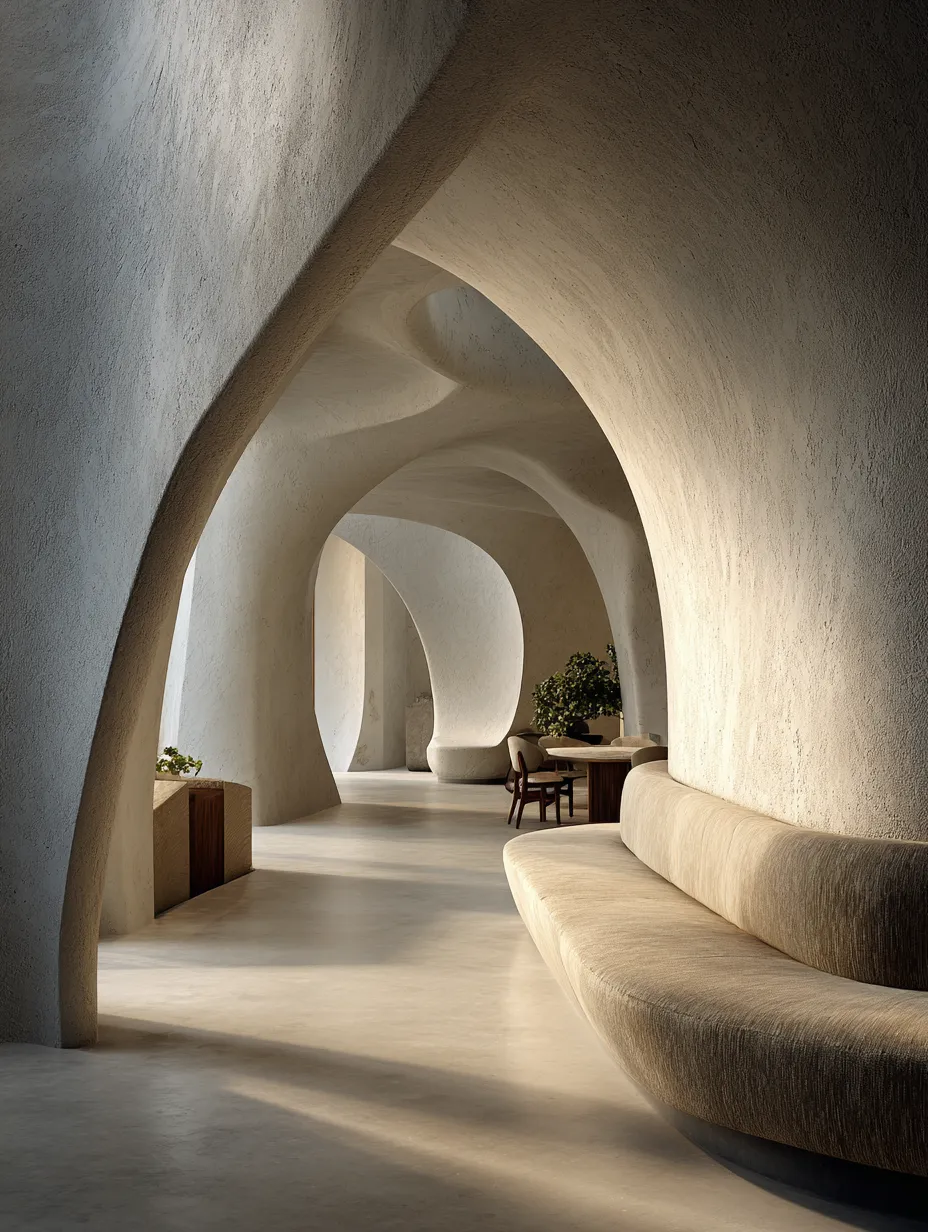 * **Integrated Seating/Benches:** Create built-in, gently curved seating that flows seamlessly from walls or floors, blurring the lines between architecture and furniture.
