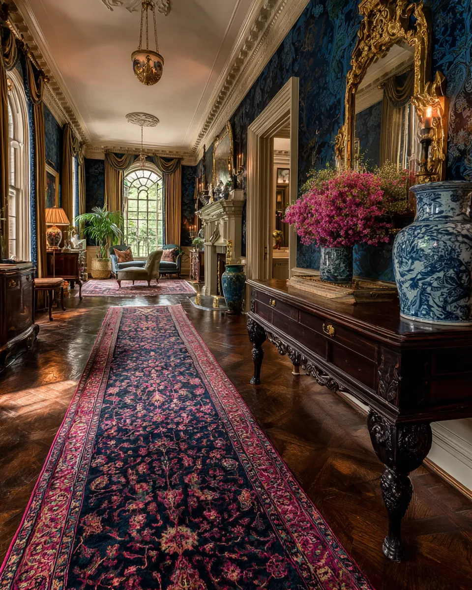 Imagine wallpaper with a subtle yet detailed damask or a striking chinoiserie design. Pair this with a patterned rug that adds depth and warmth underfoot. Accent pieces like a console table with ornate detailing or a mirror with a decorative frame can further enhance this rich, layered aesthetic. It's the details that make your entryway truly unforgettable.