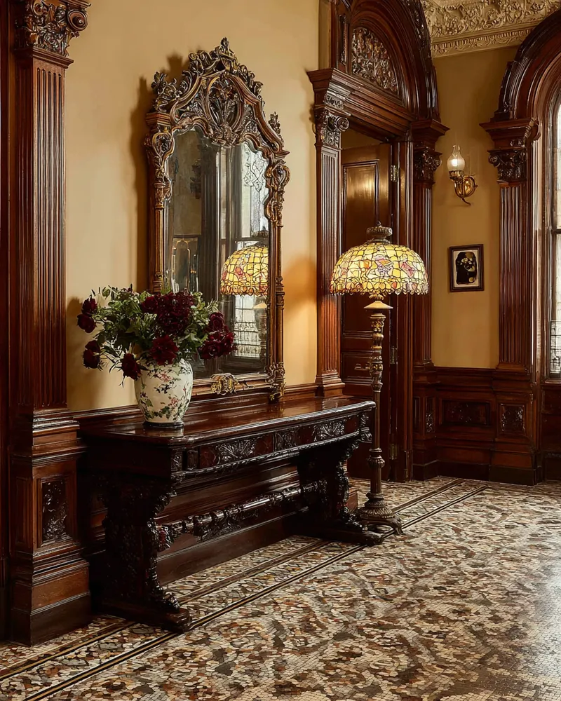 * **Rich Materials:** Stained glass, wrought iron, stained wood.
