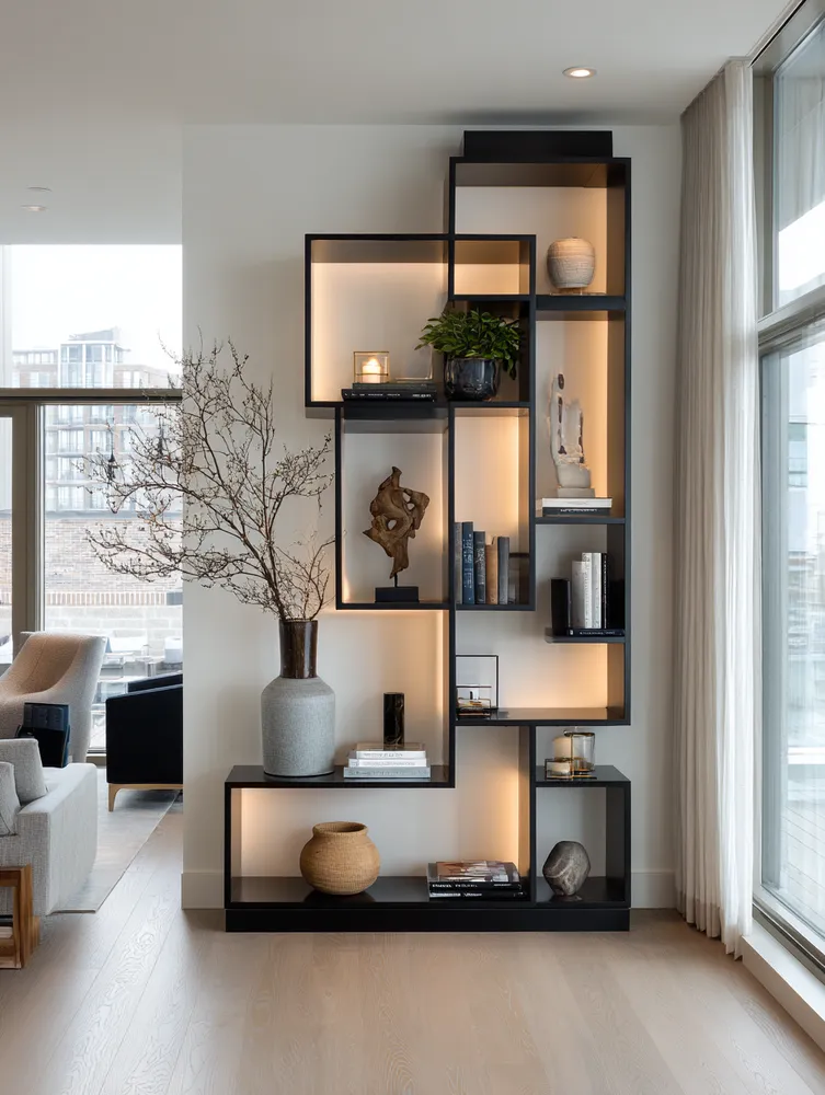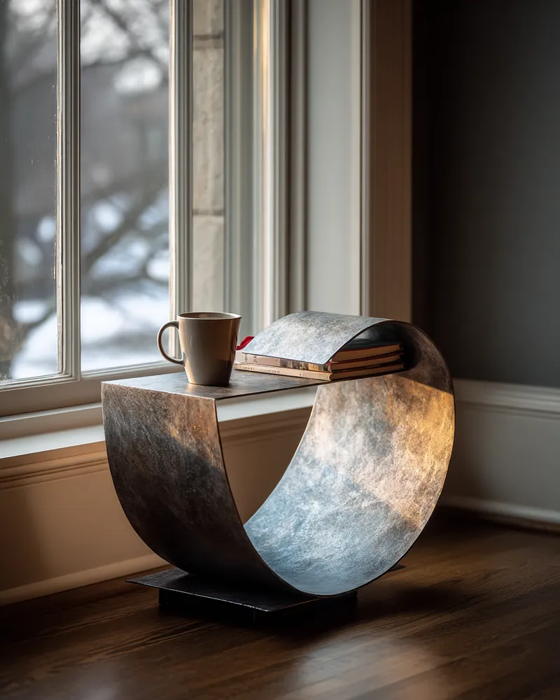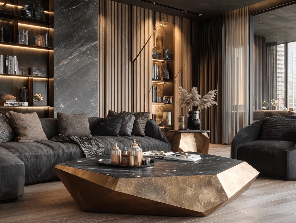💡 Think about sleek metal coffee tables with intricate bases, geometric shelving units, or striking floor lamps.