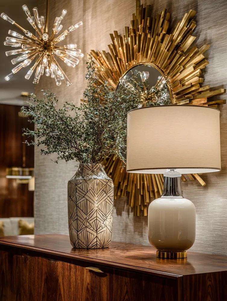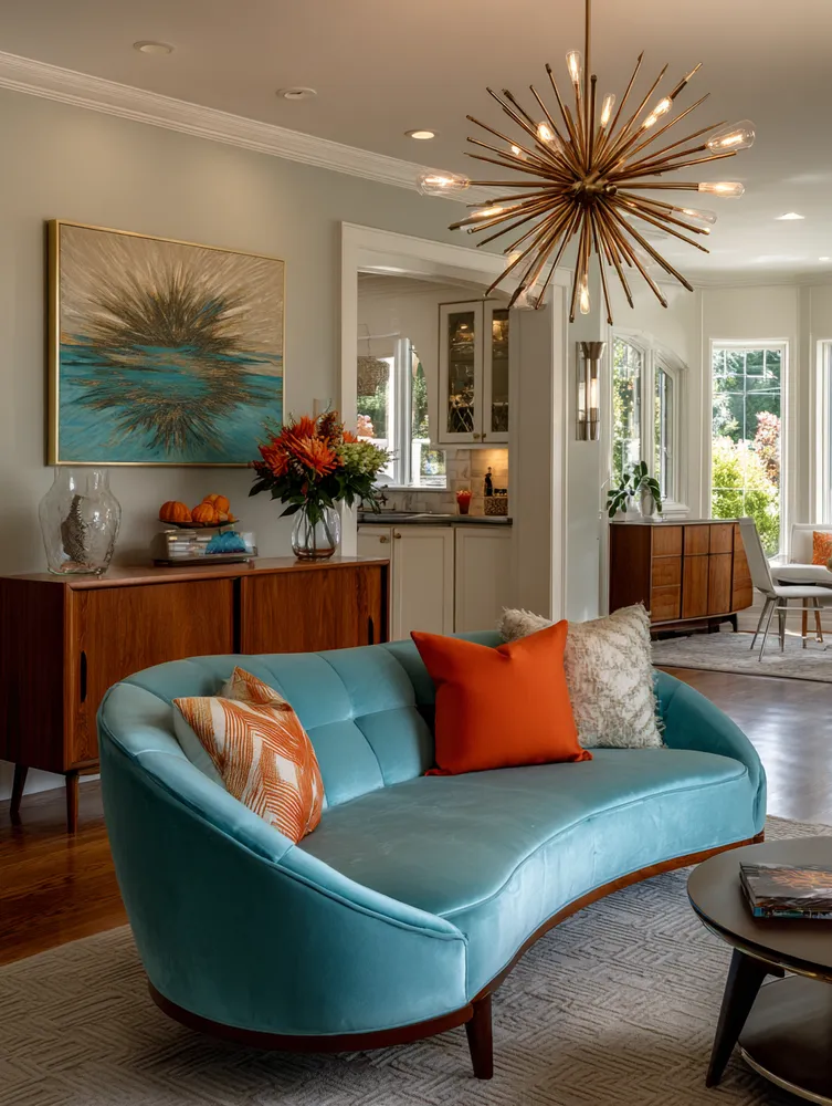 Think a statement starburst clock, a quirky Sputnik-inspired table lamp, or geometric throw pillows. Even a bold, rounded accent chair or a chrome-legged side table can make a big impact.