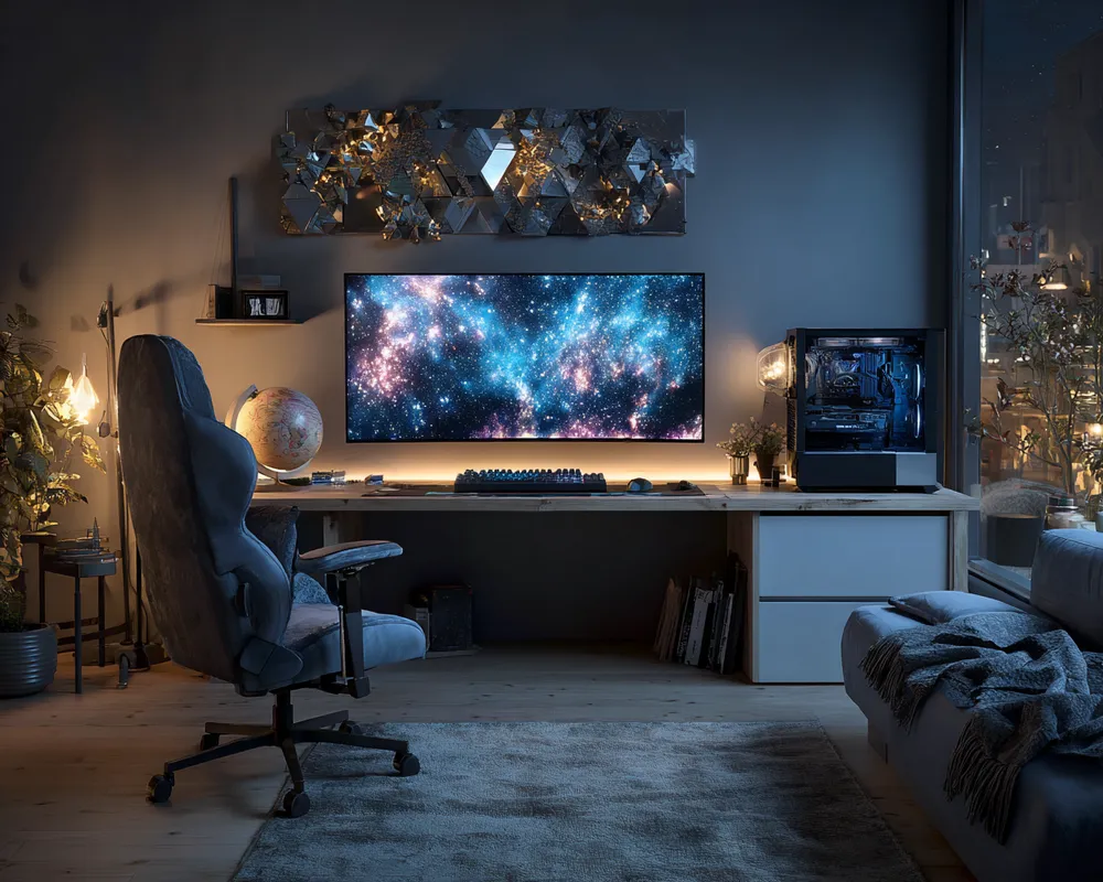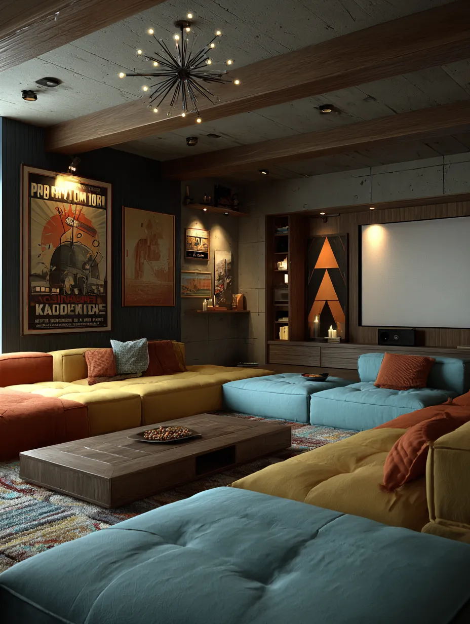 Consider Sputnik-inspired lighting for ambient glow, and perhaps a vintage-style popcorn machine or a framed retro movie poster as decor. It's about creating a fun, stylish space for movie nights.