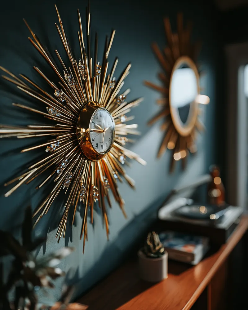 Incorporate a statement feature wall with geometric patterns or wood paneling. Comfortable, low-slined seating in bold colors like mustard yellow or teal is key.