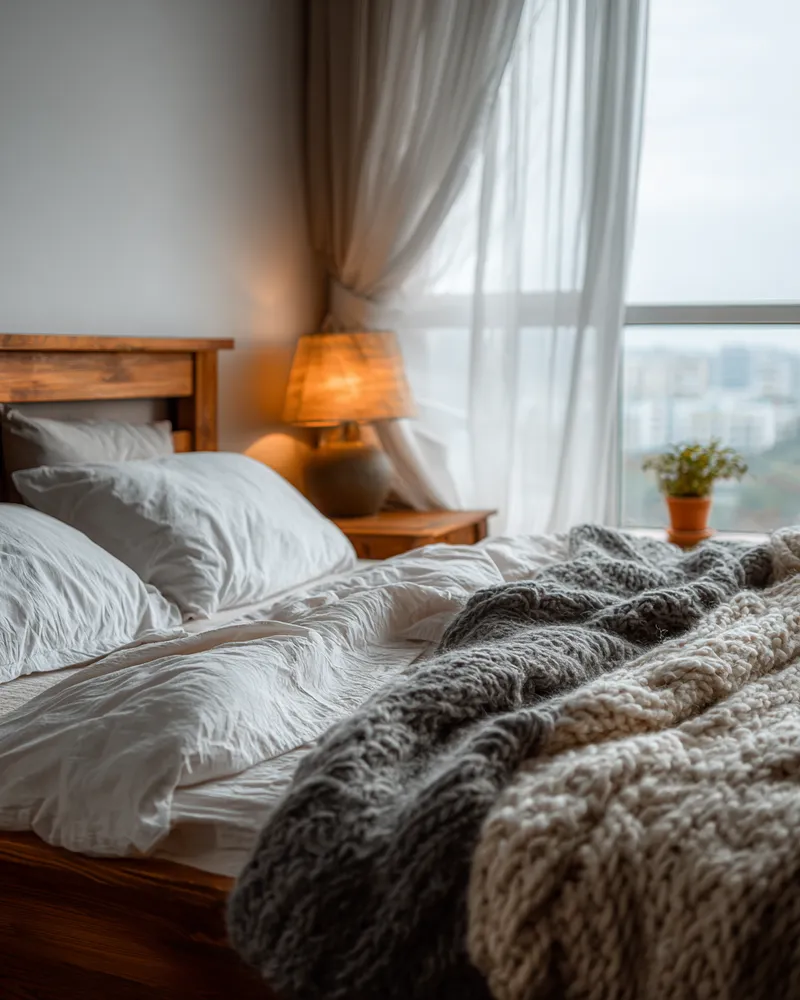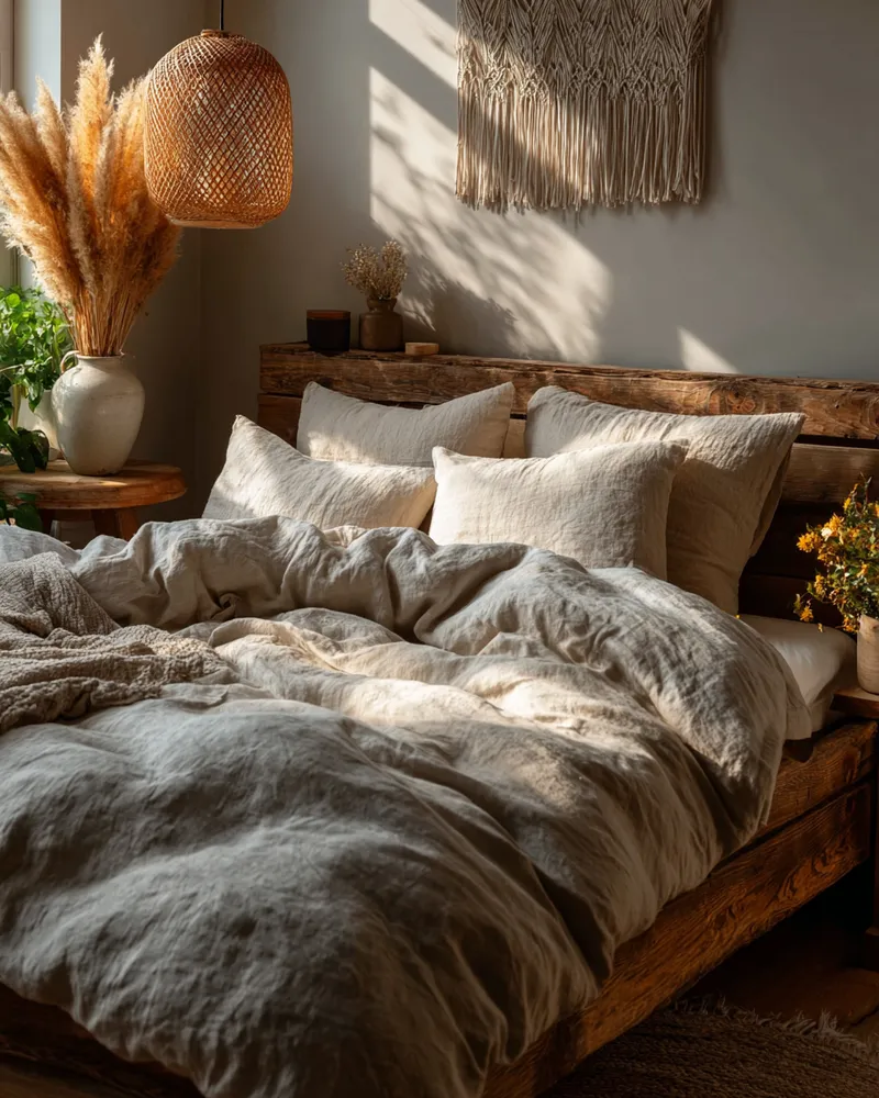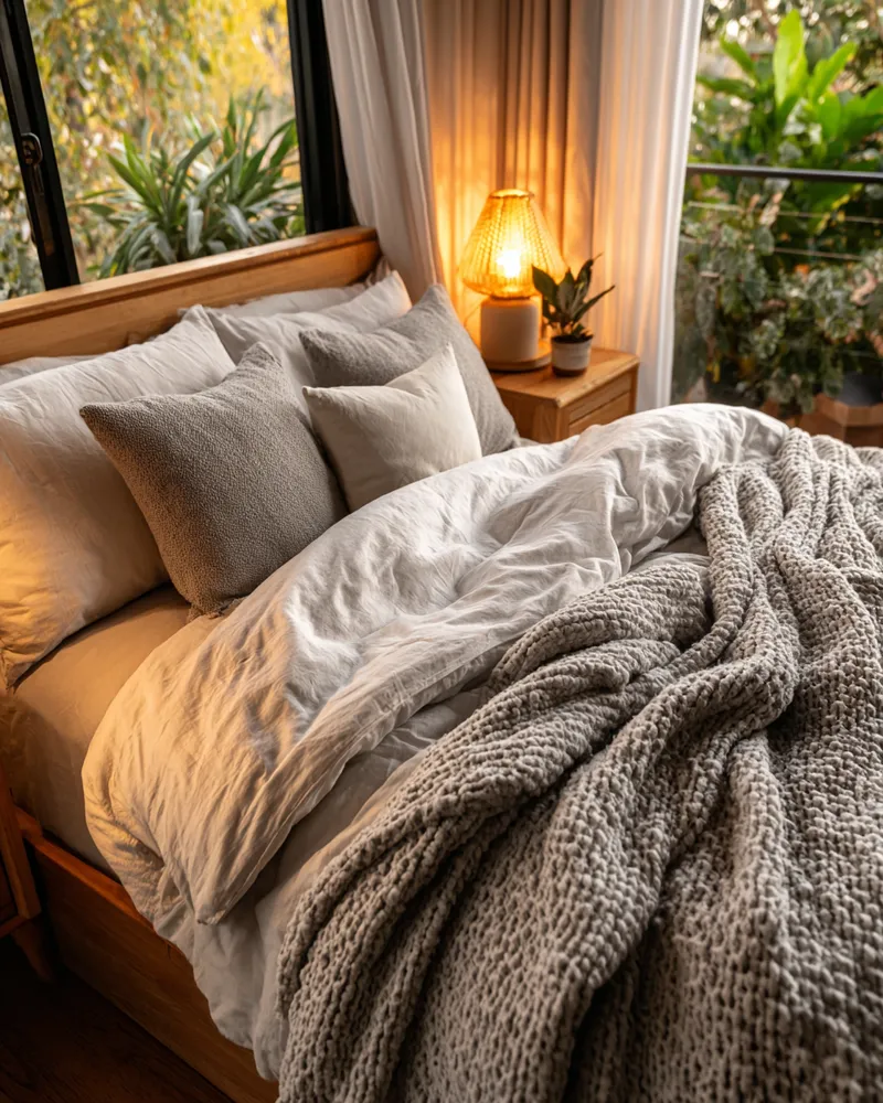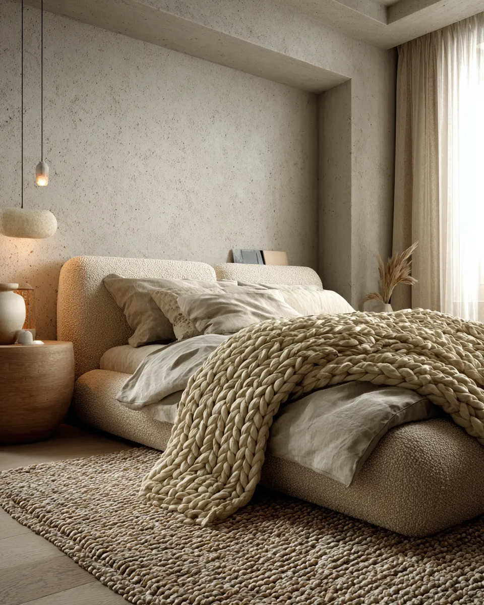 * **Textured Layers:** Think linen bedding, a chunky knit throw, and a plush rug.