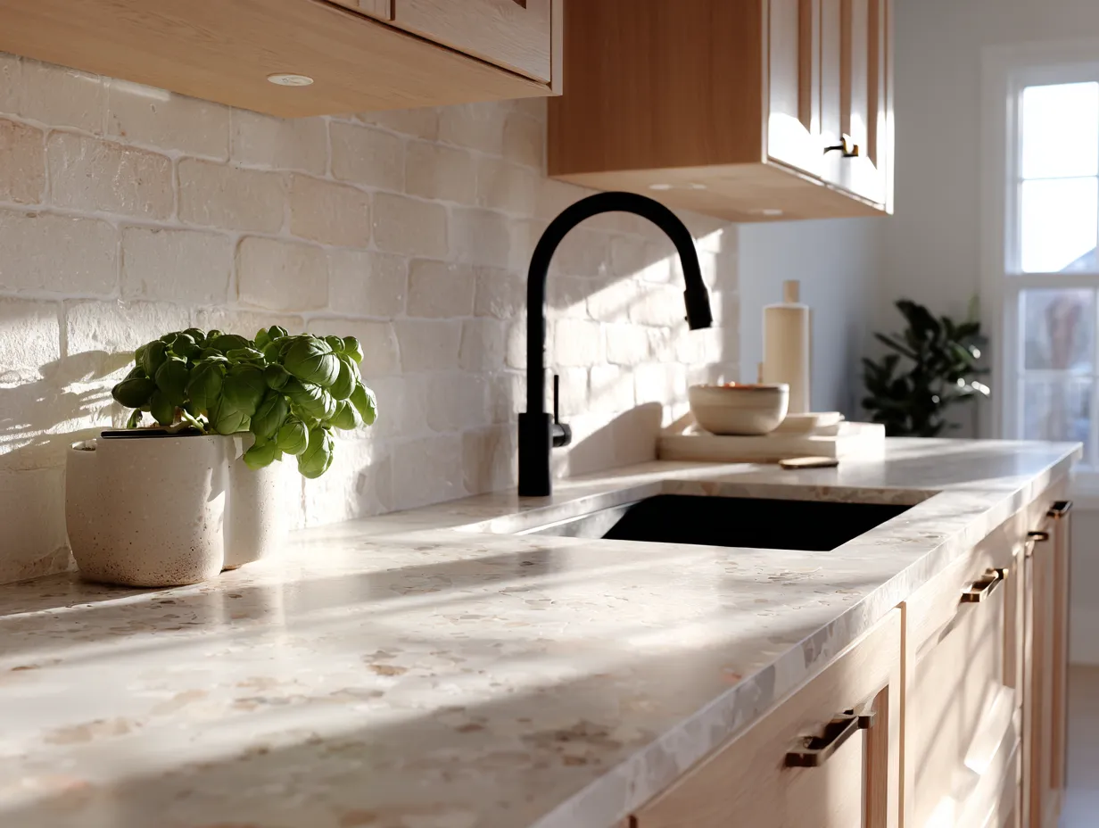 * **Stone Countertops:** Marble or quartz with soft veining creates a natural flow.