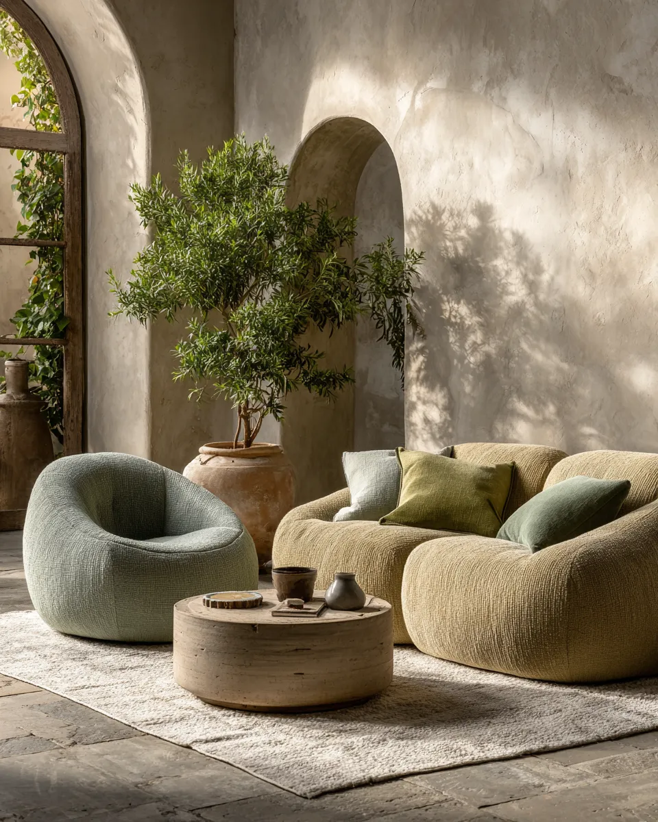 * **Sculptural Furniture:** Sofas and chairs with soft, rounded silhouettes.