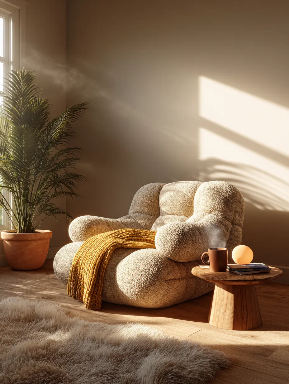 * **Soft Textiles:** Plush throws, layered rugs, and cozy cushions.