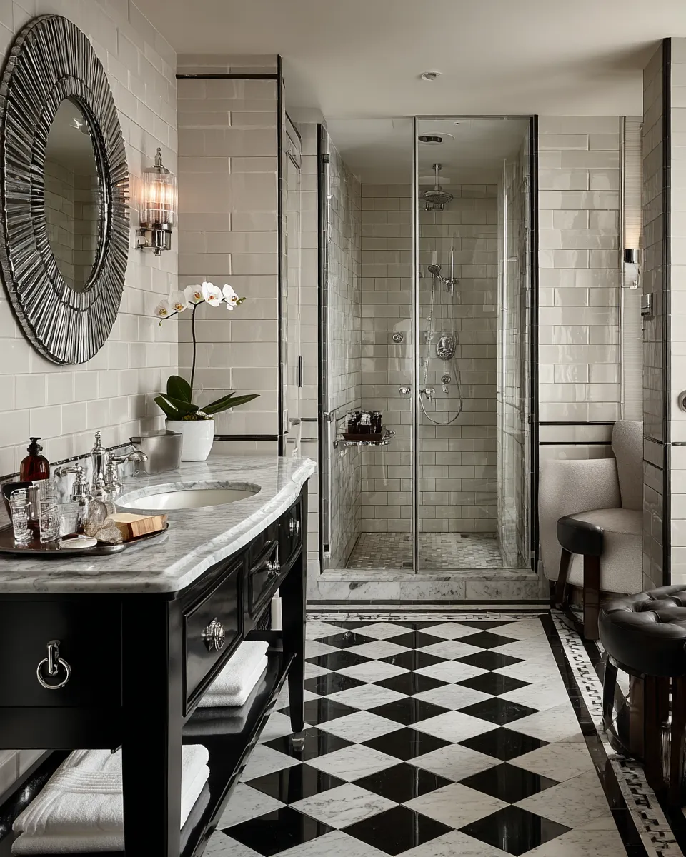 Art Deco Glamour: Geometric Lines & Luxurious Textures for a Statement Bathroom 💎🖤