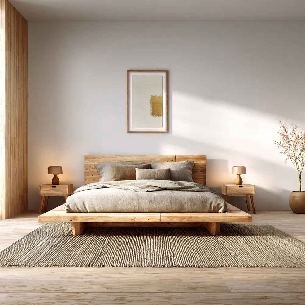 * **Light Wood Tones:** Think pale ash, light oak, or birch for your bed frame and side tables.