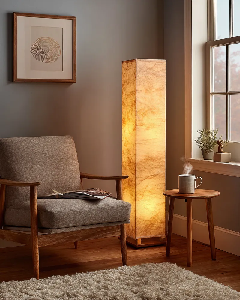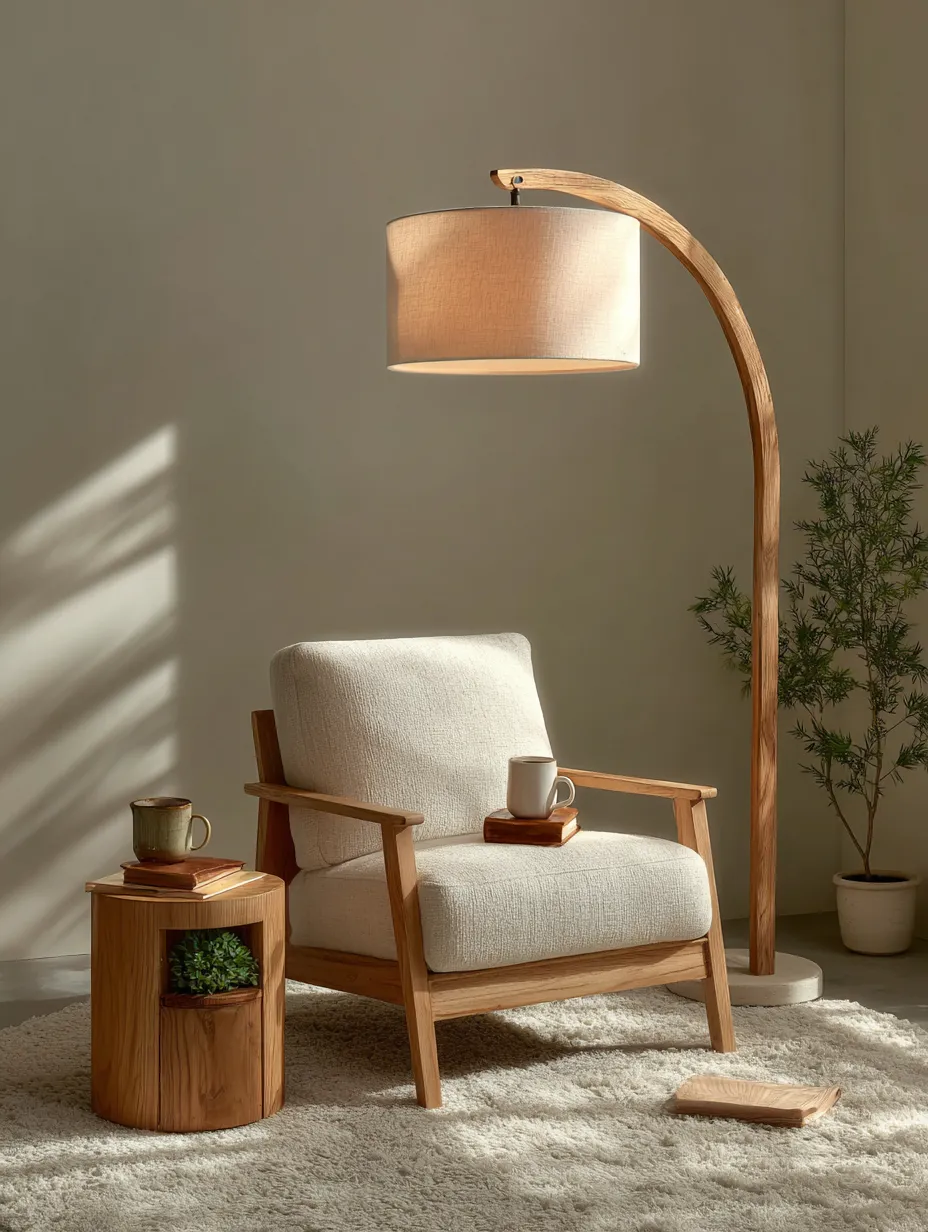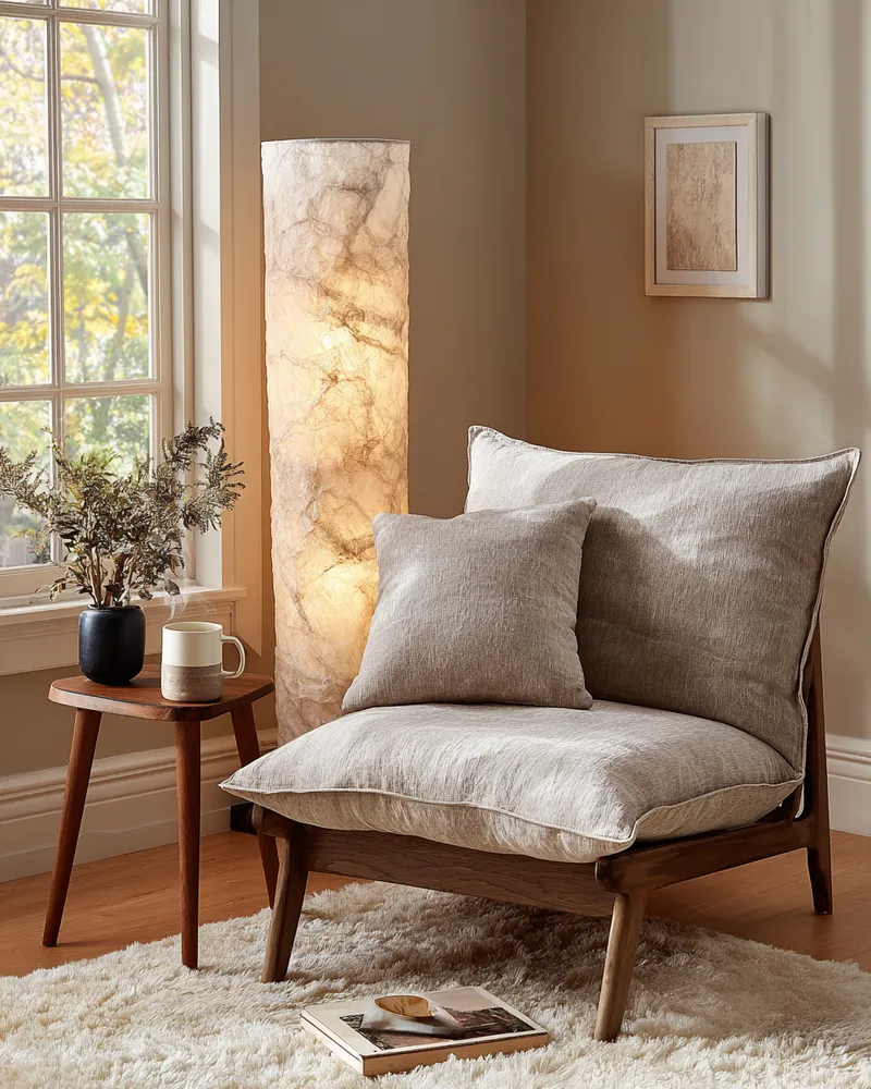 * **Soft Lighting:** A floor lamp with a warm, diffused light and a simple, organic shade.