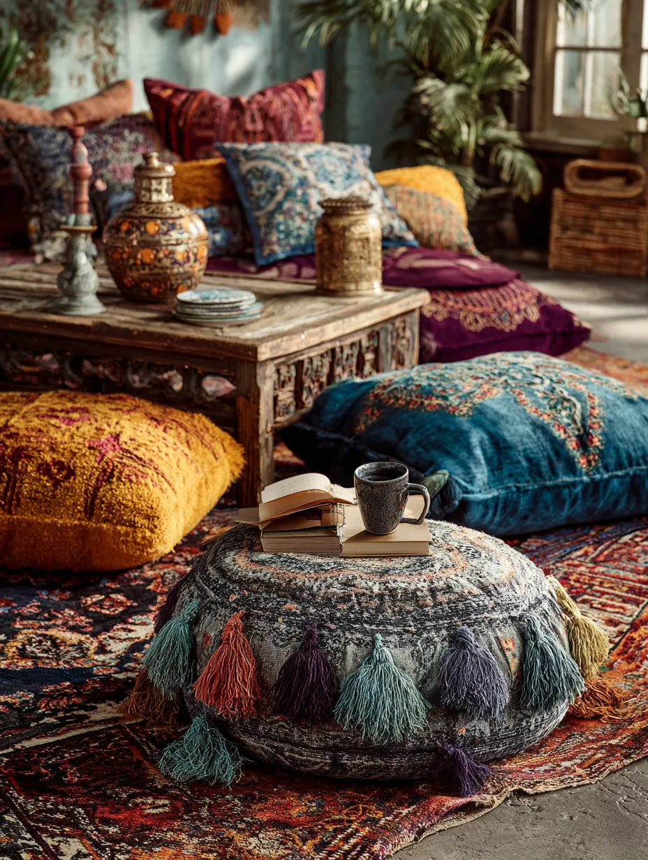 Creating inviting corners is a bohemian essential. My favorite way to add comfort and personality? Floor pillows and vibrant rugs! They instantly make a space feel more relaxed and grounded.