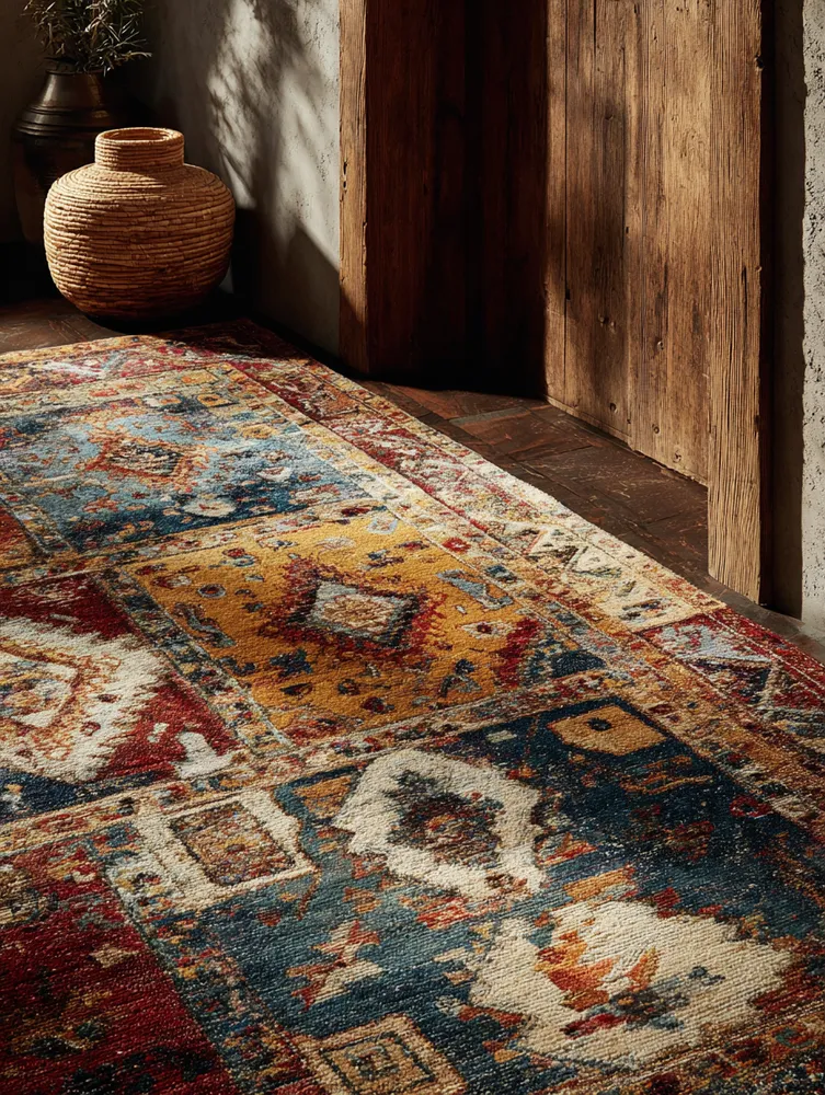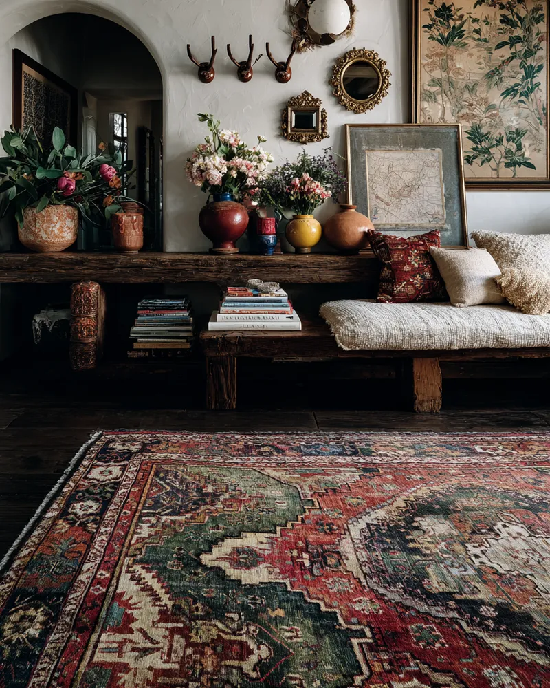 Creating an inviting and soulful entryway sets the tone for the entire home. Let them feel the good vibes immediately! Save this for your entryway inspo! ☮️ #bohoentryway#welcominghome#bohodecorideas#entrywaydecor#homedecor#eclecticentry#ruginspiration#bohodecor#frontdoordecor#stylishspaces
