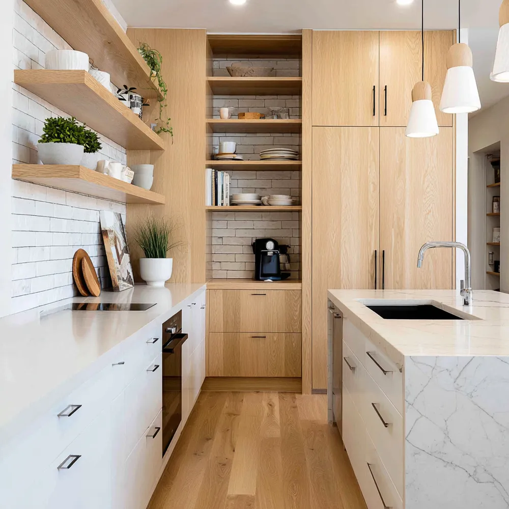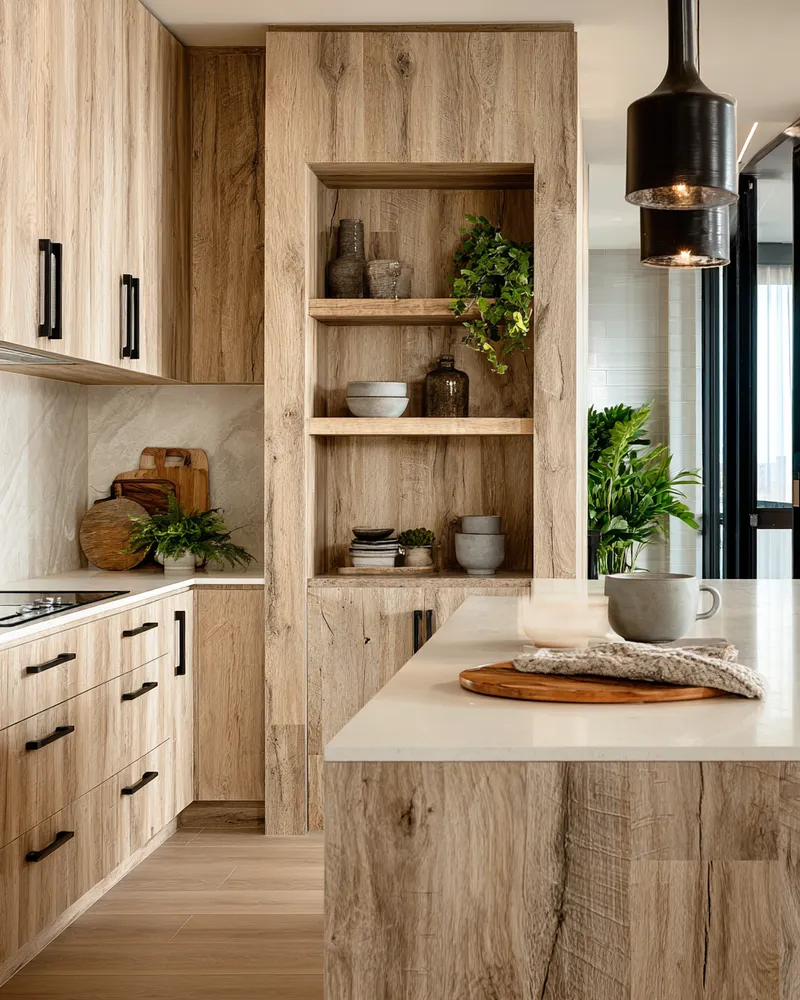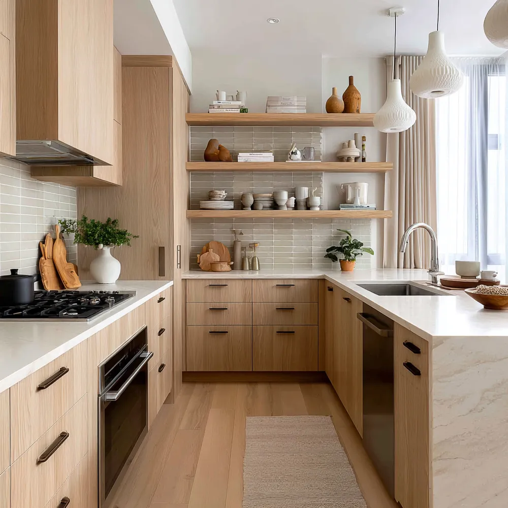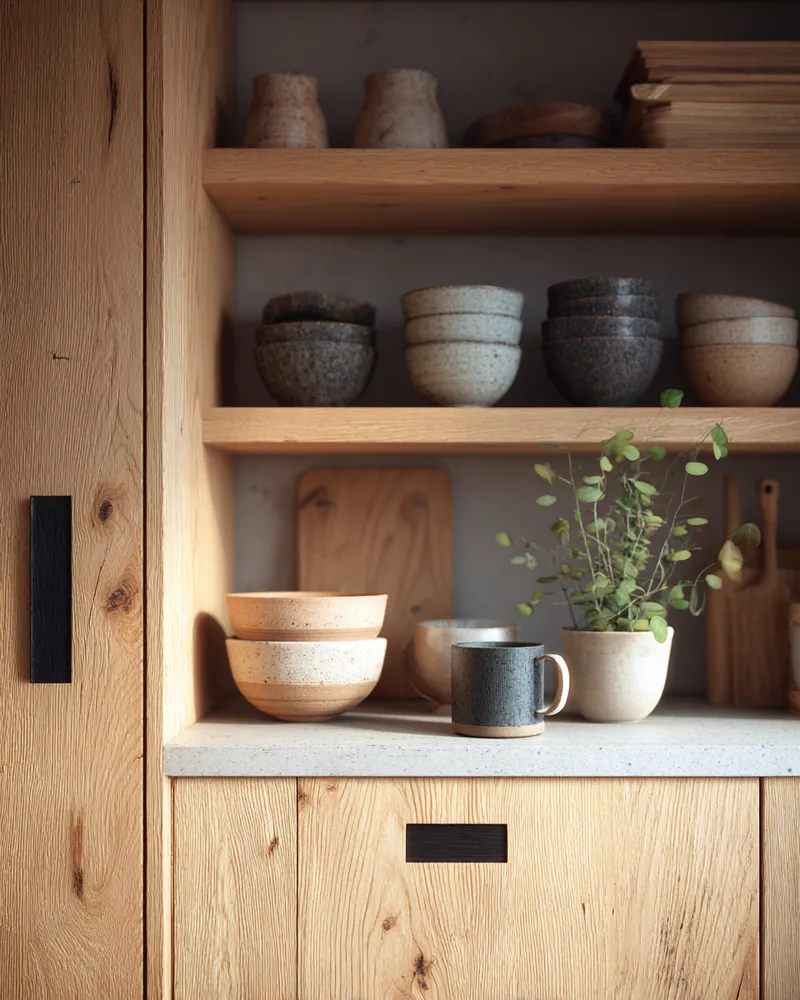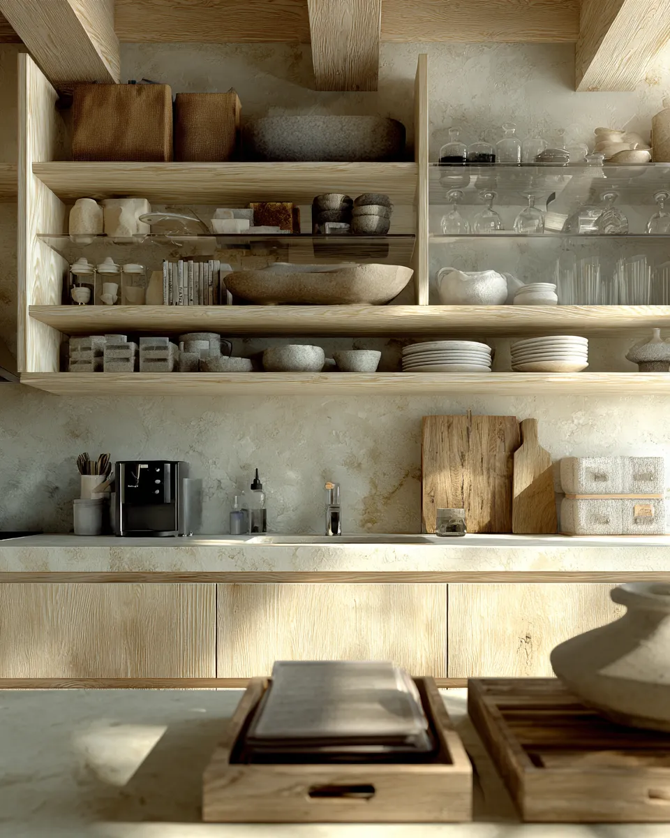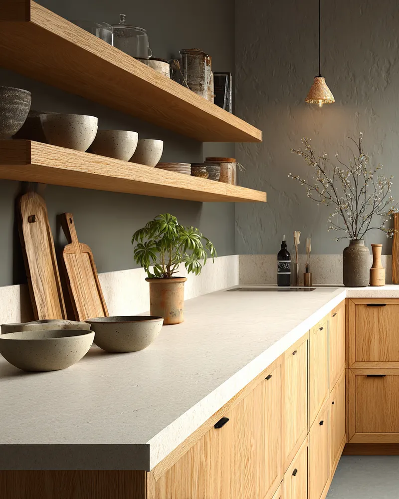 * **Utilize Vertical Space:** Sleek, open shelving in natural wood for dishes.