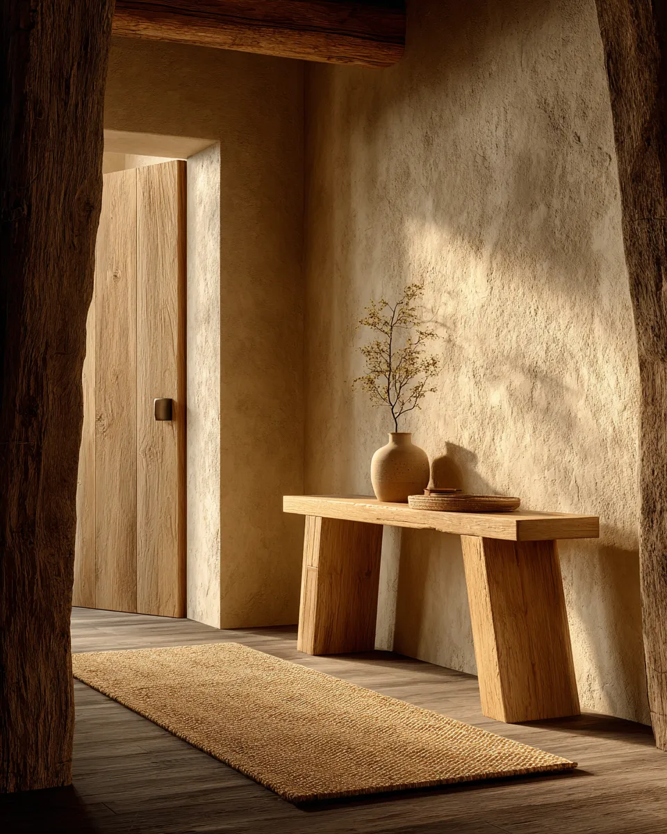* **Minimalist Console:** A narrow console table in natural wood for essentials.