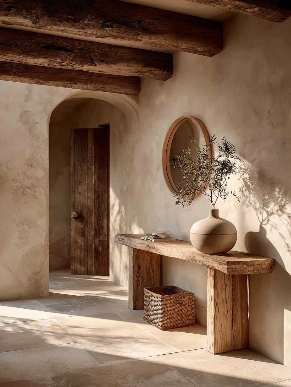 First, a simple wooden console table paired with a single minimalist vase and a dried eucalyptus branch. 🌿 This creates an immediate sense of calm.