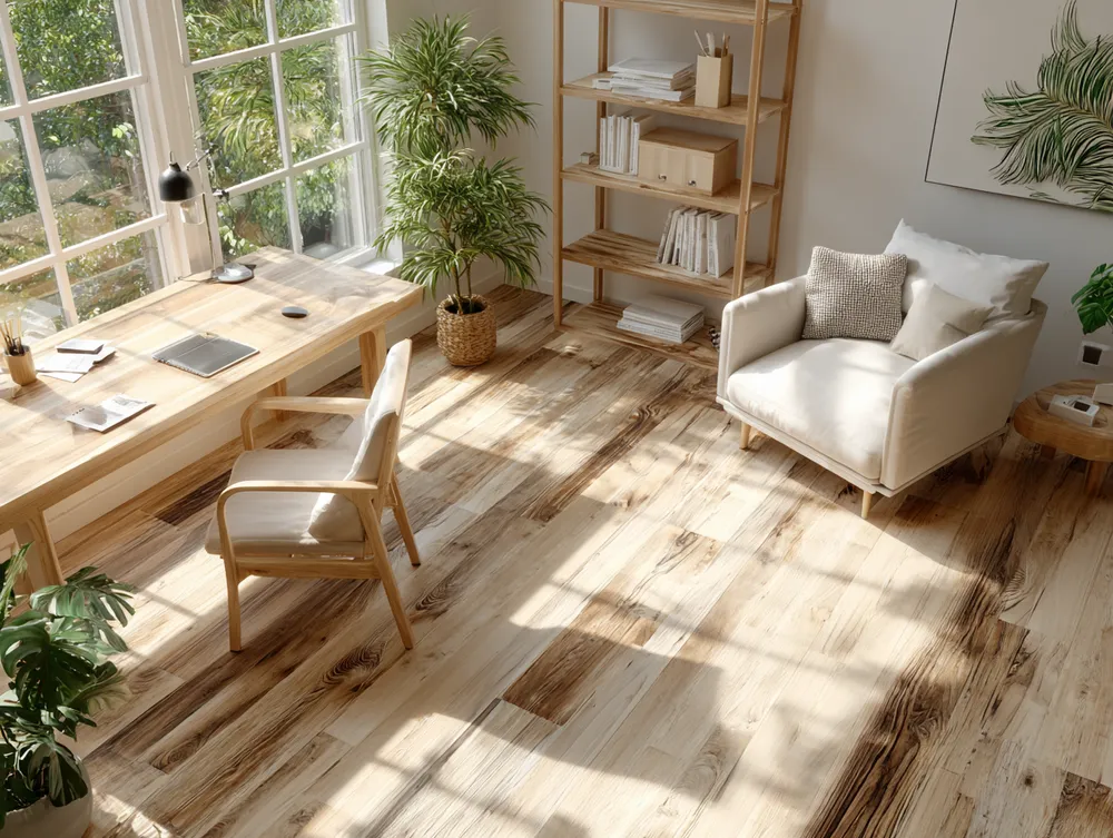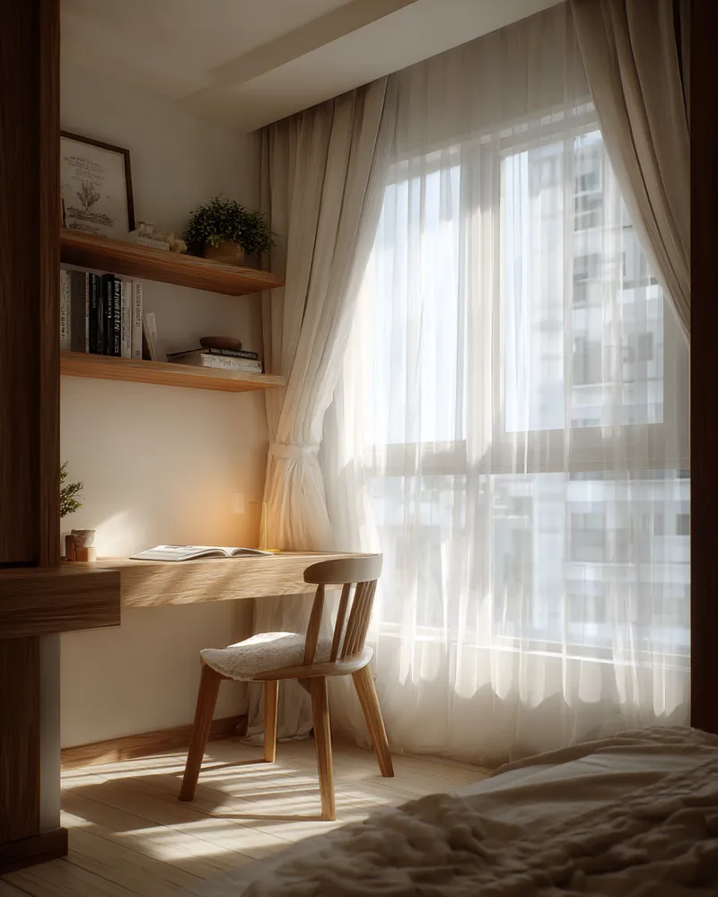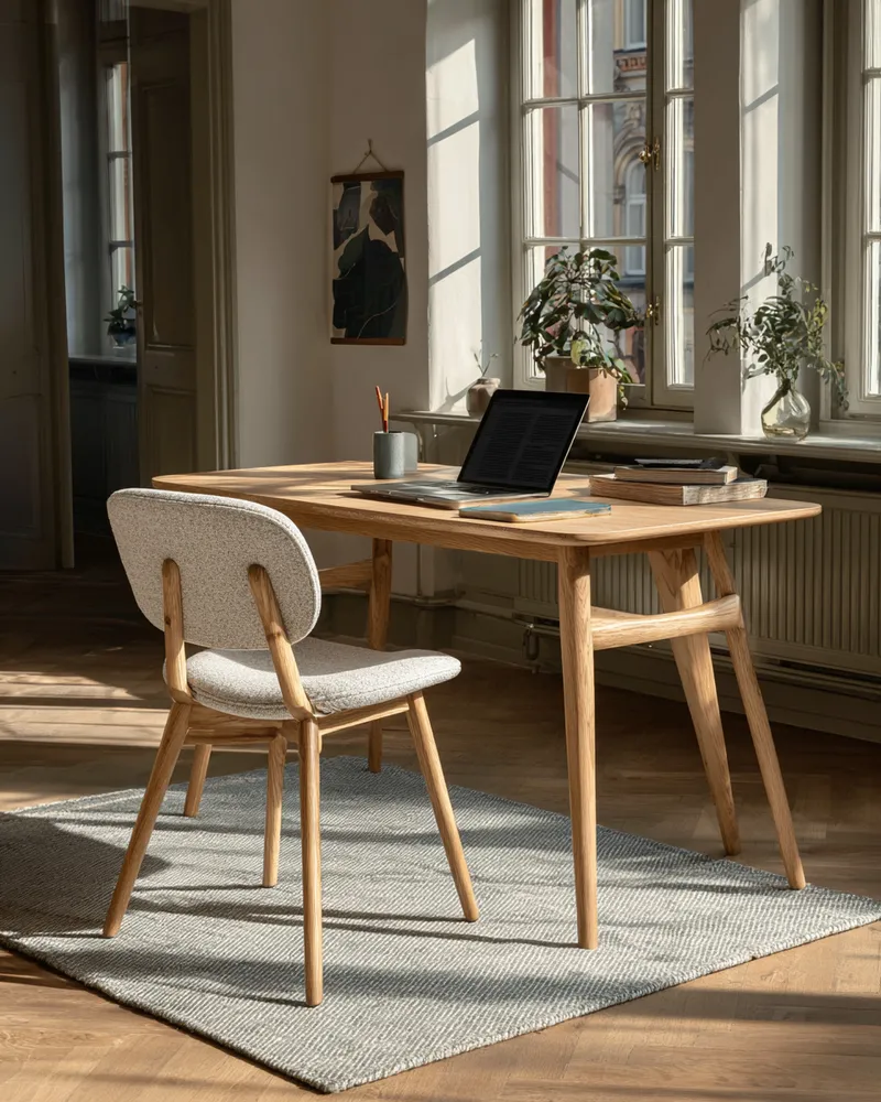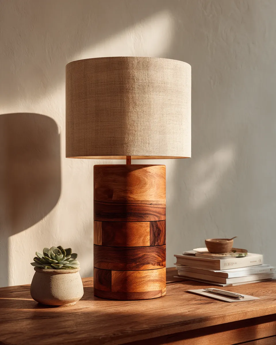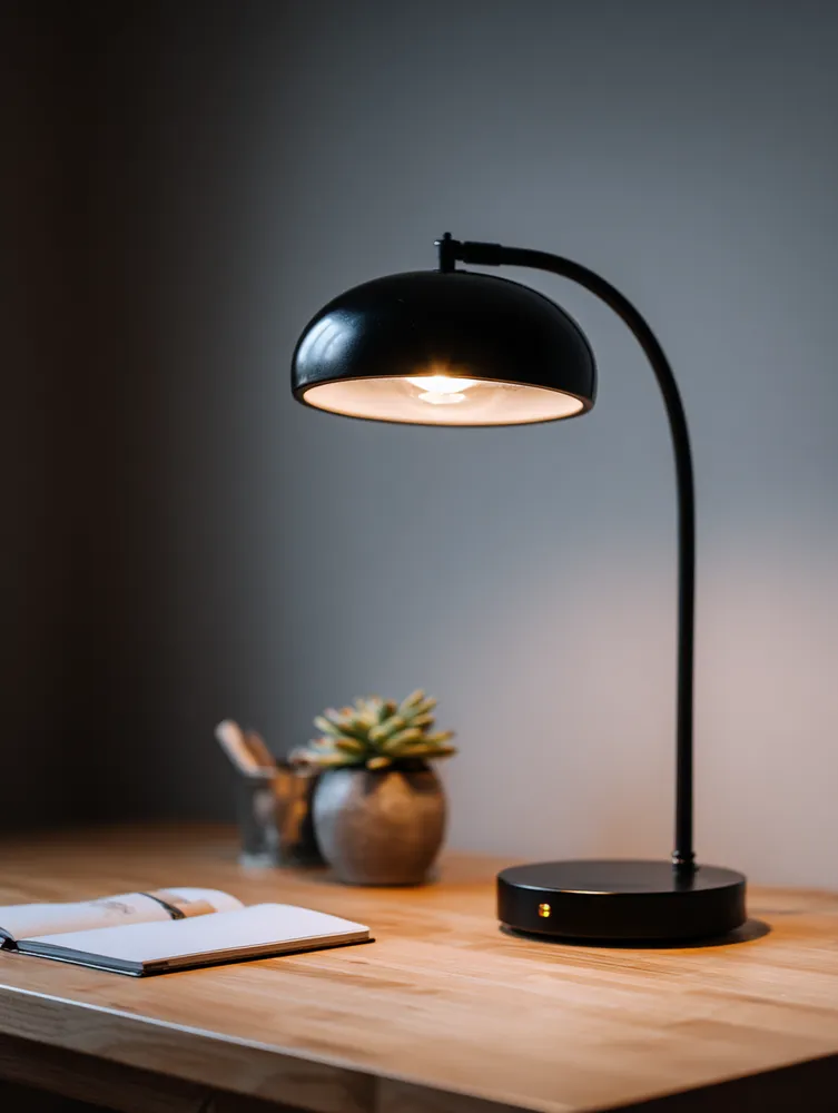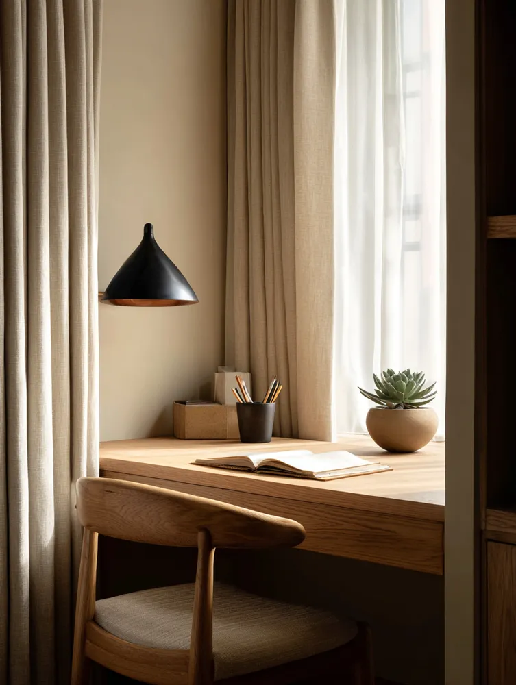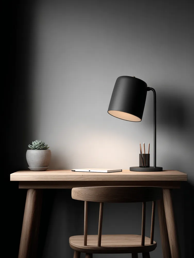 Incorporate a simple desk lamp with a natural wood base and a soft fabric shade for warm, focused light. 💡