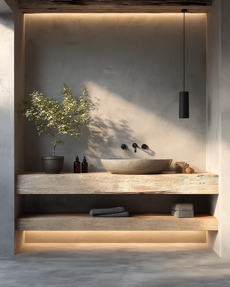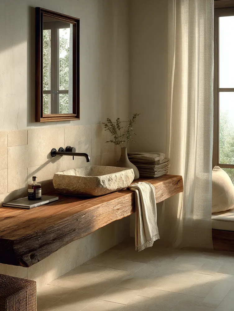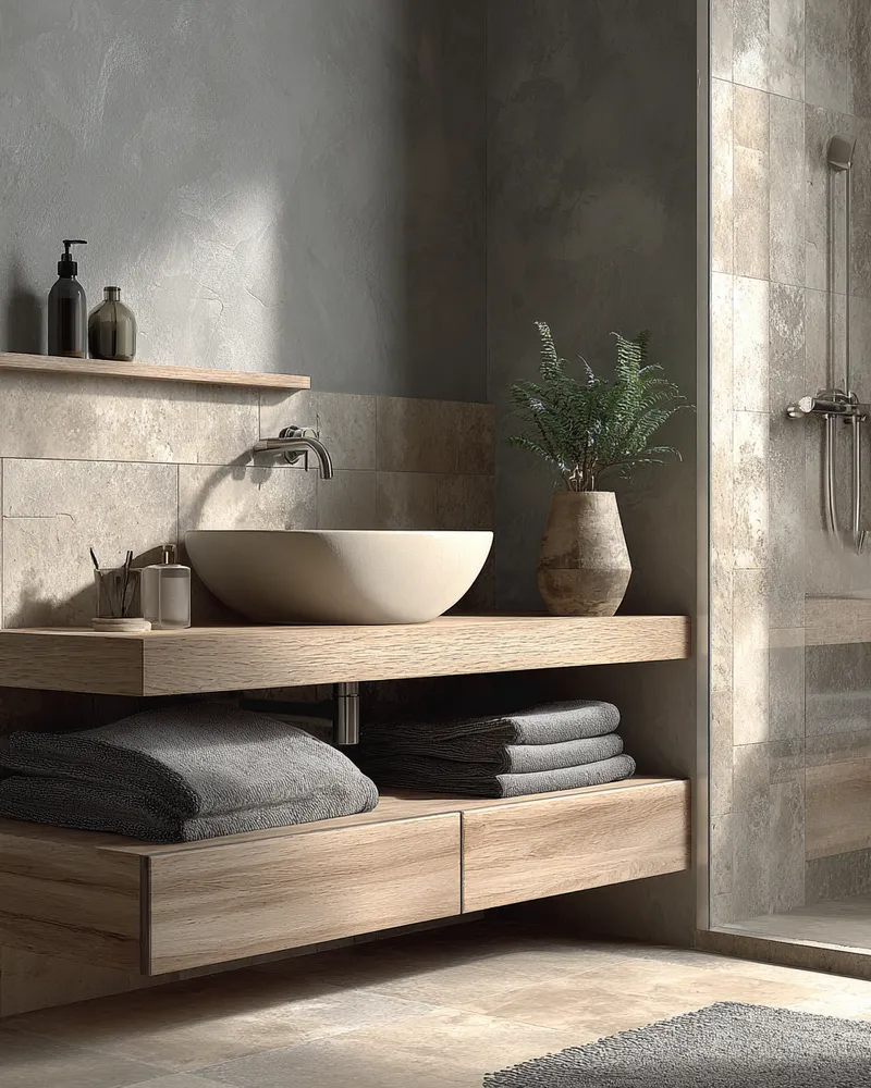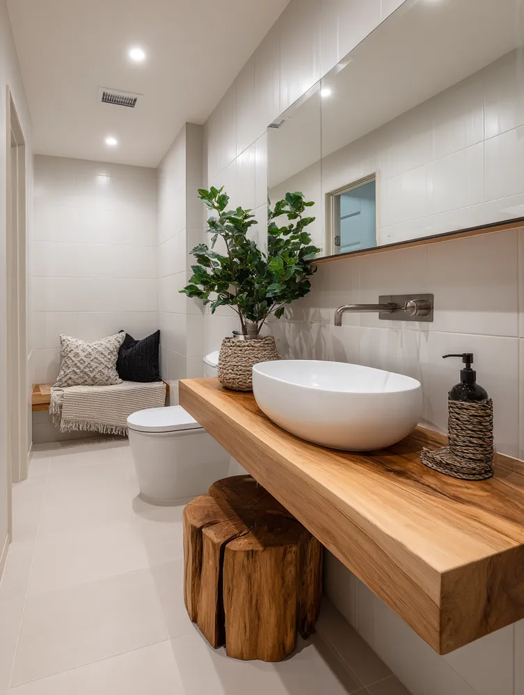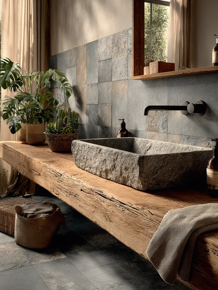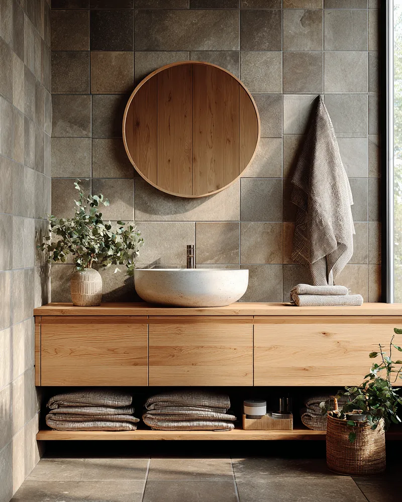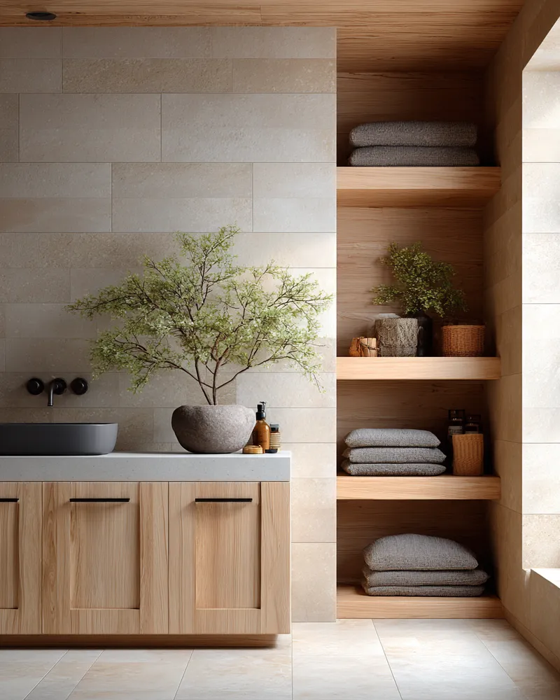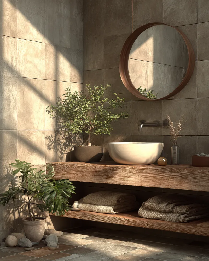 Opt for natural materials: wood accents for vanities or shelves, stone tiles, and bamboo accessories. 🪵