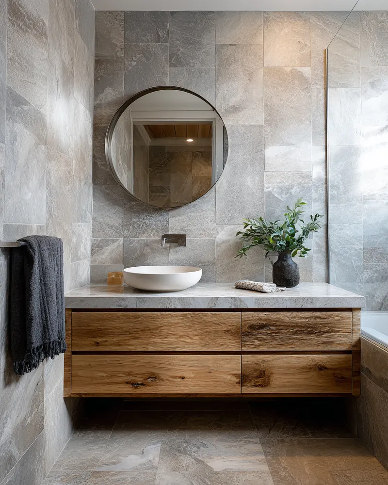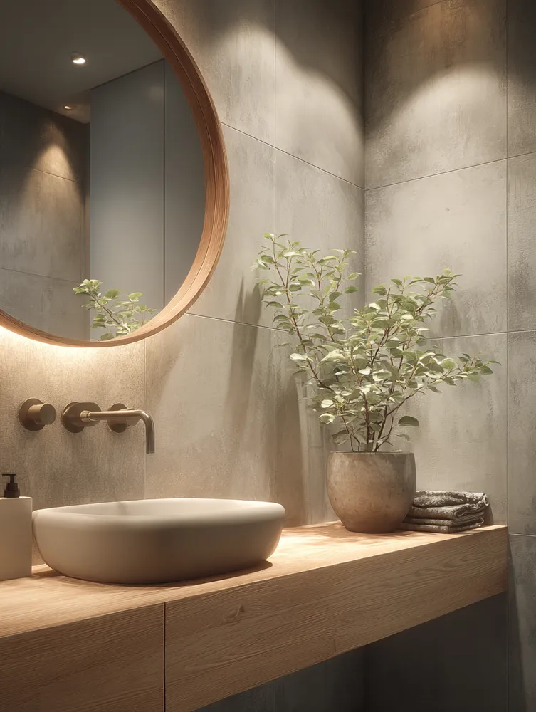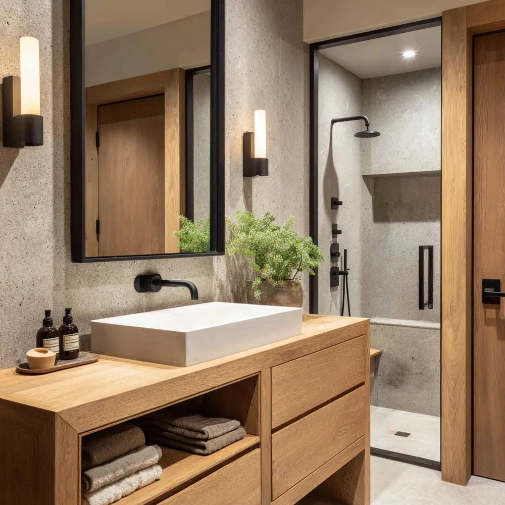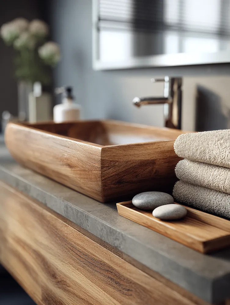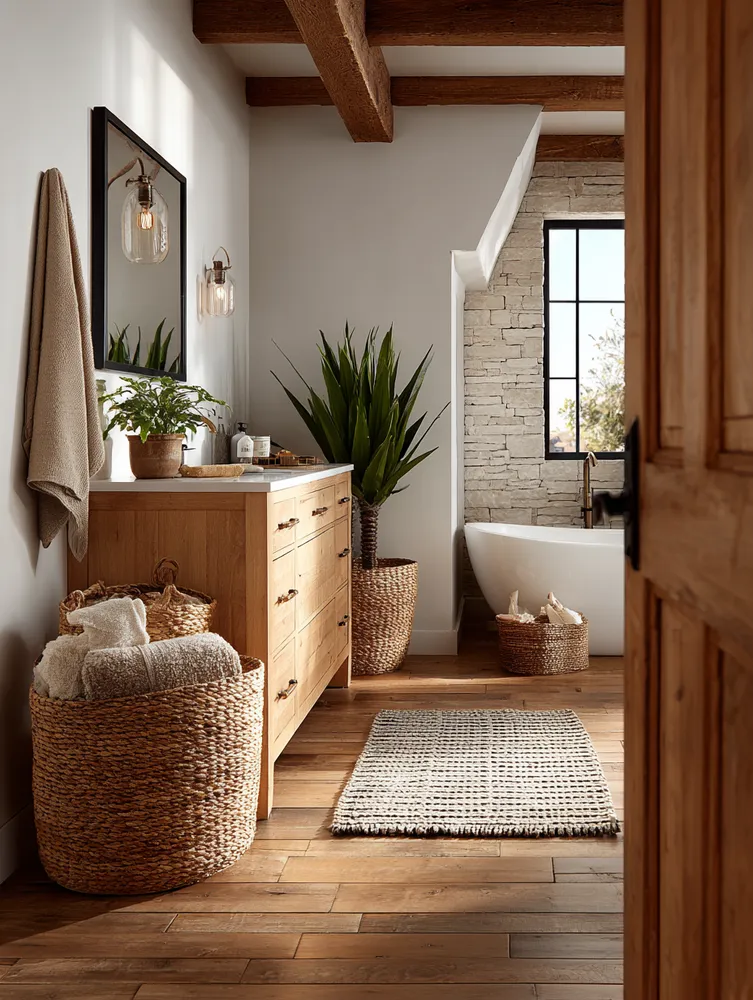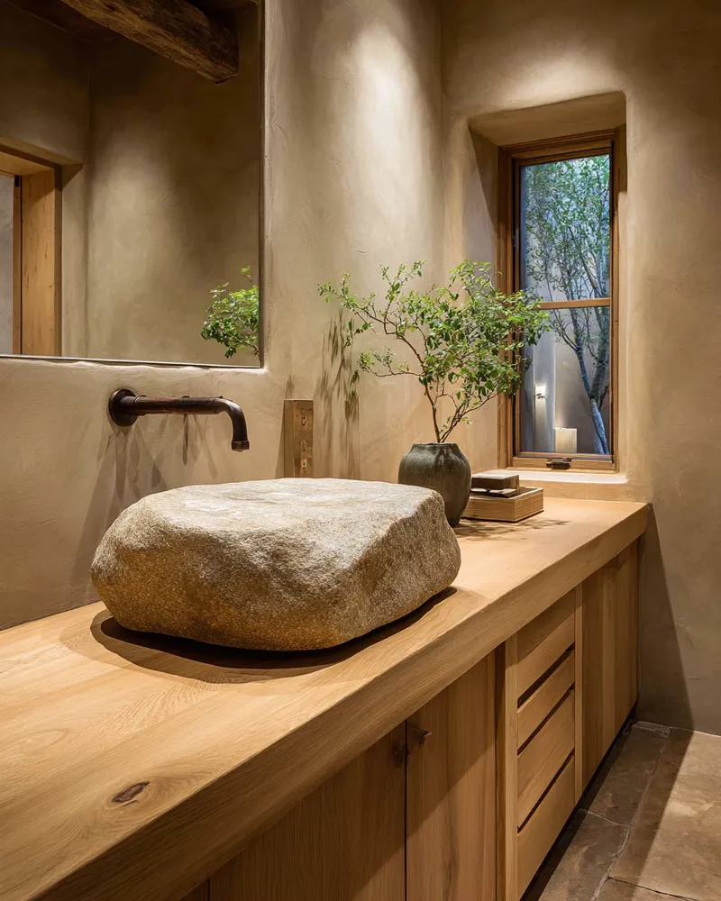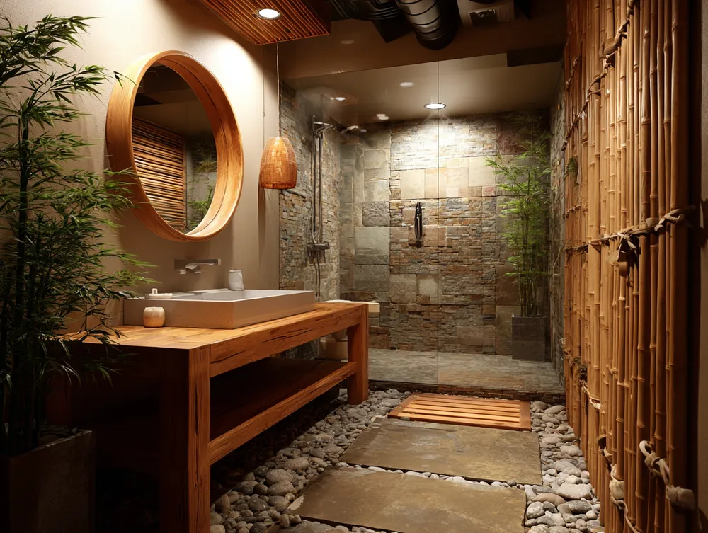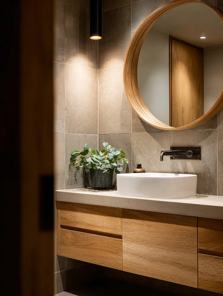 Opt for natural materials: wood accents for vanities or shelves, stone tiles, and bamboo accessories. 🪵