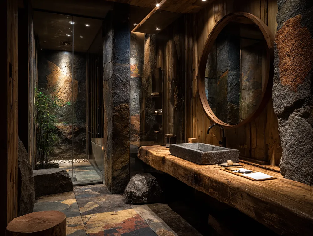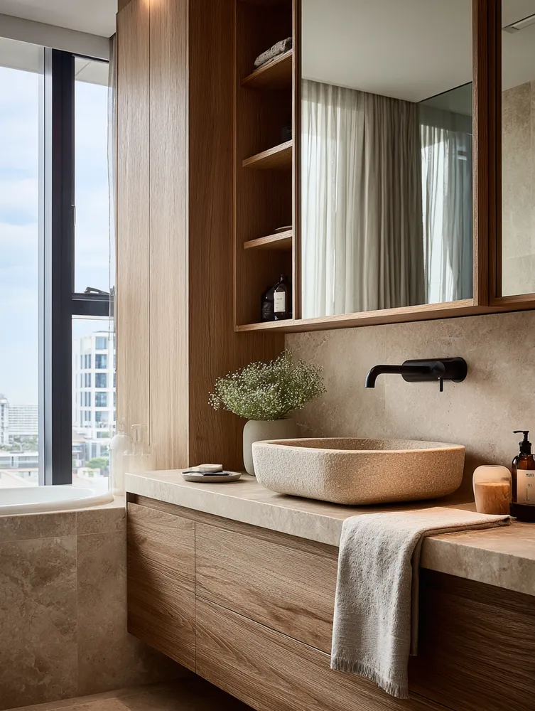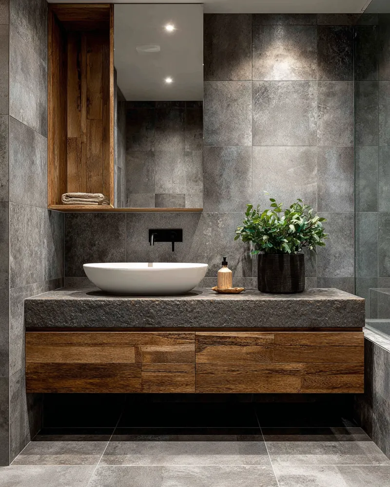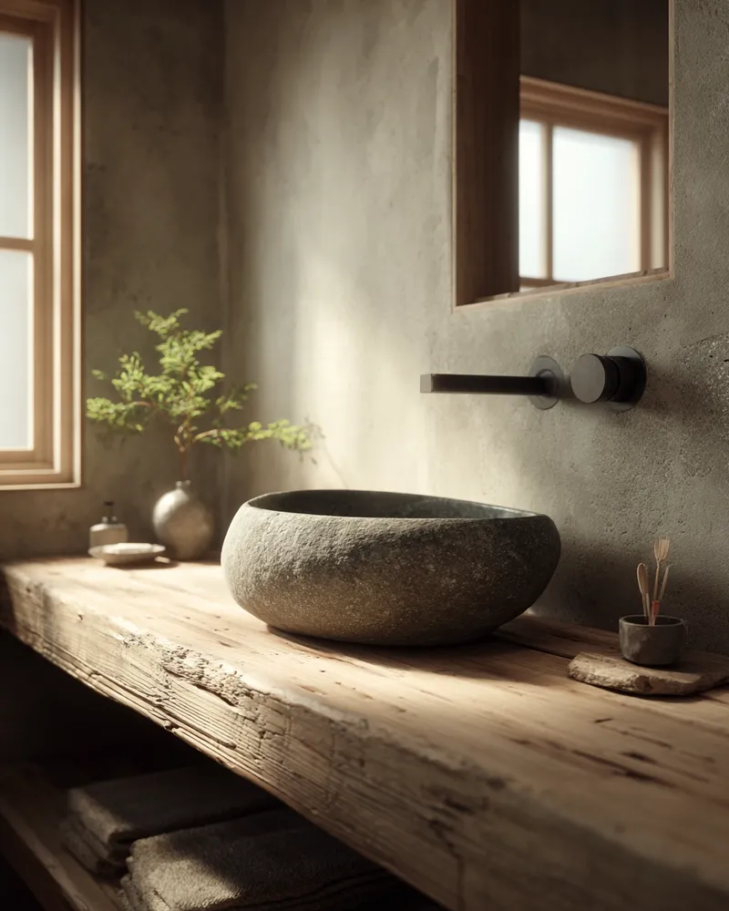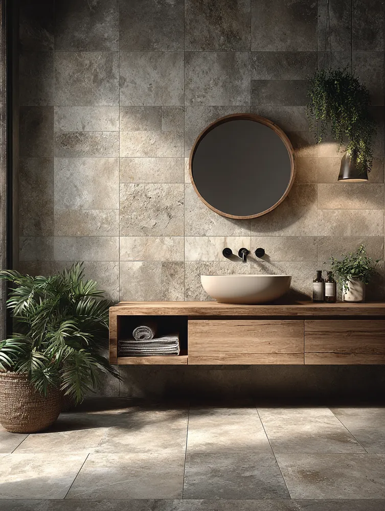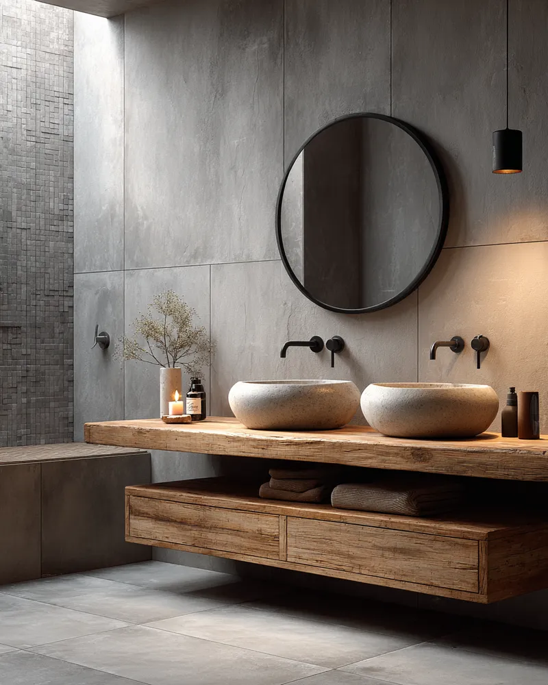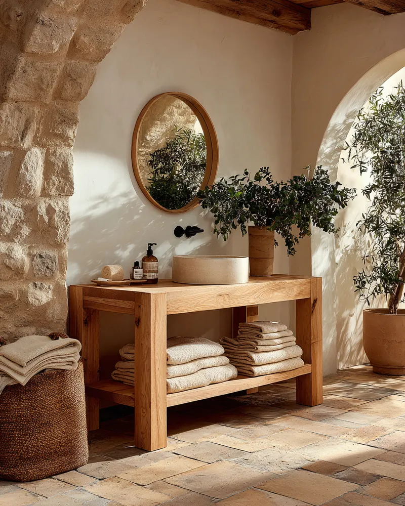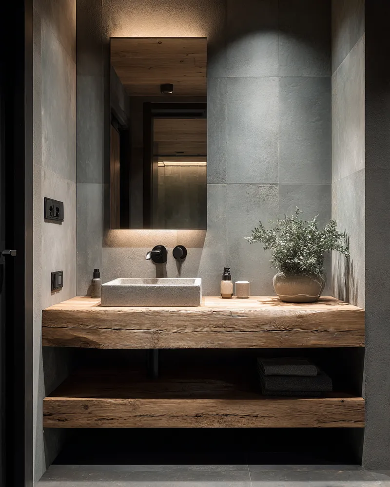 Opt for natural materials: wood accents for vanities or shelves, stone tiles, and bamboo accessories. 🪵