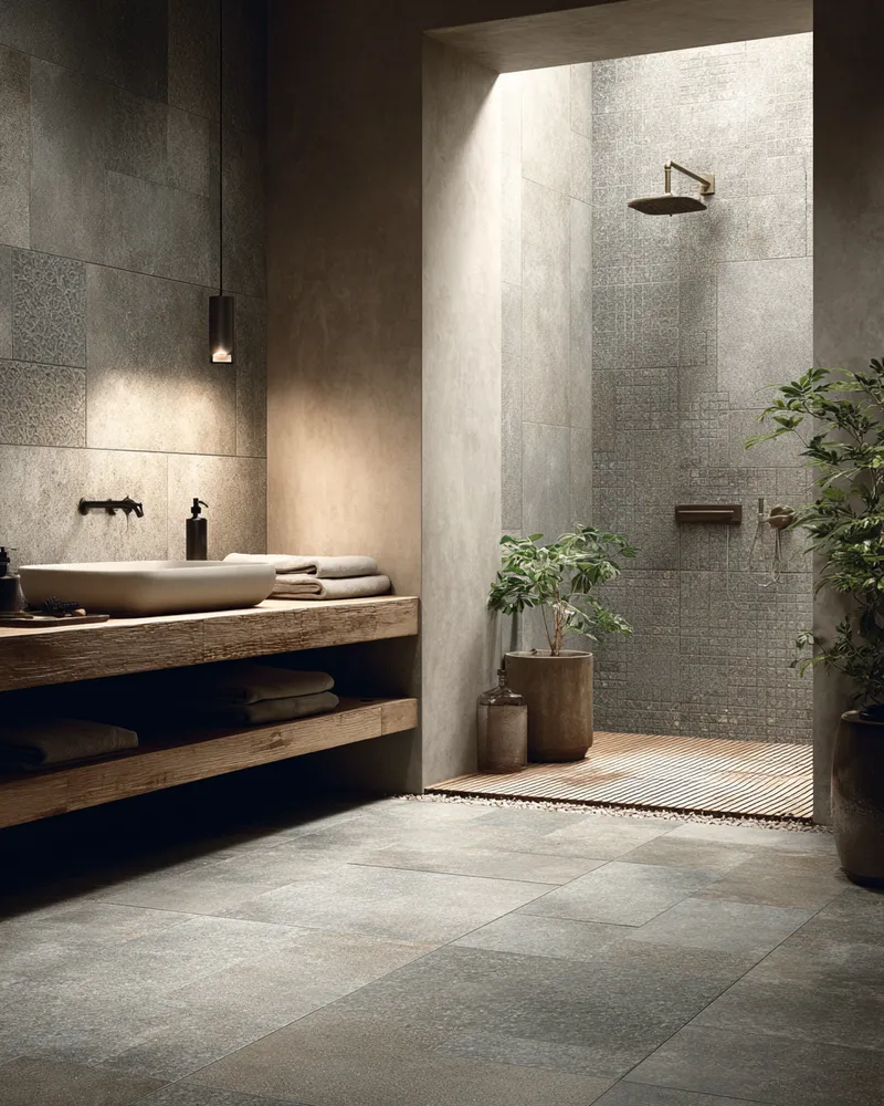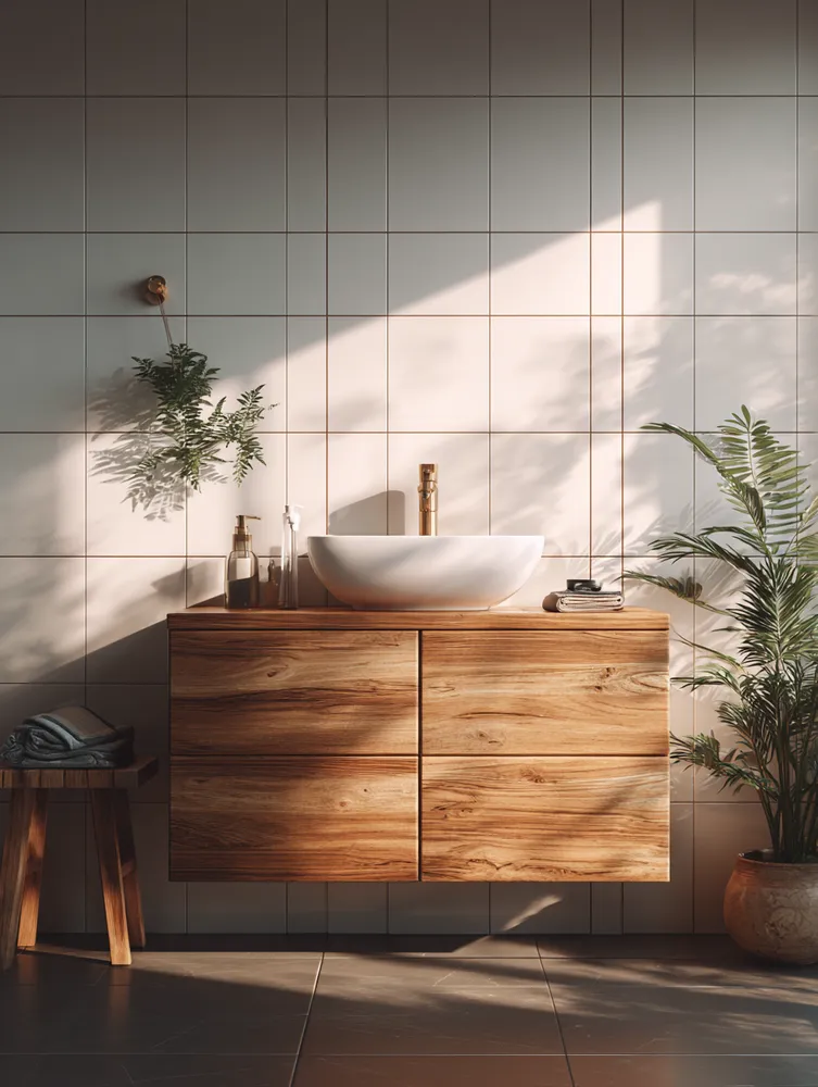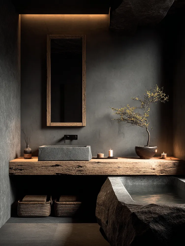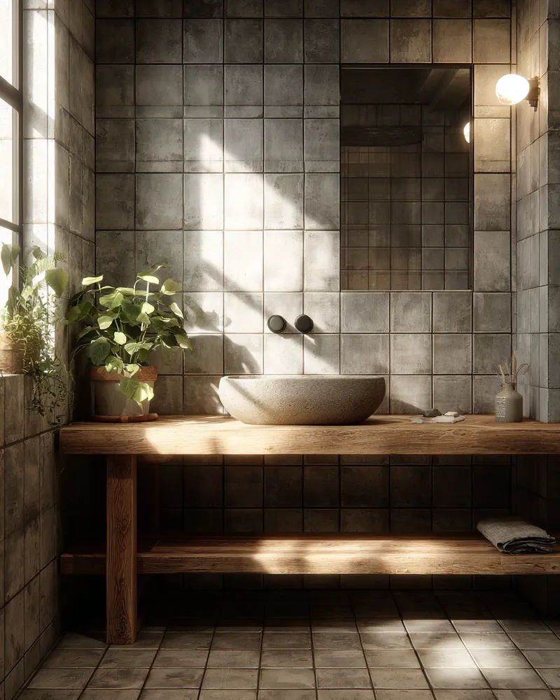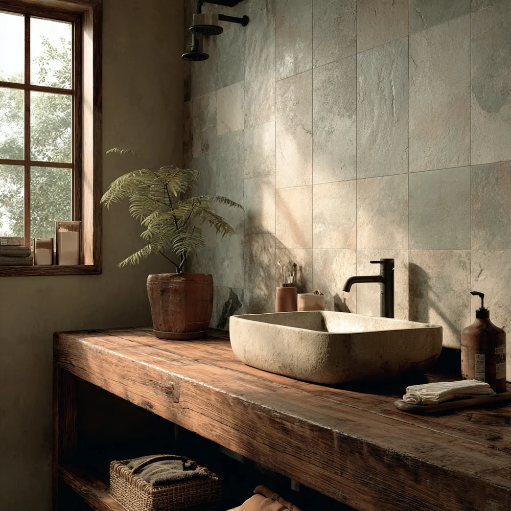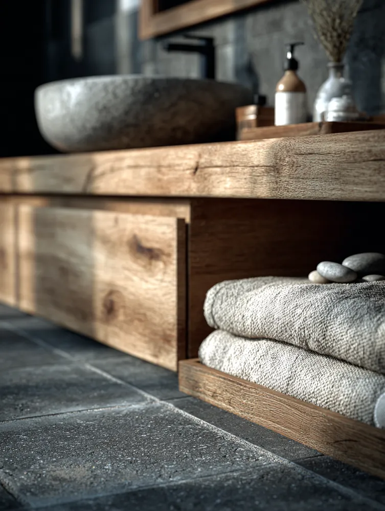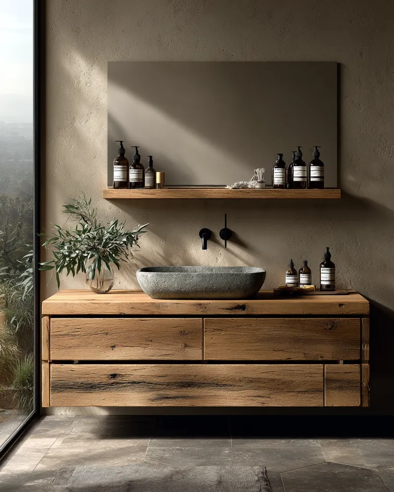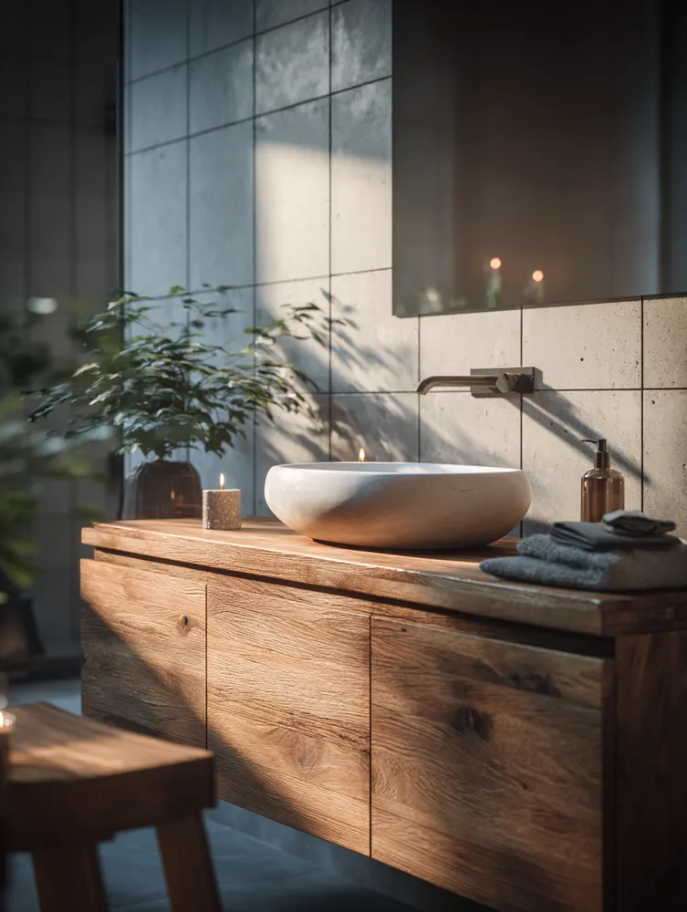 Opt for natural materials: wood accents for vanities or shelves, stone tiles, and bamboo accessories. 🪵