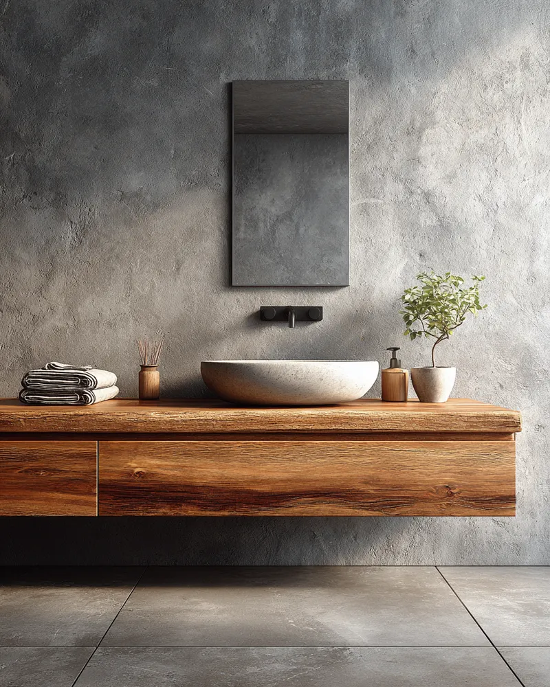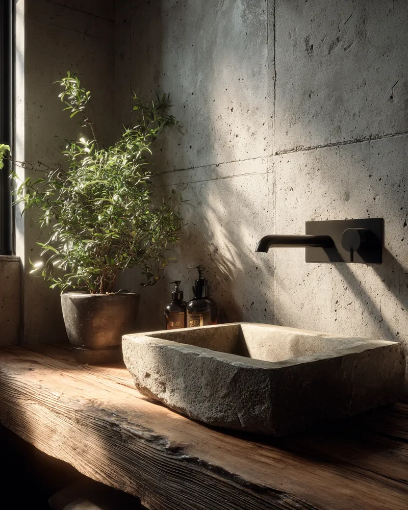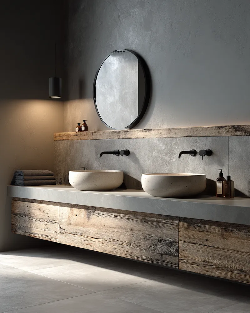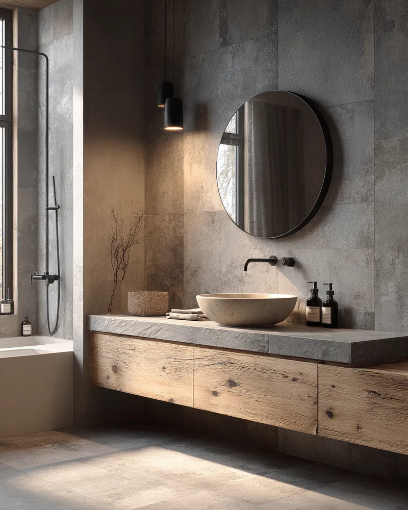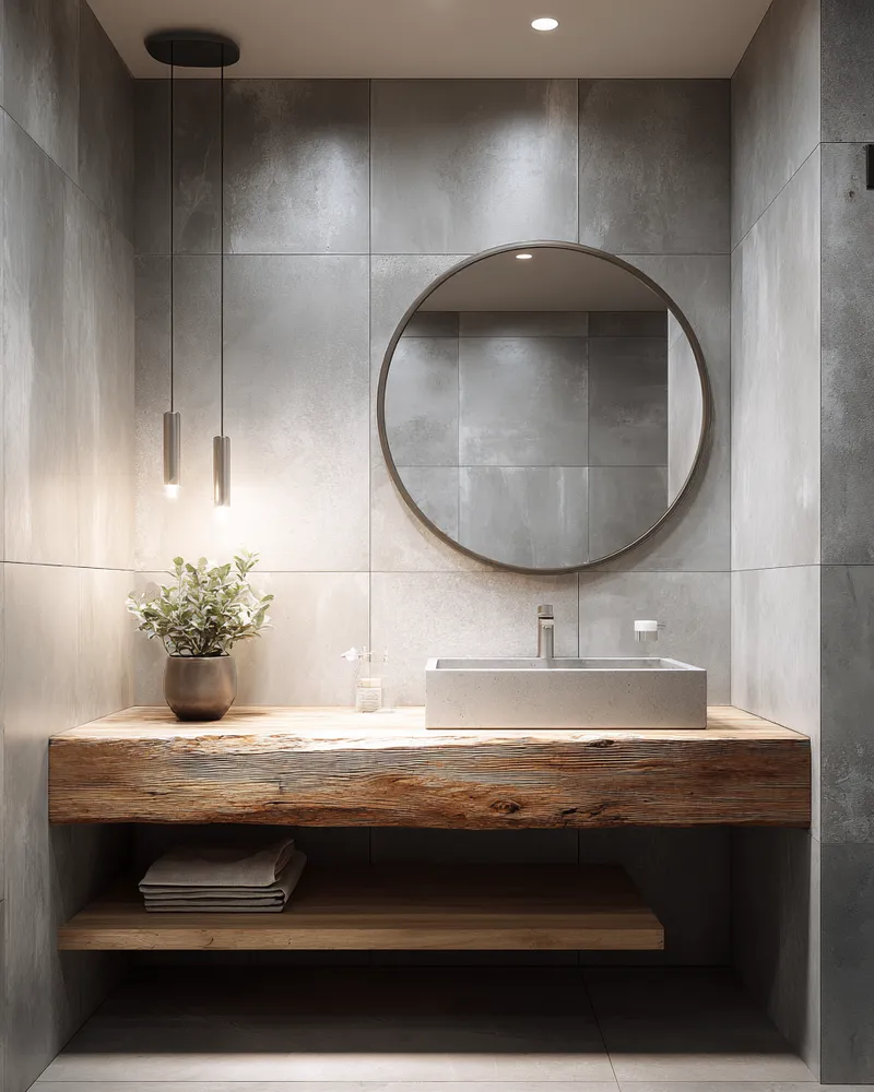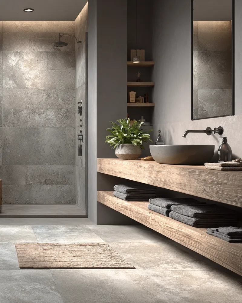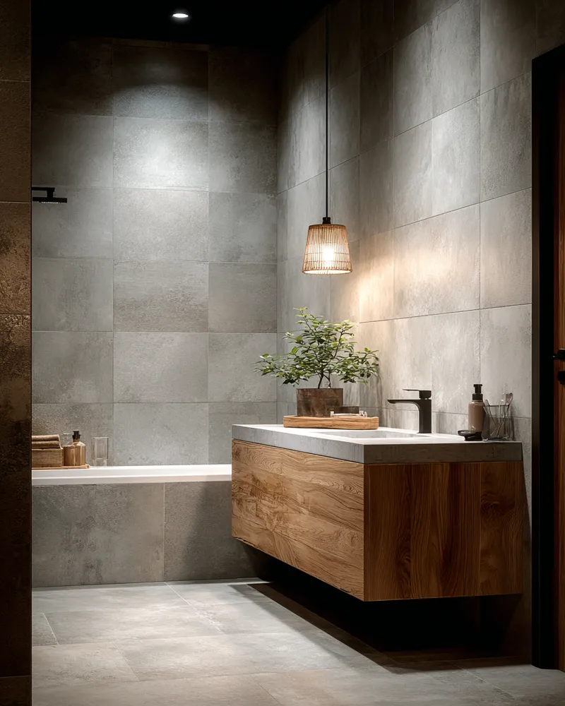 Opt for natural materials: wood accents for vanities or shelves, stone tiles, and bamboo accessories. 🪵