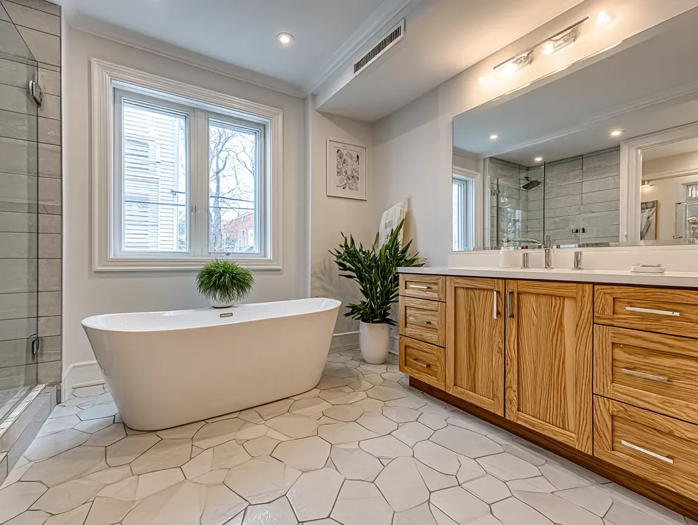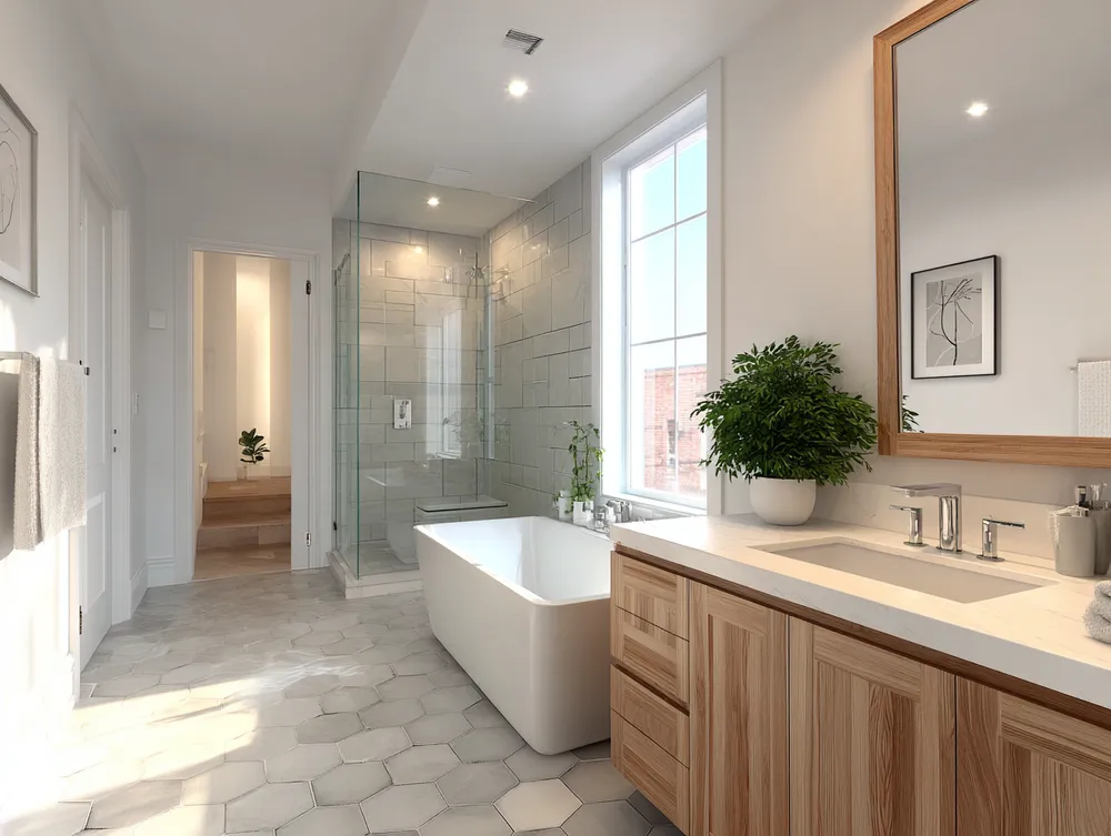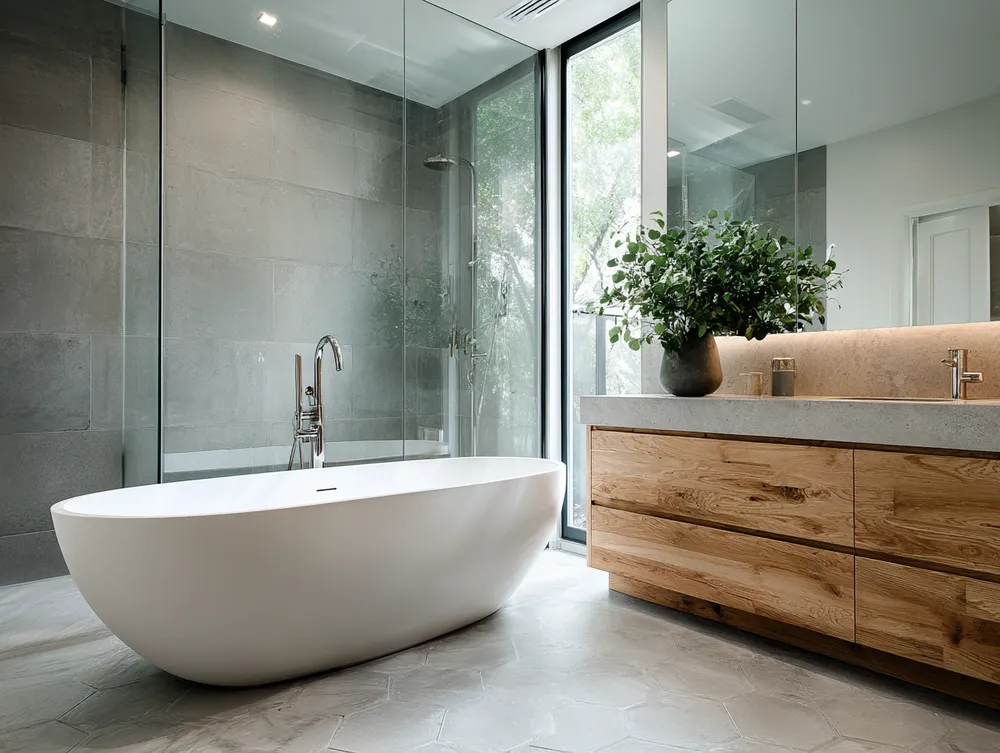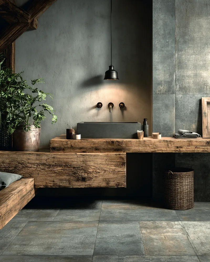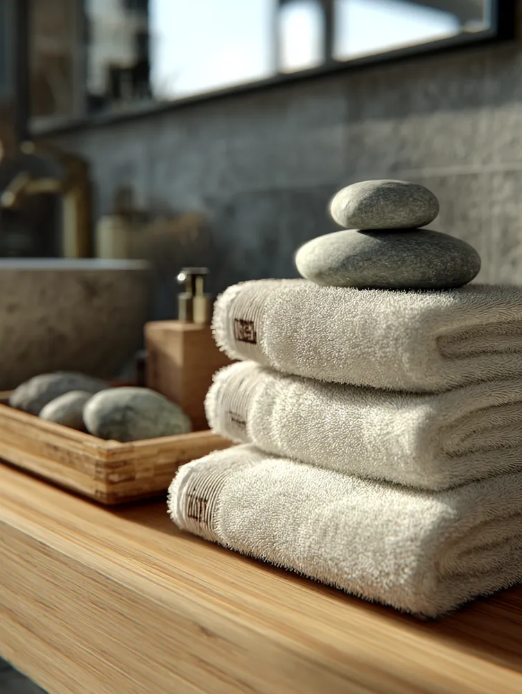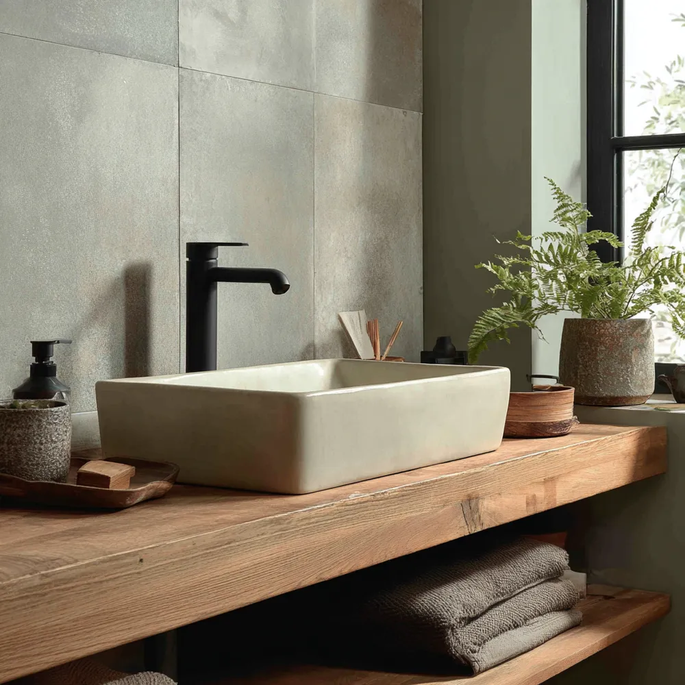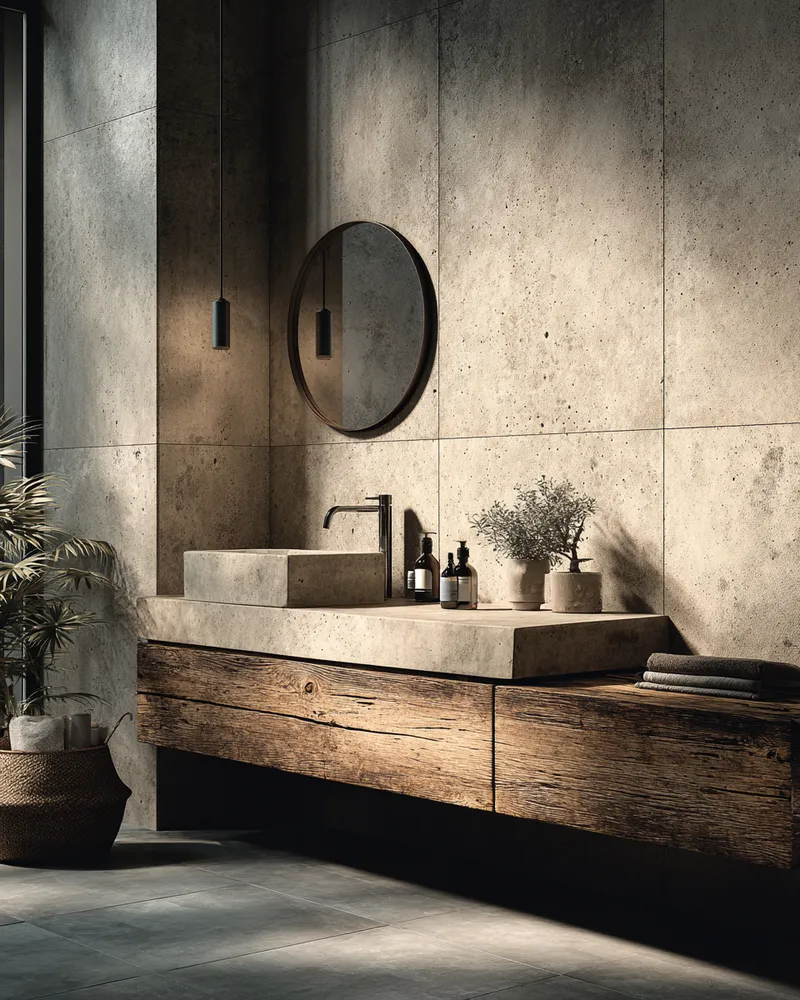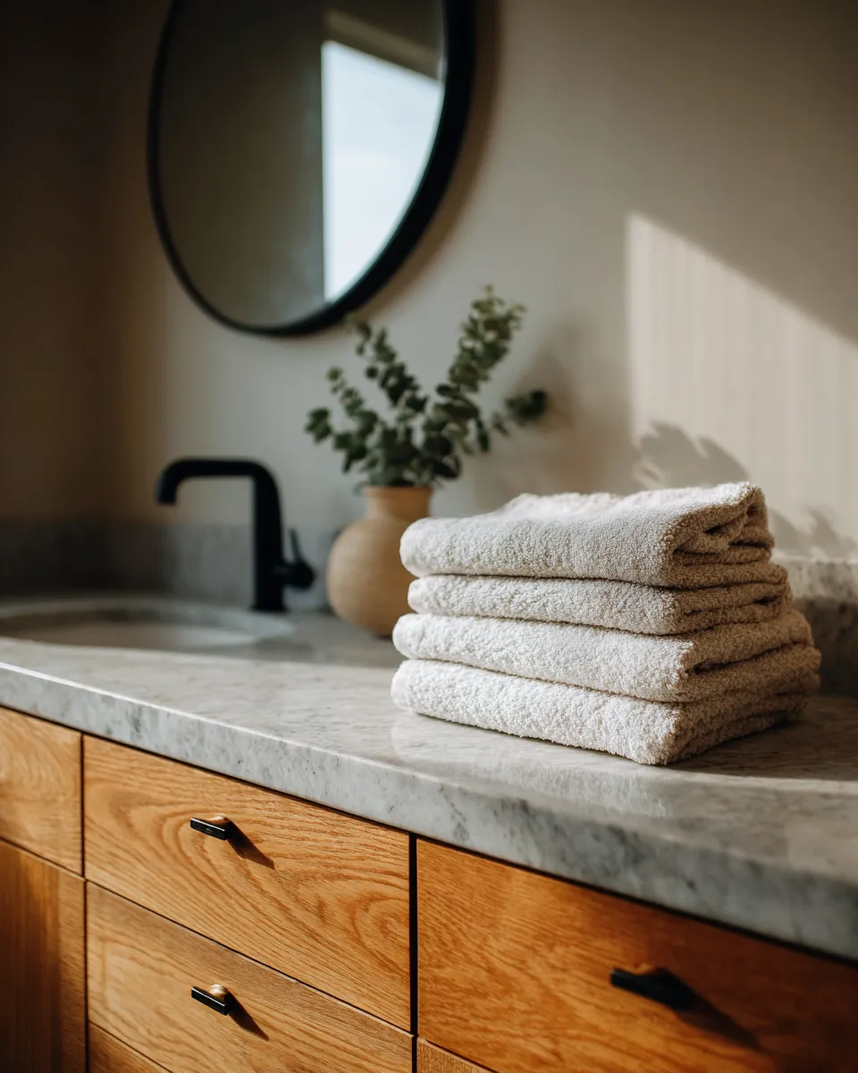 Opt for natural materials: wood accents for vanities or shelves, stone tiles, and bamboo accessories. 🪵