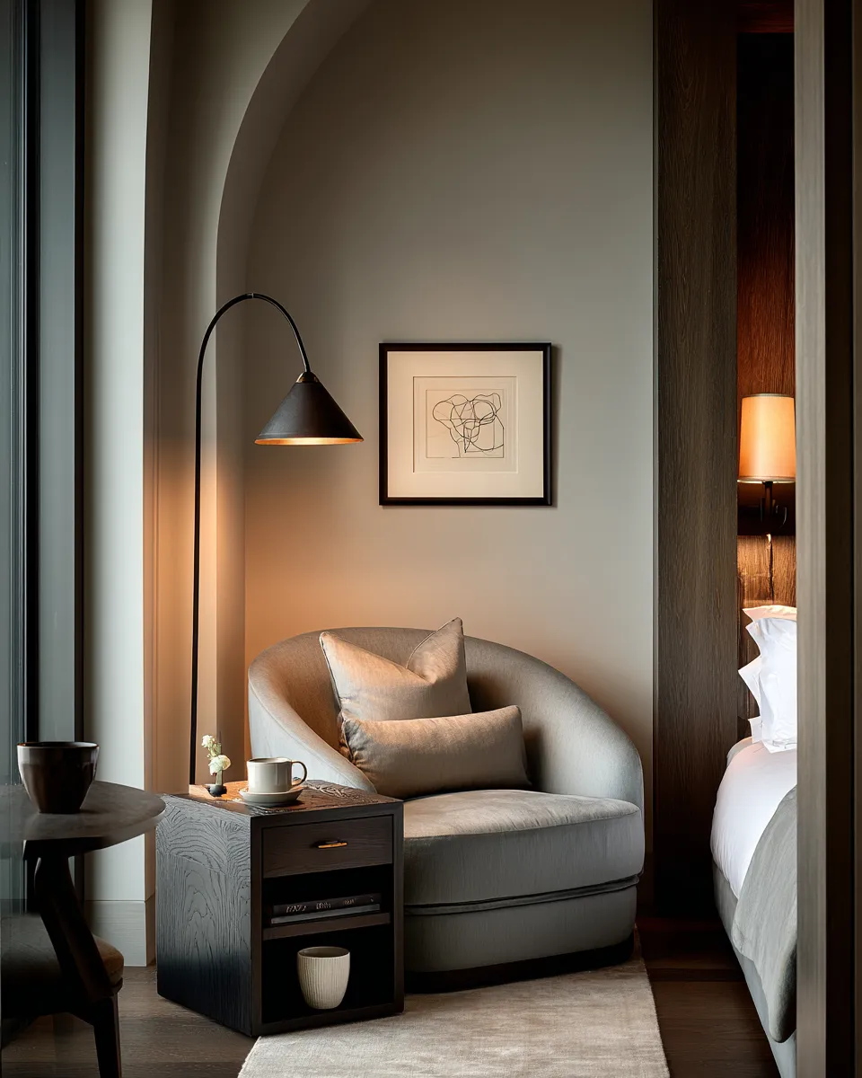 1. **Comfortable Seating:** A plush, upholstered armchair in a neutral tone.