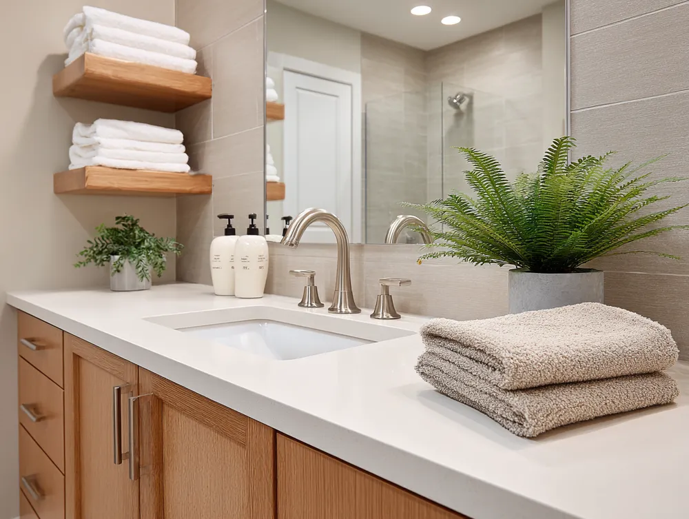 * **Clean Lines:** Frameless glass showers and simple fixtures.