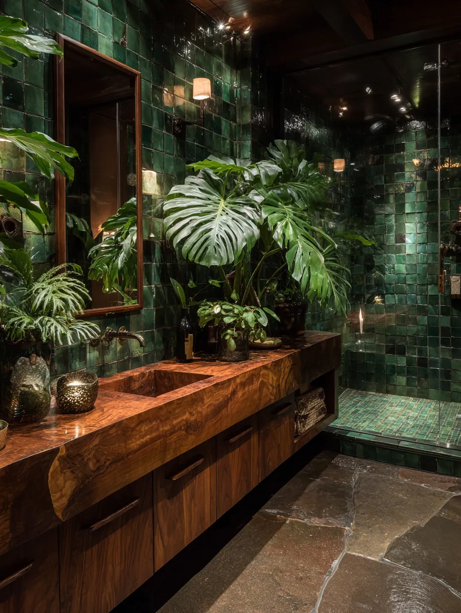 Tropical Jungle Oasis: Deep Greens & Rich Teak for a Lush Bathroom 🌴