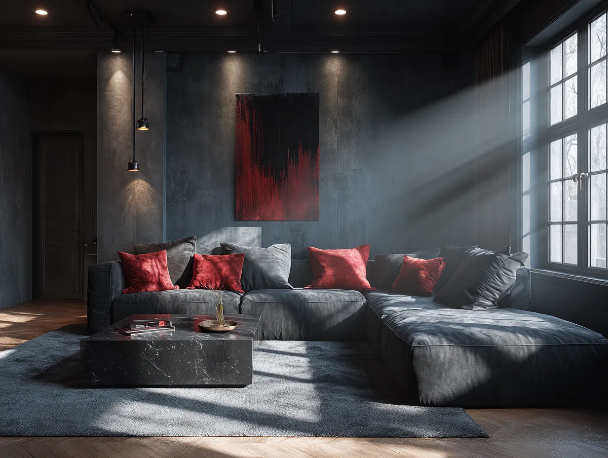 Volcanic Serenity: Deep Charcoals, Onyx Blacks & Fiery Reds for a Dramatic Living Room 🌋