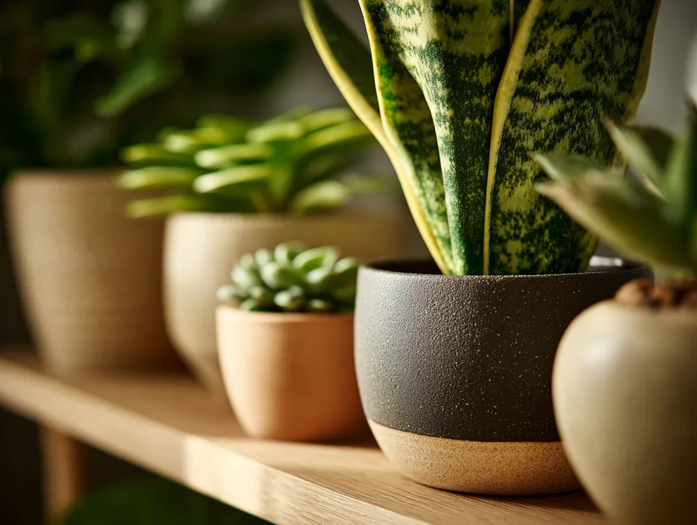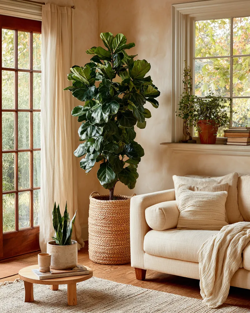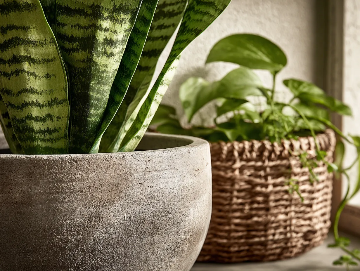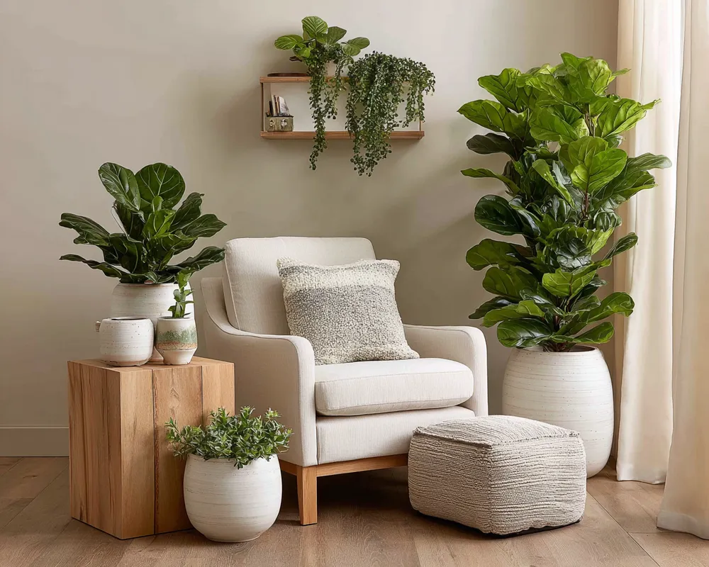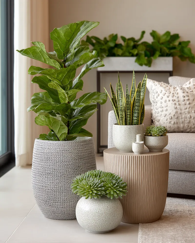 • **Simple Pots:** Ceramic, terracotta, or woven planters in neutral tones.