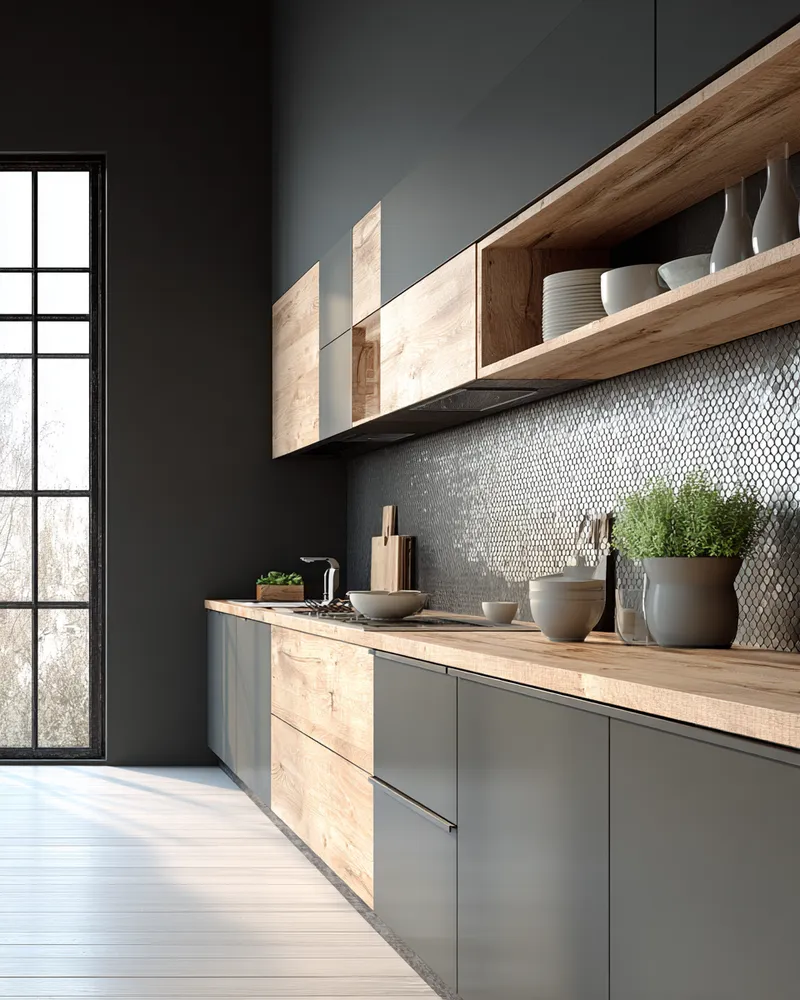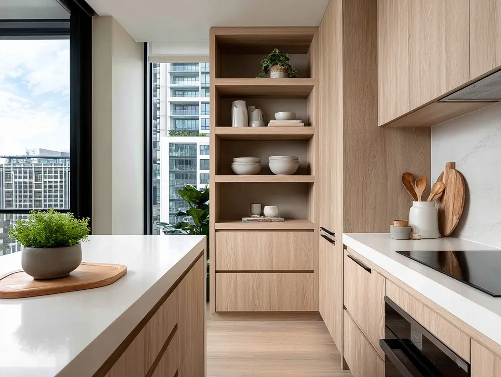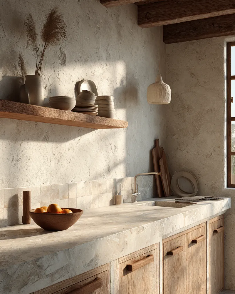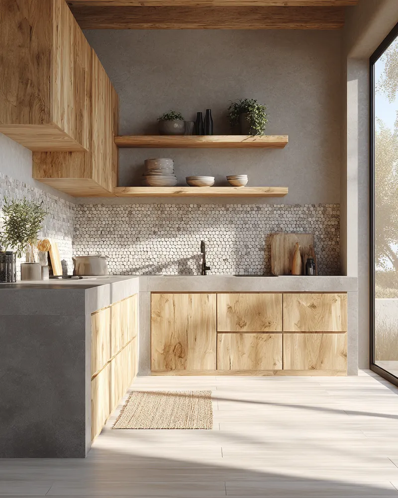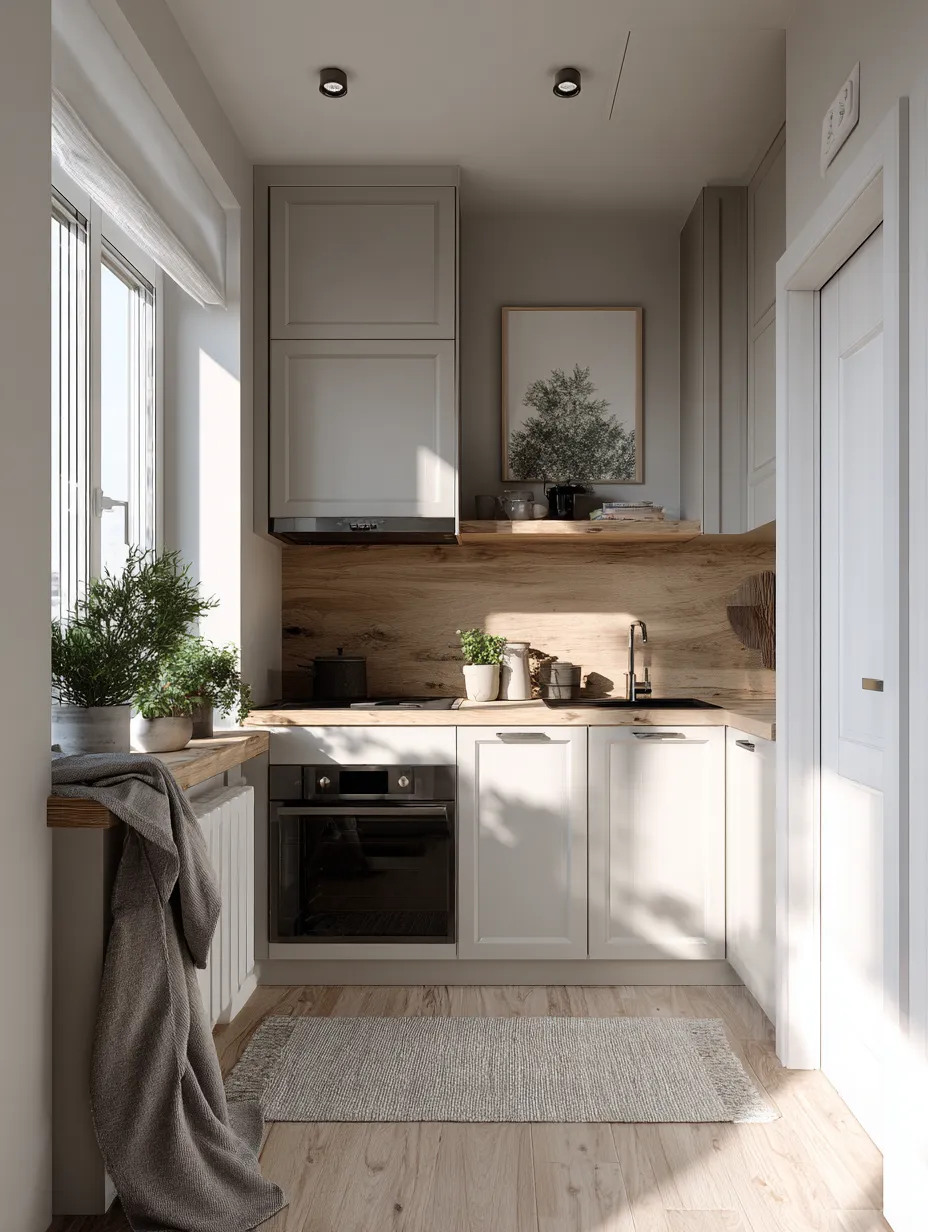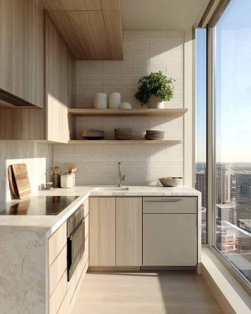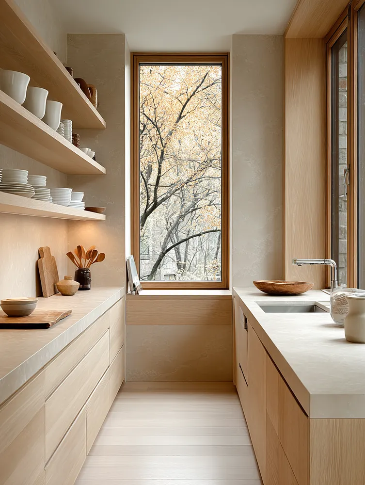 Make your small kitchen a space for mindful meal preparation and enjoyment. Save this for your kitchen makeover! #japandi#kitchenideas#smallkitchen#minimalistkitchen#homedecor#japandikitchenideas#functionaldesign#designinspiration#urbanhome#calmkitchen
