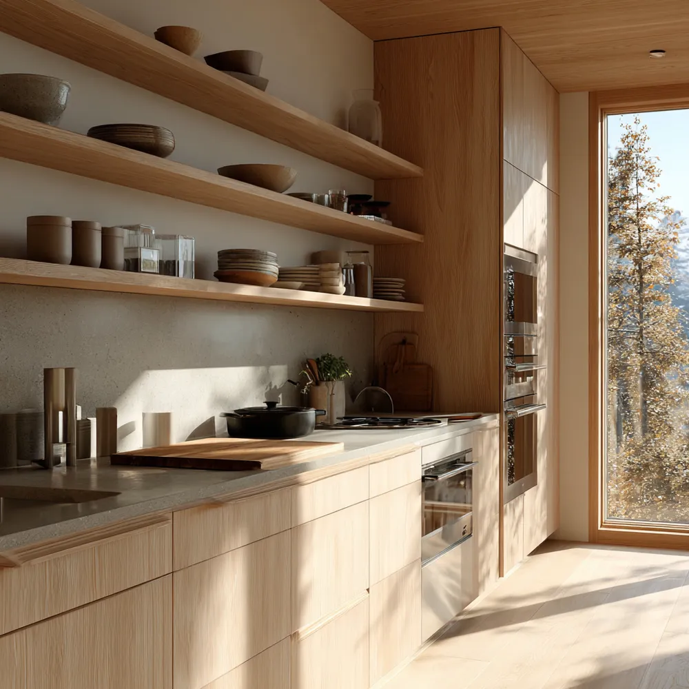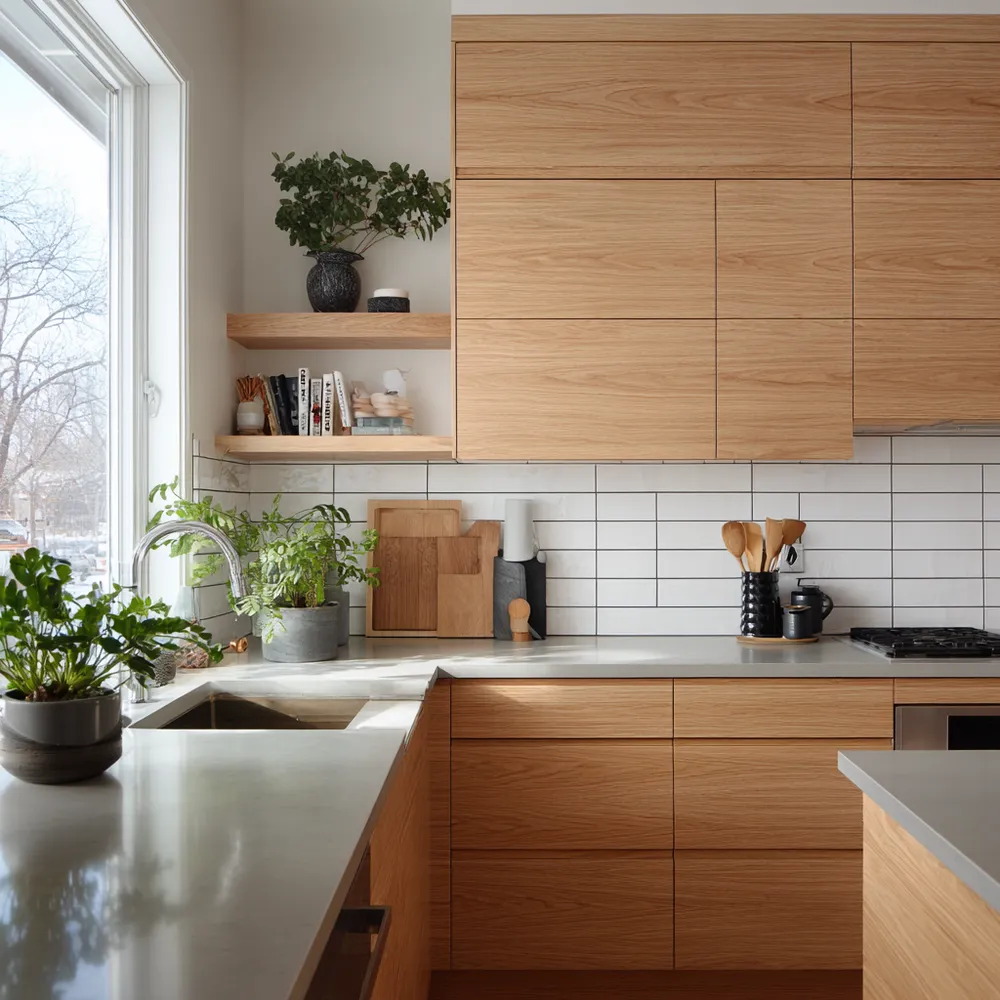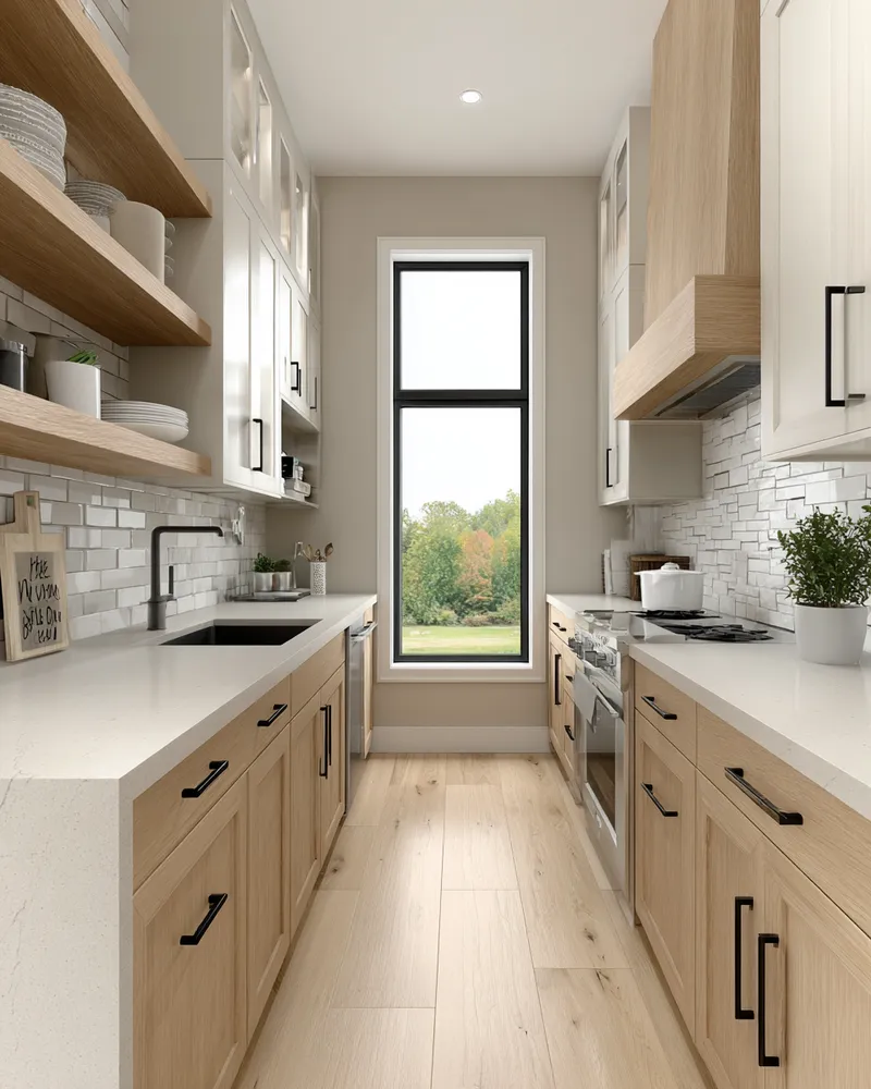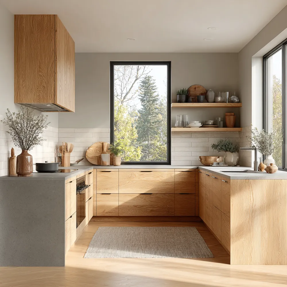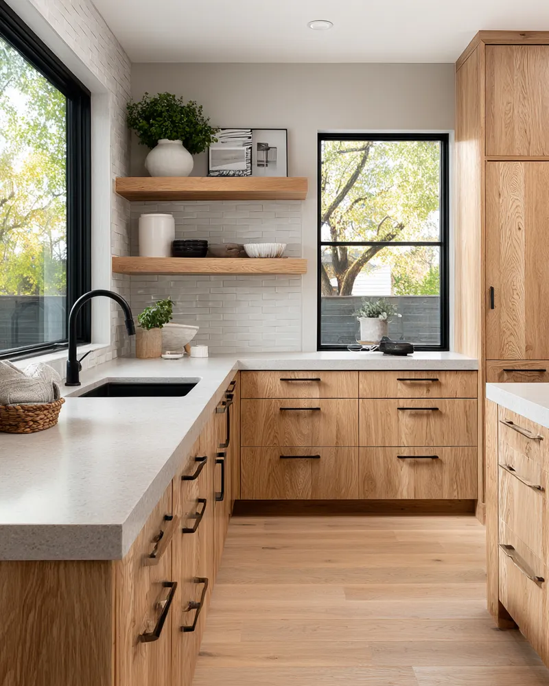 * **Natural Wood Elements:** Integrate light wood countertops or open shelving.