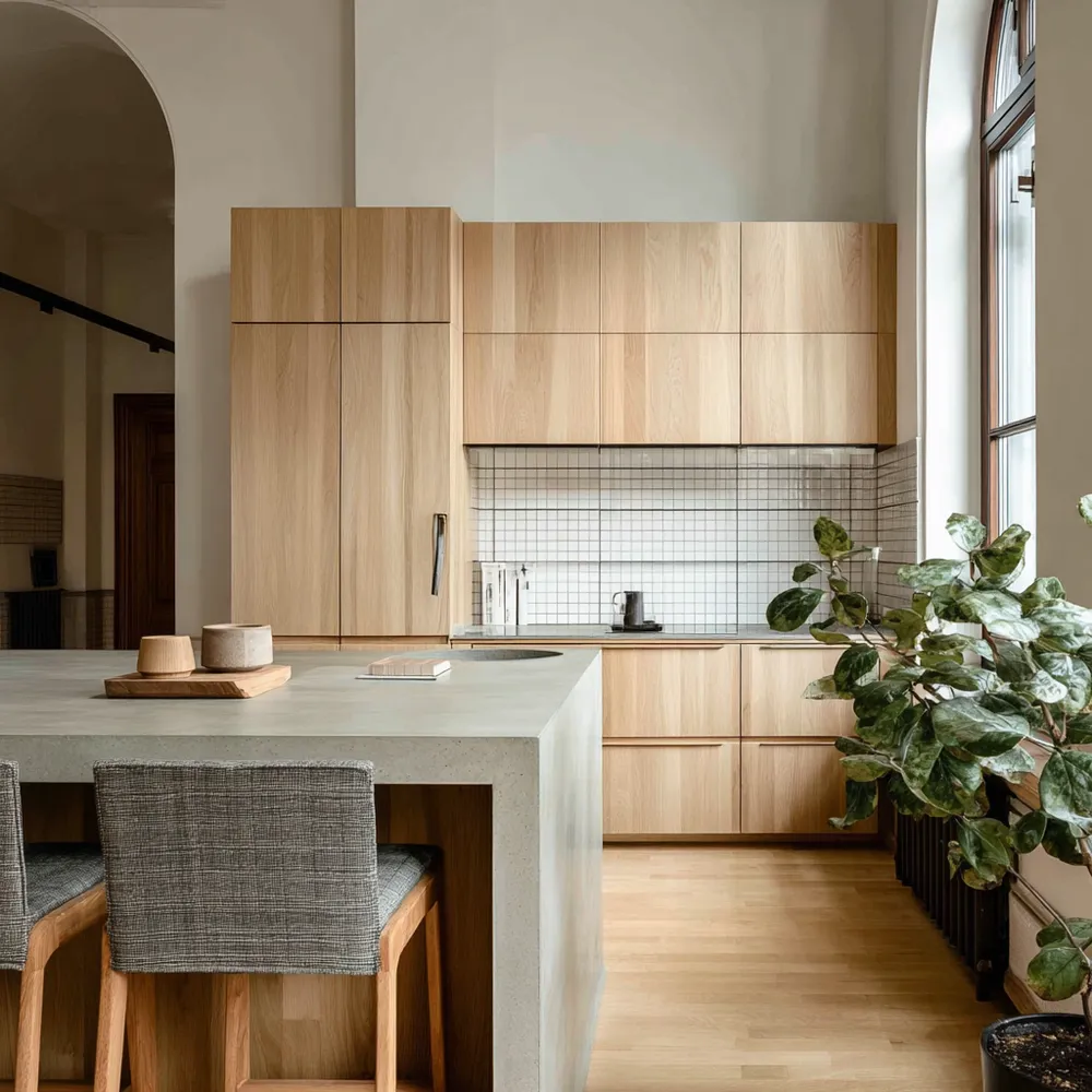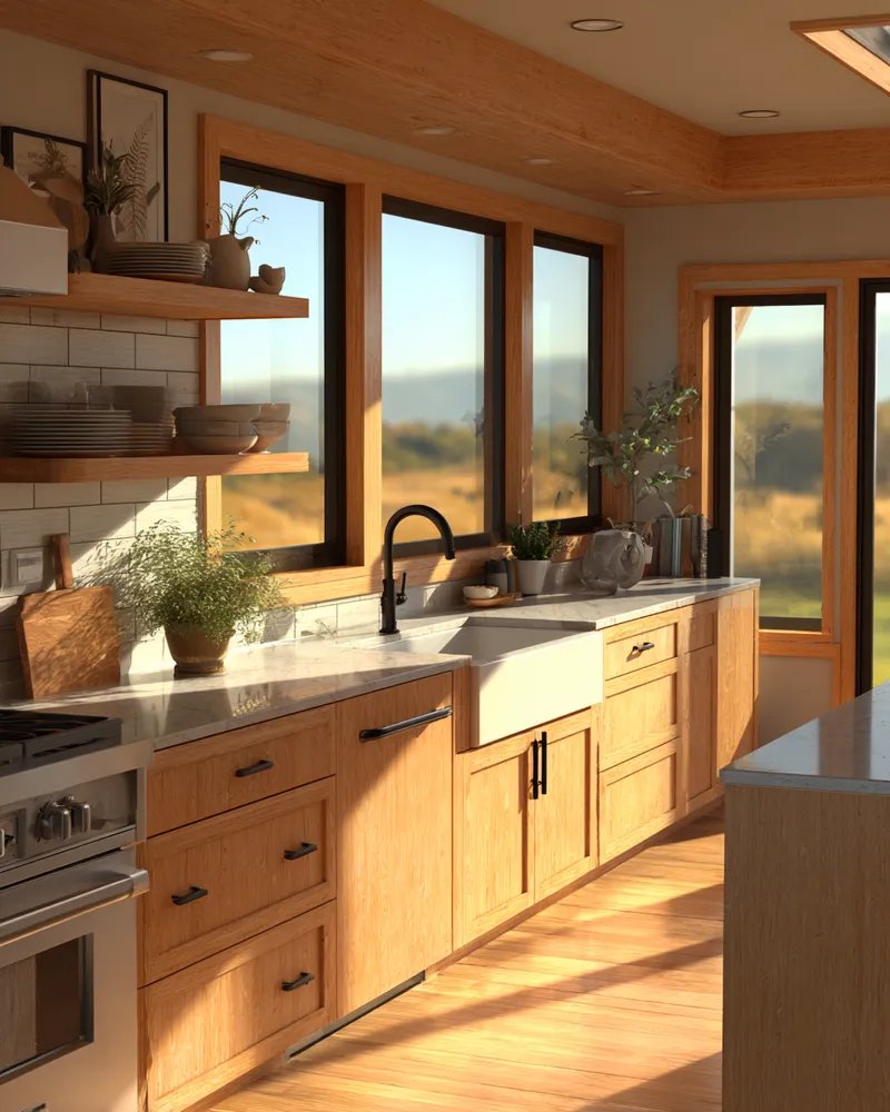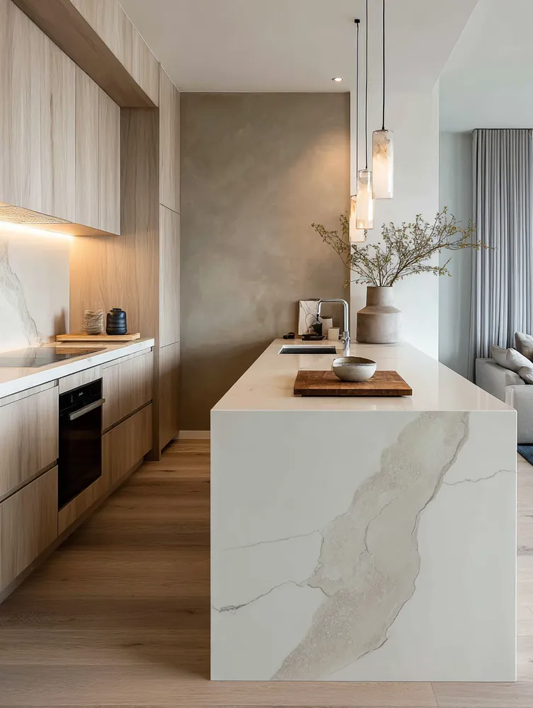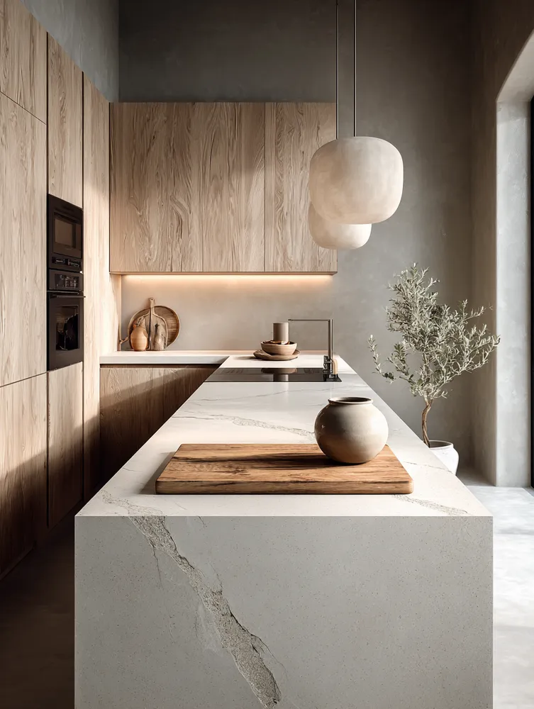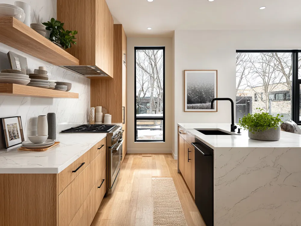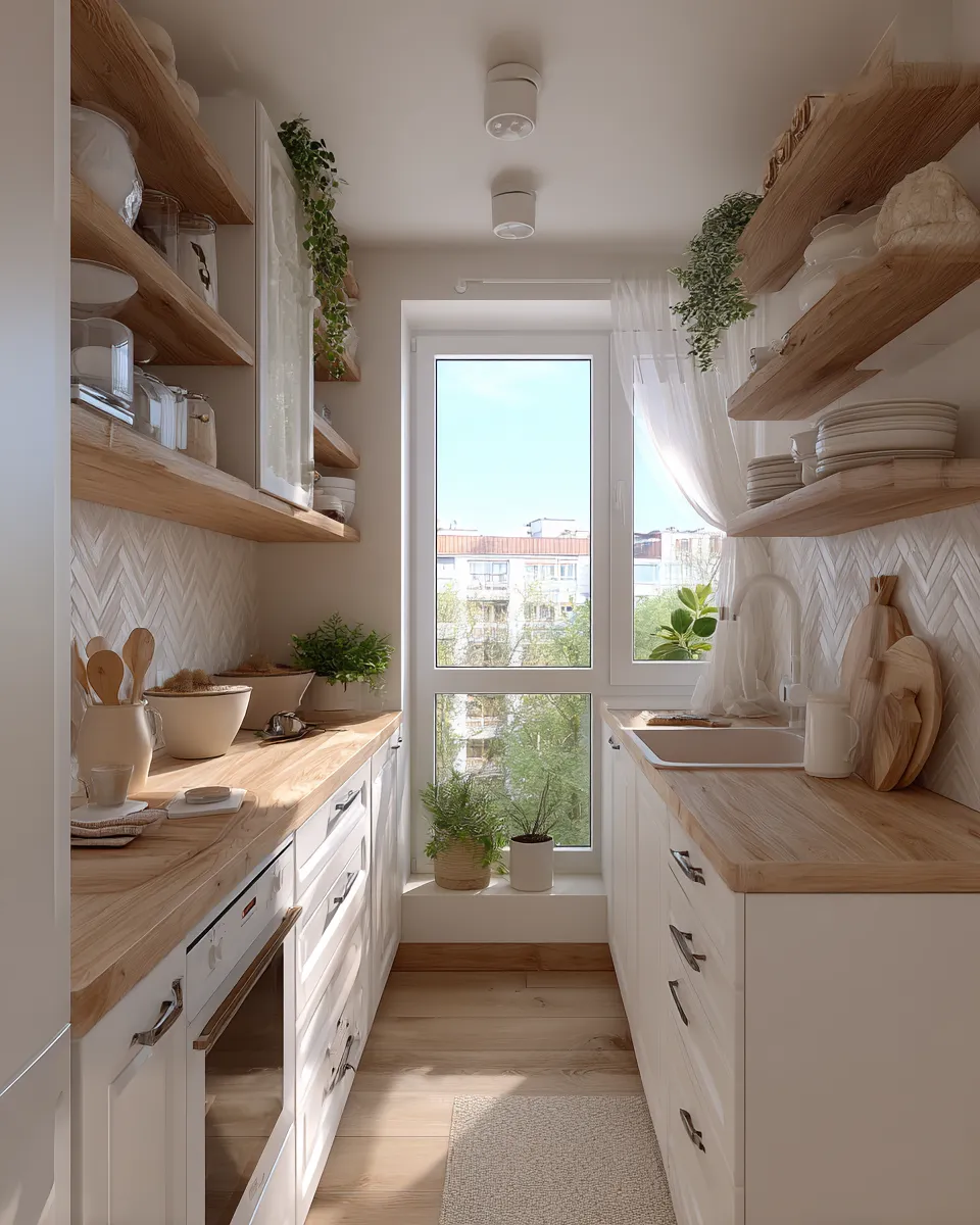* **Natural Wood Elements:** Integrate light wood countertops or open shelving.
