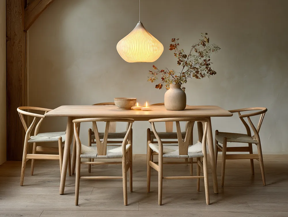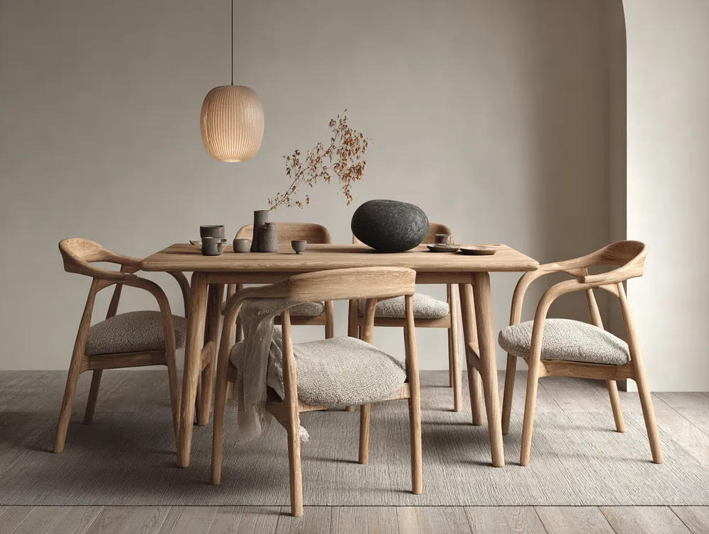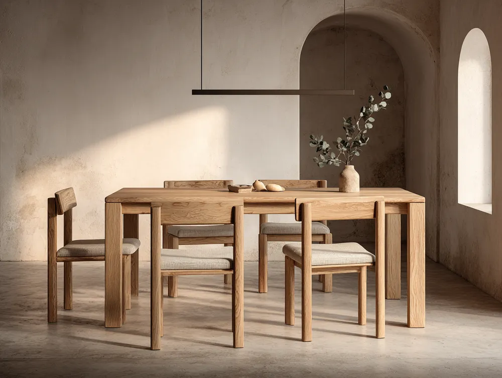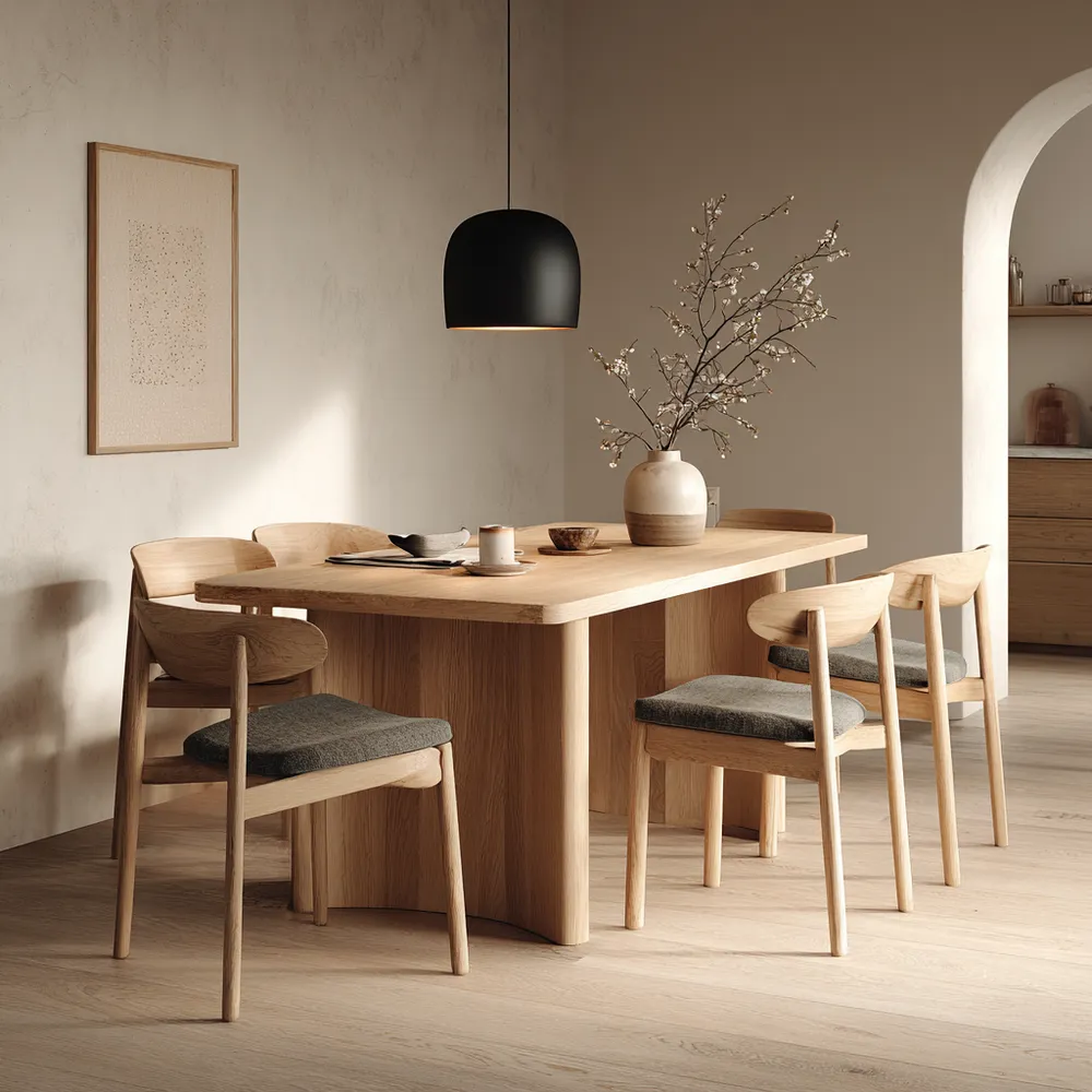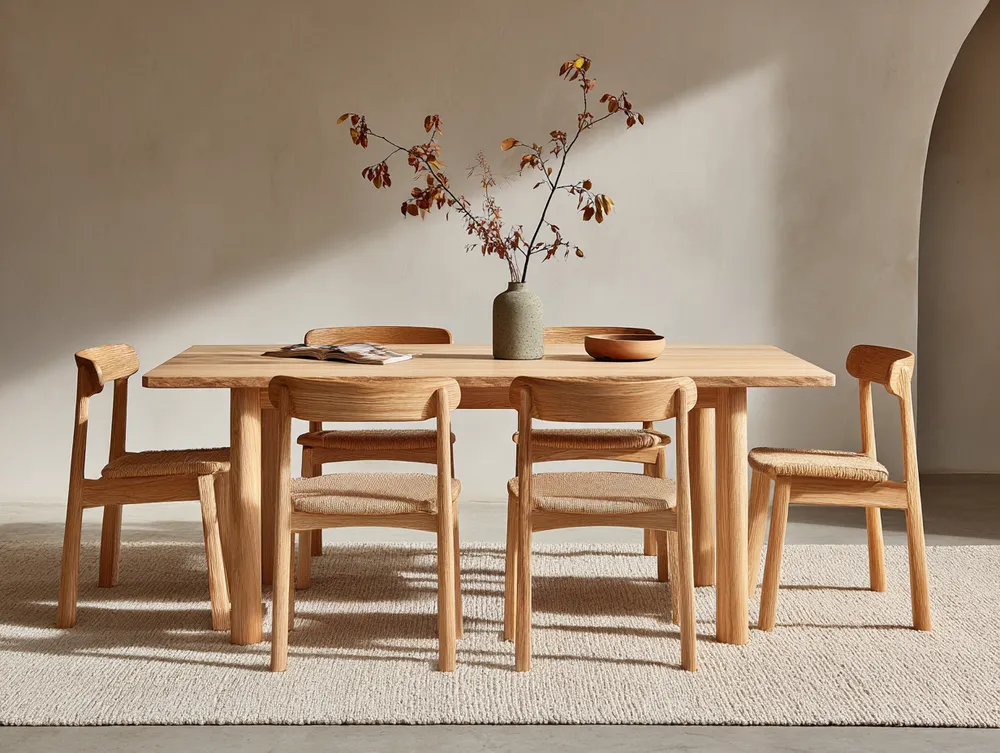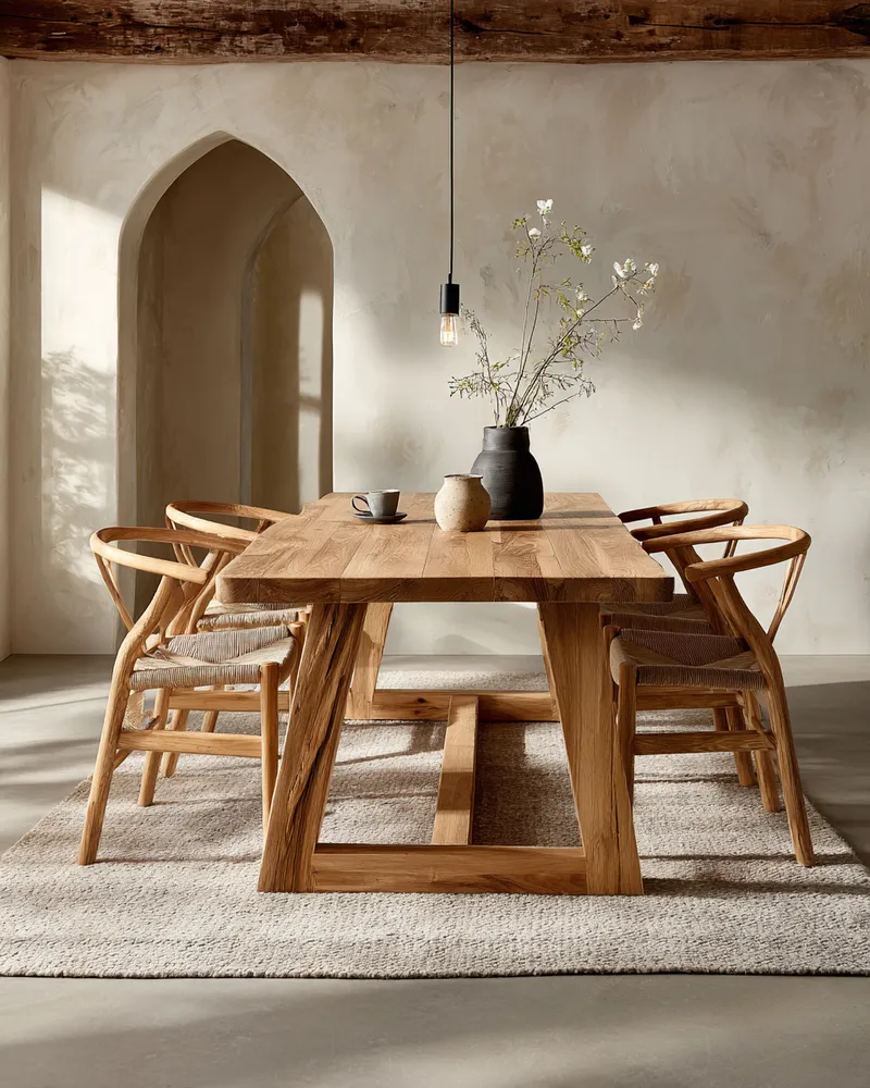 • **Natural Wood Dining Table:** Simple, sturdy, and timeless.