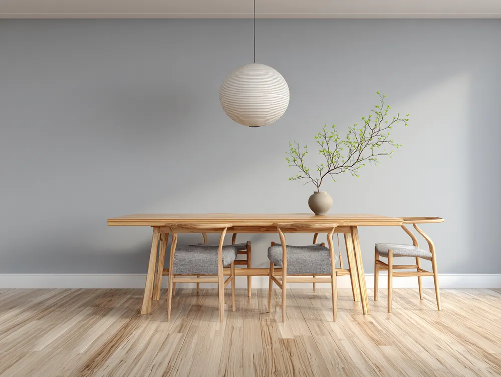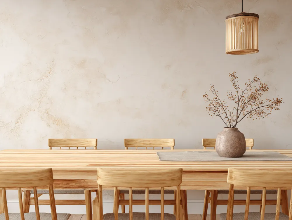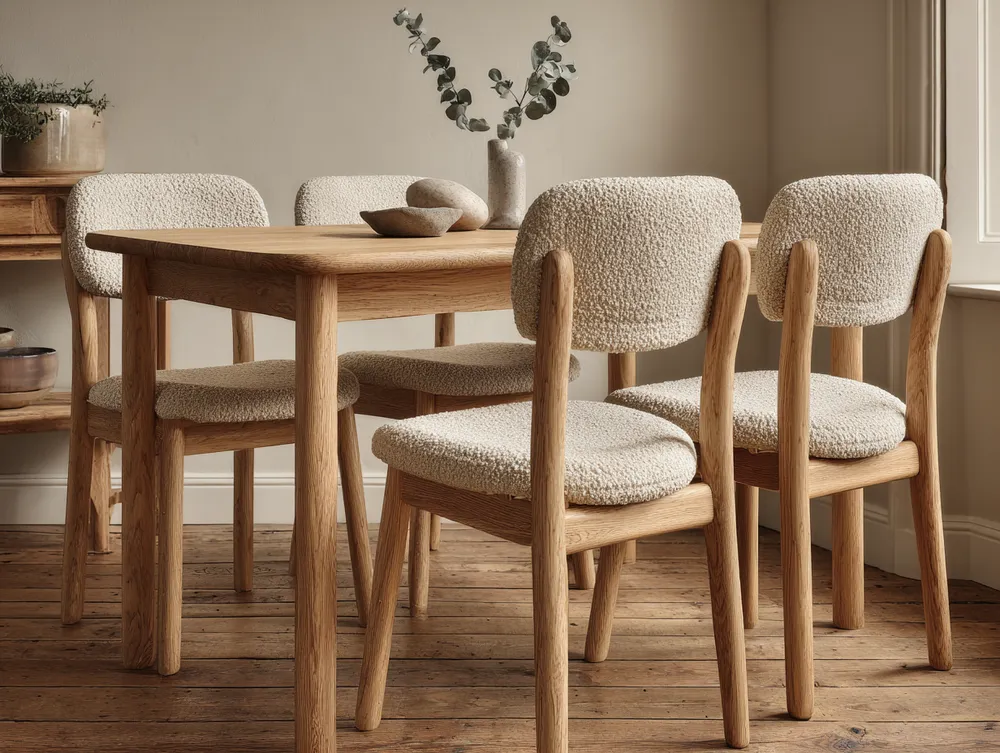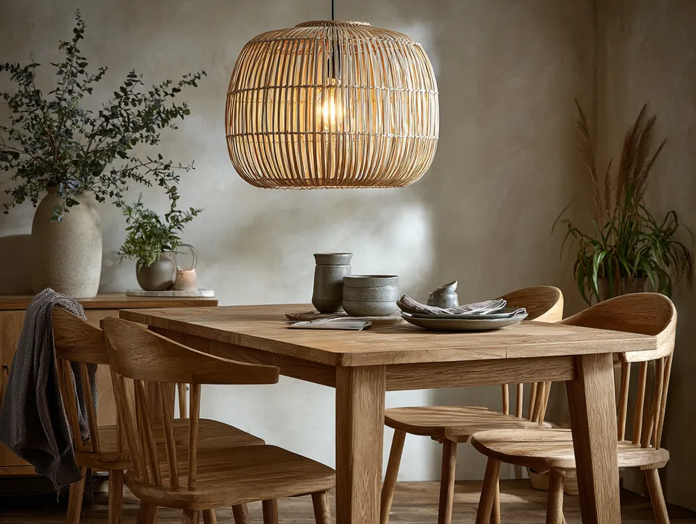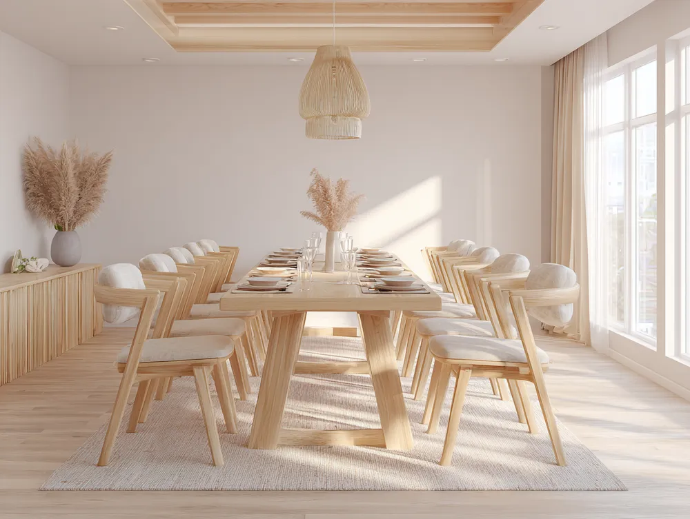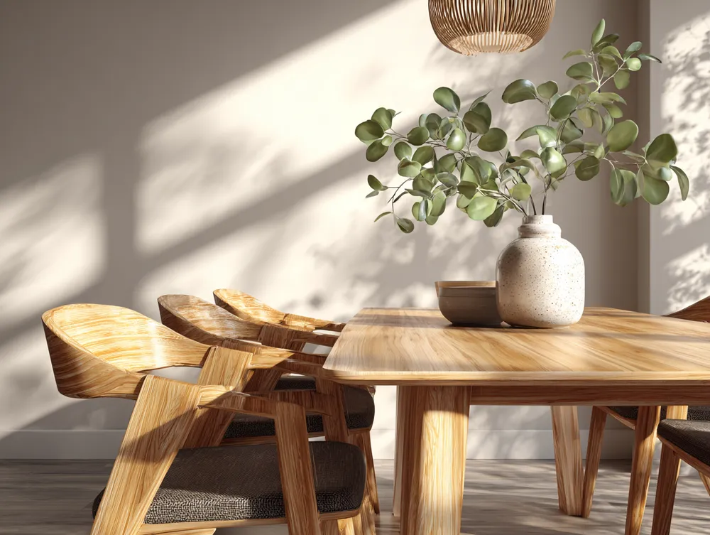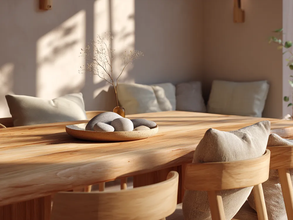 • **Natural Wood Dining Table:** Simple, sturdy, and timeless.